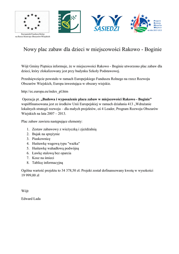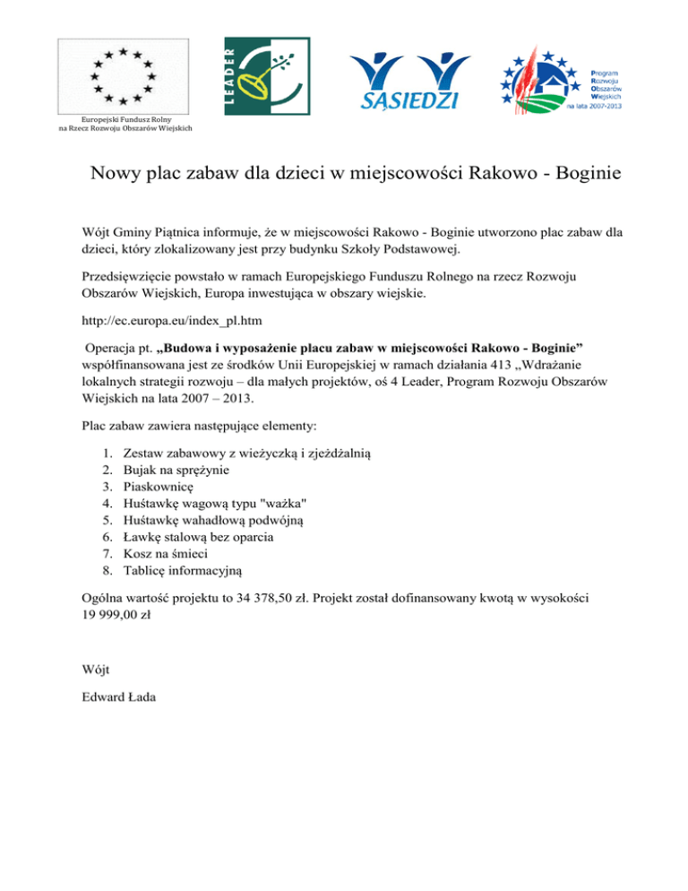 Europejski Fundusz Rolny na Rzecz Rozwoju Obszarów Wiejskich Nowy plac zabaw dla dzieci w miejscowości Rakowo - Boginie Wójt Gminy Piątnica informuje, że w miejscowości Rakowo - Boginie utworzono plac zabaw dla dzieci, który zlokalizowany jest przy budynku Szkoły Podstawowej. Przedsięwzięcie powstało w ramach Europejskiego Funduszu Rolnego na rzecz Rozwoju Obszarów Wiejskich, Europa inwestująca w obszary wiejskie. http://ec.europa.eu/index_pl.htm Operacja pt. „Budowa i wyposażenie placu zabaw w miejscowości Rakowo - Boginie” współfinansowana jest ze środków Unii Europejskiej w ramach działania 413 „Wdrażanie lokalnych strategii rozwoju – dla małych projektów, oś 4 Leader, Program Rozwoju Obszarów Wiejskich na lata 2007 – 2013. Plac zabaw zawiera następujące elementy: 1. 2. 3. 4. 5. 6. 7. 8. Zestaw zabawowy z wieżyczką i zjeżdżalnią Bujak na sprężynie Piaskownicę Huśtawkę wagową typu "ważka" Huśtawkę wahadłową podwójną Ławkę stalową bez oparcia Kosz na śmieci Tablicę informacyjną Ogólna wartość projektu to 34 378,50 zł. Projekt został dofinansowany kwotą w wysokości 19 999,00 zł Wójt Edward Łada