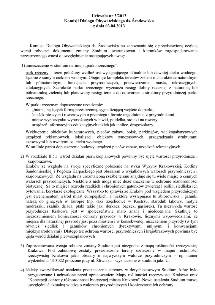 Uchwała nr 3/2013 Komisji Dialogu Obywatelskiego ds. Środowiska z dnia 03.04.2013 Komisja Dialogu Obywatelskiego ds. Środowiska po zapoznaniu się z przedstawioną częścią wersji roboczej dokumentu zmiany Studium uwarunkowań i kierunków zagospodarowania przestrzennego wnosi o uwzględnienie następujących uwag: 1) umieszczenie w studium definicji „parku rzecznego”: park rzeczny – teren połoŜony wzdłuŜ osi występującego aktualnie lub dawniej cieku wodnego, łącznie z samym ciekiem wodnym. Obejmuje kompleks terenów zieleni o charakterze naturalnym lub półnaturalnym, funkcjach: przyrodniczych, przewietrzania miasta, rekreacyjnych, edukacyjnych. Szerokość parku rzecznego wyznacza zasięg doliny rzecznej z naturalną lub półnaturalną zielenią lub planowany zasięg terenu do odtworzenia struktury przyrodniczej parku rzecznego. W parku rzecznym dopuszczone urządzenie: - „bram", będących formą przestrzenną, sygnalizującą wejście do parku, - ścieŜek pieszych i rowerowych o przebiegu i formie uzgodnionej z przyrodnikami, - miejsc wypoczynku wyposaŜonych w ławki, poidełka, stojaki na rowery, - urządzeń informacyjno-edukacyjnych takich jak tablice, drogowskazy. Wykluczenie obiektów kubaturowych, placów zabaw, boisk, parkingów, wielkogabarytowych urządzeń reklamowych, lokalizacji obiektów tymczasowych, przegradzania strukturami czasowymi lub trwałymi osi cieku wodnego. W otulinie parku dopuszczenie budowy urządzeń placów zabaw, urządzeń rekreacyjnych. 2) W rozdziale II.5.1 wśród działań pierwszoplanowych powinny być ujęte wartości przyrodnicze i krajobrazowe. Kraków ze względu na swoje specyficzne połoŜenie na styku WyŜyny Krakowskiej, Kotliny Sandomierskiej i Pogórza Karpackiego jest obszarem o wyjątkowych walorach przyrodniczych i krajobrazowych. Ze względu na urozmaiconą rzeźbę terenu znajduje się tu wiele miejsc o cennych walorach przyrodniczych. Niektóre z nich mogą mieć duŜe znaczenie w ochronie róŜnorodności biotycznej. Są to miejsca rozrodu rzadkich i chronionych gatunków zwierząt i roślin, siedliska ich bytowania, korytarze ekologiczne. Wszystko to sprawia Ŝe Kraków pod względem przyrodniczym jest ewenementem wśród miast europejskich, a niektóre występujące tu zbiorowiska i gatunki naleŜą do ginących w Europie (np. łąki trzęślicowe w Kostrzu, starodub łąkowy, motyle modraszki, skalnik driada, ptaki takie jak: derkacz, bączek, gąsiorek). Ta niezwykła wartość przyrodnicza Krakowa jest w społeczeństwie mało znana i niedoceniana. Skutkuje to niezrozumieniem konieczności ochrony przyrody w Krakowie, licznymi wypowiedziami, Ŝe miejsce dla naturalnej przyrody jest poza miastem i w konsekwencji niszczeniem przyrody (w tym równieŜ siedlisk i gatunków chronionych dyrektywami unijnymi i konwencjami międzynarodowymi). Dlatego teŜ ochrona wartości przyrodniczych i krajobrazowych powinna być ujęta wśród działań pierwszoplanowych 3) Zaprezentowana wersja robocza zmiany Studium jest niezgodna z mapą roślinności rzeczywistej Krakowa. Pod zabudowę zostały przeznaczone tereny oznaczone w mapie roślinności rzeczywistej Krakowa jako obszary o najwyŜszym walorze przyrodniczym – np numer wydzielenia 43-3022 połoŜone przy ul. Śliwiaka - wyznaczone w studium jako U. 4) NaleŜy zweryfikować ustalenia przeznaczenia terenów w dotychczasowym Studium, które było przygotowane i uchwalone przed opracowaniem Mapy roślinności rzeczywistej Krakowa oraz "Koncepcji ochrony róŜnorodności biotycznej miasta Krakowa". Nowe ustalenia Studium muszą uwzględniać aktualną wiedzę o walorach przyrodniczych i konieczność ich ochrony. 5) W rozdziale II.5.4 wśród obszarów proponowanych do objęcia ochroną brak: łąk w Kostrzu, łąk w Pastwiskach, Szerokich Łąk - obszary te są opisane jako cenne przyrodniczo i proponowane do objęcia ochrona w "Koncepcji ochrony róŜnorodności biotycznej miasta Krakowa" ( Instytut Nauk o Środowisku UJ, Kraków 2005) (wersja internetowa dostępna na http://www.eko.uj.edu.pl/przyrodakrakowa/koncept.htm) W rozdziale II.5.4 wśród obszarów proponowanych do objęcia ochroną znajduje się „Las łęgowy w Przegorzałach” przez teren którego planuje się jednocześnie poprowadzenie trasy komunikacyjnej. NaleŜy wykluczyć poprowadzenie trasy komunikacyjnej przez teren lasu łęgowego. 6) Wśród innych obszarów cenne przyrodniczo, na których występują chronione gatunki roślin i zwierząt wymienione są oczka wodne w RŜące, jednocześnie teren wokół jest przeznaczony w studium pod zabudowę. Nie moŜna chronić stawów i gatunków zwierząt przy dopuszczeniu budowy tuŜ obok osiedla. Stawy zostaną zamienione w przyblokowe sadzawki, pozbawione jakichkolwiek walorów przyrodniczych ze względu na przerwanie korytarzy ekologicznych, zagroŜenia dla przyrody stawu związane z zamieszkaniem w jego bezpośrednim sąsiedztwie kilku tysięcy ludzi oraz ich zwierząt (psów, kotów). Jest to jednocześnie obszar źródliskowy potoku BieŜanowskiego. Wykonanie wykopów fundamentów osiedla spowoduje zmianę stosunków wodnych co moŜe mieć wpływ na stan wód Potoku BieŜanowskiego oraz stawu. Teren w "Koncepcji ochrony róŜnorodności biotycznej miasta Krakowa" (wersja internetowa dostępna na http://www.eko.uj.edu.pl/przyrodakrakowa/koncept.htm) na str 128, 129 Instytut Nauk o Środowisku UJ proponuje objęcie terenu ochroną w postaci uŜytku ekologicznego. 7) Uzupełnienie mapy terenów cennych przyrodniczo i korytarzy ekologicznych zgodnie z mapą autorstwa dr. Kazimierza Walasza (zał. nr 1) 8) Wykorzystanie w pracach nad zmianą Studium mapy zbiorników i cieków wodnych autorstwa dr. Kazimierza Walasza (zał. nr 2). NaleŜy przeprowadzić rzetelną inwentaryzację szczególnie małych, ginących cieków, nawet tych okresowych stanowiących sumarycznie cenne źródło zasilania w wodę całego systemu hydrologicznego Krakowa. Brak rze