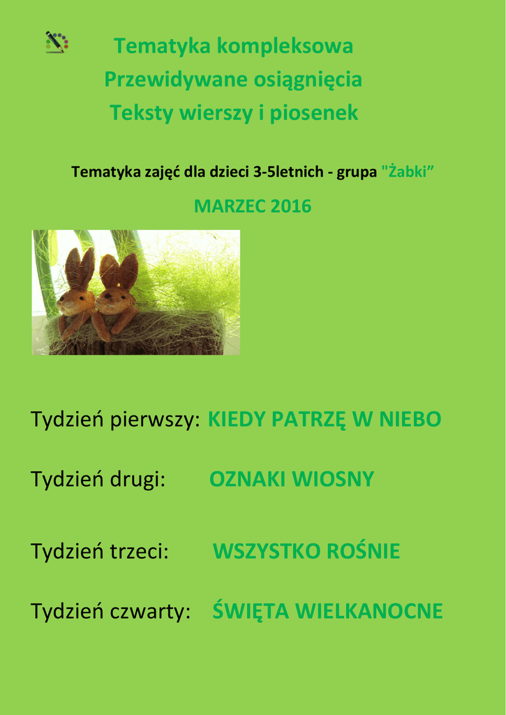 Tematyka kompleksowa Przewidywane osiągnięcia Teksty wierszy i piosenek Tematyka zajęć dla dzieci 3-5letnich - grupa "Żabki” MARZEC 2016 Tydzień pierwszy: KIEDY PATRZĘ W NIEBO Tydzień drugi: OZNAKI WIOSNY Tydzień trzeci: WSZYSTKO ROŚNIE Tydzień czwarty: ŚWIĘTA WIELKANOCNE Przewidywane osiągnięcia dziecka 3-letniego: dostrzega zmiany zachodzące w przyrodzie w okresie przedwiośnia, poznaje zwyczaje związane z Wielkanocą, doskonali umiejętność formułowania dłuższych wypowiedzi, poznaje kwiaty kwitnące w okresie wczesnej wiosny, rozumie konieczność dostosowania ubrania do temperatury, porównuje liczebność zbiorów poprzez dobieranie elementów w pary, rozwija umiejętność posługiwania się nożyczkami, stara się prawidłowo trzymać kredkę, posługuje się nazwami kolorów podstawowych, śpiewa piosenki, uczestniczy w zabawach ze śpiewem, przy muzyce, wykonuje ćwiczenia wzmacniające siłę mięśni rąk i nóg, doskonali umiejętność prawidłowego mycia zębów. Przewidywane osiągnięcia dziecka 4-letniego: dostrzega zmiany zachodzące w przyrodzie w okresie przedwiośnia, poznaje pierwsze wiosenne kwiaty, zna ptaki przylatujące wiosną: bociek, jaskółka, skowronek, posługuje się nazwami przyrodniczymi, np.: pąki, bazie, pierwiosnek, przebiśnieg, itp. zna tradycje związane z Wielkanocą, orientuje się w schemacie własnego ciała, posługuje się nazwami liczebników głównych i porządkowych, liczy w dostępnym zakresie, poszerza zakres liczenia, rozróżnia dźwięk wybranych instrumentów perkusyjnych i potrafi na nich zgrać proste zadania rytmiczne, zna i śpiewa piosenki o tematyce wiosennej, doskonali umiejętność posługiwania się nożyczkami, sprawnie wykonuje zadania ruchowe przestrzega ustalonych zasad bezpieczeństwa. Przewidywane osiągnięcia dziecka 5-letniego: nazywa planety w Układzie Słonecznym, określa cechy pogody w okresie przedwiośnia, wymienia oznaki wiosny, wymienia, co jest potrzebne do wzrostu roślin, nazywa i wskazuje na obrazku niektóre ptaki przylatujące wiosną, buduje dłuższą wypowiedź, rozwija analizę i syntezę wyrazu, wyróżnia głoski w nagłosie i w wygłosie, wskazuje elementy charakterystyczne dla świąt Wielkanocnych, opowiada o wyglądzie stołu wielkanocnego, posługuje się nazwami pór roku, dni tygodnia, miesięcy, posługuje się liczebnikami porządkowymi, tworzy kalendarz pogody, podejmuje próby rozwiązywania prostych zadań z treścią, doskonali koordynację ruchowo – słuchową podczas zabaw, śpiewa przedszkolne piosenki, aktywnie uczestniczy w zabawach ruchowych i ćwiczeniach gimnastycznych, bezpiecznie bawi się na placu przedszkolnym z wykorzystaniem sprzętu terenowego, posługuje się liczbami 1-7 do określania liczebności zbiorów. bawi się w domino głoskowe; wyróżnia głoski: r, c w nagłosie i w wygłosie. UCZYMY SIĘ PIOSENKI: „LOT KOSMICZNY” 1. Kosmos jest zagadką, Więc nie lada gratką Będziesz lecieć tam. Wsiadam do rakiety Szybszej niż kometyJuż przygodę mam. Ref.: Lot kosmiczny, lot kosmiczny, Marzy o nim każdy z nas. Ponad dźwiękiem, ponad światłem Tajemniczych szukam tras. Lot kosmiczny, lot kosmiczny, czy w kosmosie mieszka ktoś. I na pewno się ucieszy, że przybywa z Ziemi gość. 2. Pędzi hen rakiet, Bo w kosmosie czeka Mnóstwo ważnych spraw. Planet się postaram, odkryć co niemiara i tysiące gwiazd. UCZYMY SIĘ PIOSENKI: sł. Agnieszka Galica "MARCOWE ŻABY" 1. Już wiosna na polach sadzi krokusy, zając siedzi pod sosną, marzną mu uszy. Ref.: A żaby rechu-rech,żaby się cieszą, że ten marzec rechu-rech wszystko pomieszał. Raz słońce, a raz deszcz, idzie wiosna a tu śnieg. Bo w marcu jak w garncu rechu-rech żabi śmiech. 2. A deszczem umyte drzewa są czyste, na gałązkach już rosną kotki puszyste. Ref.: A żaby ..... 3. Na łące bociany głośno klekocą. Rankiem słońce przygrzewa, mróz mrozi nocą. Ref.: A żaby ...... UCZYMY SIĘ WIERSZA: „SĄ TAKIE ŚWIĘTA” Są takie święta raz do roku, Co budzą życie, budzą czas. Wszystko rozkwita w słońca blasku I wielka miłość rośnie w nas. Miłość do ludzi, do przyrody, W zielone każdy z wiosną gra. Już zima poszła spać za morza, A w naszych sercach radość trwa. UCZYMY SIĘ PIOSENKI: „WIELKANOCNE ZAJĄCZKI“ 1.My jesteśmy zającami, Zającami, raz ,dwa, trzy. I chodzimy z koszyczkami, Raz ,dwa ,raz, dwa ,trzy Ref. W każdym koszu , kolorowym Słodycze trzymamy I grzeczniutkim , miłym dzieciom Wszystkie je rozdamy . 2.Bo są święta Wielkanocne, Wielkanocne raz, dwa trzy Kosze z nami są na łące Raz, dwa, raz, dwa, trzy. Ref. W każdym koszu , kolorowym Słodycze trzymamy I grzeczniutkim , miłym dzieciom Wszystkie je rozdamy