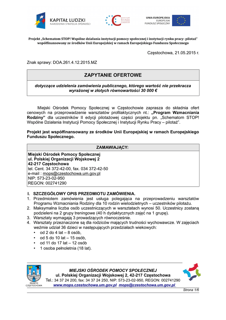 Projekt „Schematom STOP! Wspólne działania instytucji pomocy społecznej i instytucji rynku pracy- pilotaż” współfinansowany ze środków Unii Europejskiej w ramach Europejskiego Funduszu Społecznego Częstochowa, 21.05.2015 r. Znak sprawy: DOA.261.4.12.2015.MZ ZAPYTANIE OFERTOWE dotyczące udzielenia zamówienia publicznego, którego wartość nie przekracza wyrażonej w złotych równowartości 30 000 € Miejski Ośrodek Pomocy Społecznej w Częstochowie zaprasza do składnia ofert cenowych na przeprowadzenie warsztatów profilaktycznych nt.: „Program Wzmacniania Rodziny” dla uczestników II edycji pilotażowej części projektu pn. „Schematom STOP! Wspólne Działania Instytucji Pomocy Społecznej i Instytucji Rynku Pracy – pilotaż”. Projekt jest współfinansowany ze środków Unii Europejskiej w ramach Europejskiego Funduszu Społecznego. ZAMAWIAJĄCY: Miejski Ośrodek Pomocy Społecznej ul. Polskiej Organizacji Wojskowej 2 42-217 Częstochowa tel. Cent. 34 372-42-00, fax. 034 372-42-50 e-mail : [email protected] NIP: 573-23-02-950 REGON: 002741290 I. SZCZEGÓŁOWY OPIS PRZEDMIOTU ZAMÓWIENIA. 1. Przedmiotem zamówienia jest usługa polegająca na przeprowadzeniu warsztatów Programu Wzmacniania Rodziny dla 10 rodzin wielodzietnych – uczestników pilotażu. 2. Maksymalna liczba osób uczestniczących w warsztatach wynosi 50. Uczestnicy zostaną podzieleni na 2 grupy treningowe (40 h dydaktycznych zajęć na 1 grupę). 3. Warsztaty wymagają 3 prowadzących równocześnie. 4. Warsztaty przeznaczone są dla rodziców mających trudności wychowawcze. W zajęciach weźmie udział 36 dzieci w następujących przedziałach wiekowych: • od 2 do 4 lat – 8 osób, • od 5 do 10 lat – 15 osób, • od 11 do 17 lat – 12 osób • 1 osoba pełnoletnia (18 lat). MIEJSKI OŚRODEK POMOCY SPOŁECZNEJ ul. Polskiej Organizacji Wojskowej 2, 42-217 Częstochowa Tel.: 34 37 24 200, fax: 34 37 24 250, NIP: 573-23-02-950, REGON: 002741290 www.mops.czestochowa.um.gov.pl [email protected] Strona 1/6 Projekt „Schematom STOP! Wspólne działania instytucji pomocy społecznej i instytucji rynku pracy- pilotaż” współfinansowany ze środków Unii Europejskiej w ramach Europejskiego Funduszu Społecznego 5. Zajęcia jednocześnie odbywać się będą odrębnie z grupą rodziców (ok. 2 h) i z grupą dzieci (ok. 2 h). Część zajęć (ok. 2 h) to czas spędzony wspólnie przez rodziców i dzieci na sesji rodzinnej. Każdy z prowadzących będzie pracował łącznie 4 h podczas jednego spotkania. W każdej sesji wspólnej dla obu grup przeważać powinny zajęcia zachęcające do współdziałania i pozytywnej rywalizacji. Ich treści powinny koncentrować się wokół umiejętności wychowawczych i interpersonalnych przy wykorzystywaniu aktywnych metod, tj. odgrywanie scenek, dyskusje, angażowanie rodzin we wspólne gry i zabawy edukacyjne, itp. 6. Program warsztatów powinien obejmować następujące zagadnienia: 1) wzmocnienie więzi rodzinnych i poprawa komunikacji między członkami rodziny, 2) nawiązanie głębszych i cieplejszych relacji z dziećmi, 3) wspieranie rodziców w radzeniu sobie w codziennych kontaktach z dziećmi, 4) podniesienie poziomu umiejętności wychowawczych rodziców w zakresie okazywania miłości, bycia konsekwentnym i umiejętności stawiania granic, 5) doskonalenie umiejętności życiowych dzieci poprzez: a) wyznaczanie celów i sposobów ich osiągania, b) radzenia sobie ze stresem oraz brakiem asertywności, c) doskonalenie empatii wobec rodziców i innych członków rodziny, 6) zdobycie umiejętności rozmawiania na trudne tematy, 7) dodatkowo: a) dla rodziców: • zrozumienie znaczenia rodzicielskiej miłości i stawiania granic w wychowaniu dziecka, • zdobycie umiejętności wspierania celów i marzeń dziecka, • zrozumienie zmian zachodzących w dziecku i znaczenie konsekwencji w egzekwowaniu przyjętych zasad domowych, • wypracowanie umiejętności dostrzegania dobrych stron dziecka i wyrażania pochwał służących budowaniu pozytywnej relacji, • trening spokojnego reagowania na zachowanie dziecka, • zrozumienie uważnego słuchania dziecka, • nabycie umiejętności chronienia dziecka przed sięganiem po używki, • dostrzeżenie wyjątkowych potrzeb rodziny, budowanie systemu wsparcia. b) dla dzieci: • nawiązanie nowych znajomości, przyjaźni, • rozpoznanie celów dotyczących przyszłości, • zrozumienie trudnej roli bycia rodzicem, dostrzeżenie wysiłków rodzica, jego potrzeb i marzeń, • nabycie umiejętności radzenia sobie ze stresem w zdrowy sposób, • doskonalenie umiejętności radzenia sobie z presją rówieśniczą, • rozwinięcie umiejętności pomagania innym. MIEJSKI OŚRODEK POMOCY SPOŁECZNEJ ul. Polskiej Organizacji Wojskowej 2, 42-217 Częstochowa Tel.: 34 37 24 200, fax: 34 37 24 250, NIP: 573-23-02-950, REGON: 002741290 www.mops.czestochowa.um.gov.pl [email protected] Strona 2/6 Projekt „Schematom STOP! Wspólne działania instytucji pomocy społecznej i instytucji rynku pracy- pilotaż” współfinansowany ze środków Unii Europejskiej w ramach Europejskiego Funduszu Społecznego 7. Zamawiający oczekuje od Wykonawcy, przed rozpoczęciem warsztatów, przedstawienia propozycji programu opartego o zagadnienia wymienione w opisie przedmiotu zamówienia wraz z propozycją czasu przeznaczonego na poszczególne bloki tematyczne. Wykonawca powinien kierować się swoim doświadczeniem w doborze metod szkolenia. Program musi uzyskać akceptację Koordynatora pilotażu. 8. Miejscem wykonania zamówienia jest teren Miasta Częstochowy. 9. Wykonawca zobowiązany jest zapewnić pomieszczenie składające się z dwóch sal, w których zajęcia dla dzieci i rodziców będą mogły odbywać się oddzielnie. Ponadto lokal, w którym będą przeprowadzane zajęcia powinien być przestronny i przewiewny, posiadać dostęp do pomieszczeń sanitarnych oraz spełniać wymogi bezpieczeństwa i higi