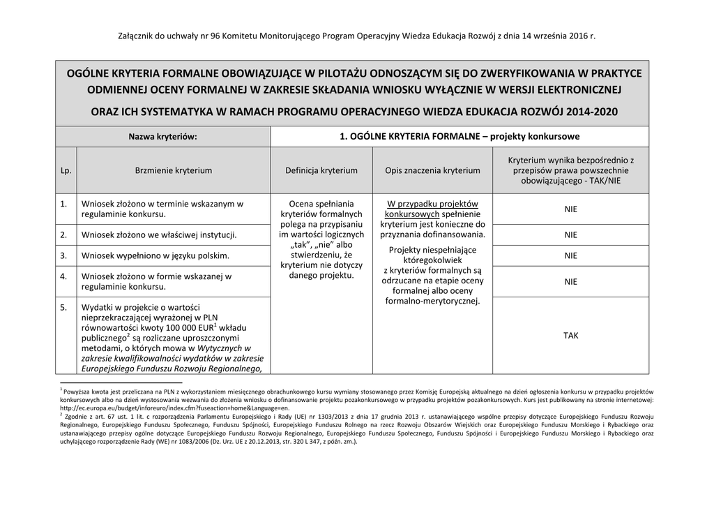 Załącznik do uchwały nr 96 Komitetu Monitorującego Program Operacyjny Wiedza Edukacja Rozwój z dnia 14 września 2016 r. OGÓLNE KRYTERIA FORMALNE OBOWIĄZUJĄCE W PILOTAŻU ODNOSZĄCYM SIĘ DO ZWERYFIKOWANIA W PRAKTYCE ODMIENNEJ OCENY FORMALNEJ W ZAKRESIE SKŁADANIA WNIOSKU WYŁĄCZNIE W WERSJI ELEKTRONICZNEJ ORAZ ICH SYSTEMATYKA W RAMACH PROGRAMU OPERACYJNEGO WIEDZA EDUKACJA ROZWÓJ 2014-2020 Nazwa kryteriów: Lp. Brzmienie kryterium 1. Wniosek złożono w terminie wskazanym w regulaminie konkursu. 2. Wniosek złożono we właściwej instytucji. 3. Wniosek wypełniono w języku polskim. 4. Wniosek złożono w formie wskazanej w regulaminie konkursu. 5. Wydatki w projekcie o wartości nieprzekraczającej wyrażonej w PLN równowartości kwoty 100 000 EUR1 wkładu publicznego2 są rozliczane uproszczonymi metodami, o których mowa w Wytycznych w zakresie kwalifikowalności wydatków w zakresie Europejskiego Funduszu Rozwoju Regionalnego, 1 1. OGÓLNE KRYTERIA FORMALNE – projekty konkursowe Definicja kryterium Opis znaczenia kryterium Ocena spełniania kryteriów formalnych polega na przypisaniu im wartości logicznych „tak”, „nie” albo stwierdzeniu, że kryterium nie dotyczy danego projektu. W przypadku projektów konkursowych spełnienie kryterium jest konieczne do przyznania dofinansowania. Projekty niespełniające któregokolwiek z kryteriów formalnych są odrzucane na etapie oceny formalnej albo oceny formalno-merytorycznej. Kryterium wynika bezpośrednio z przepisów prawa powszechnie obowiązującego - TAK/NIE NIE NIE NIE NIE TAK Powyższa kwota jest przeliczana na PLN z wykorzystaniem miesięcznego obrachunkowego kursu wymiany stosowanego przez Komisję Europejską aktualnego na dzień ogłoszenia konkursu w przypadku projektów konkursowych albo na dzień wystosowania wezwania do złożenia wniosku o dofinansowanie projektu pozakonkursowego w przypadku projektów pozakonkursowych. Kurs jest publikowany na stronie internetowej: http://ec.europa.eu/budget/inforeuro/index.cfm?fuseaction=home&Language=en. 2 Zgodnie z art. 67 ust. 1 lit. c rozporządzenia Parlamentu Europejskiego i Rady (UE) nr 1303/2013 z dnia 17 grudnia 2013 r. ustanawiającego wspólne przepisy dotyczące Europejskiego Funduszu Rozwoju Regionalnego, Europejskiego Funduszu Społecznego, Funduszu Spójności, Europejskiego Funduszu Rolnego na rzecz Rozwoju Obszarów Wiejskich oraz Europejskiego Funduszu Morskiego i Rybackiego oraz ustanawiającego przepisy ogólne dotyczące Europejskiego Funduszu Rozwoju Regionalnego, Europejskiego Funduszu Społecznego, Funduszu Spójności i Europejskiego Funduszu Morskiego i Rybackiego oraz uchylającego rozporządzenie Rady (WE) nr 1083/2006 (Dz. Urz. UE z 20.12.2013, str. 320 L 347, z późn. zm.). Europejskiego Funduszu Społecznego oraz Funduszu Spójności na lata 2014-2020. 6. 7. 8. Wnioskodawca oraz partnerzy (o ile dotyczy) nie podlegają wykluczeniu z możliwości otrzymania dofinansowania, w tym wykluczeniu, o którym mowa w art. 207 ust. 4 ustawy z dnia 27 sierpnia 2009 r. o finansach publicznych. TAK Wnioskodawca zgodnie ze Szczegółowym Opisem Osi Priorytetowych PO WER jest podmiotem uprawnionym do ubiegania się o dofinansowanie w ramach właściwego Działania/Poddziałania PO WER. NIE W przypadku projektu partnerskiego spełnione zostały wymogi dotyczące 1) wyboru partnerów spoza sektora finansów publicznych, o których mowa w art. 33 ust. 2-4 ustawy z dnia 11 lipca 2014 r. o zasadach realizacji programów w zakresie polityki spójności finansowanych w perspektywie 2014-2020 (o ile dotyczy); 2) braku powiązań, o których mowa w art. 33 ust. 6 ustawy z dnia 11 lipca 2014 r. o zasadach realizacji programów w zakresie polityki spójności finansowanych w perspektywie 2014-2020 oraz w Szczegółowym Opisie Osi Priorytetowych PO WER, pomiędzy podmiotami tworzącymi partnerstwo oraz TAK 3) utworzenia albo zainicjowania partnerstwa w terminie zgodnym ze Szczegółowym Opisem Osi Priorytetowych PO WER tj. 2 przed złożeniem wniosku o dofinansowanie albo przed rozpoczęciem realizacji projektu, o ile data ta jest wcześniejsza od daty złożenia wniosku o dofinansowanie. 9. Wnioskodawca oraz partnerzy krajowi 3 (o ile dotyczy), ponoszący wydatki w danym projekcie z EFS, posiadają łączny obrót za ostatni zatwierdzony rok obrotowy zgodnie z ustawą z dnia 29 września 1994 r. (Dz. U. 1994 nr 121 poz. 591 z późń. zm.) (jeśli dotyczy) lub za ostatni zamknięty i zatwierdzony rok kalendarzowy równy lub wyższy od łącznych rocznych wydatków w ocenianym projekcie i innych projektach realizowanych w ramach EFS, których stroną umowy o dofinansowanie jest instytucja, w której dokonywana jest ocena formalna albo formalno-merytoryczna wniosku w roku kalendarzowym, w którym wydatki są najwyższe 4. NIE 3 W przypadku podmiotów niebędących jednostkami sektora finansów publicznych jako obroty należy rozumieć wartość przychodów (w tym przychodów osiągniętych z tytułu otrzymanego dofinansowania na realizację projektów) osiągniętych w ostatnim zatwierdzonym roku przez danego wnioskodawcę/ partnera (o ile dotyczy) na dzień składania wniosku o dofinansowanie. Kryterium nie dotyczy jednostek sektora finansów publicznych. W przypadku realizacji projektów w partnerstwie pomiędzy podmiotem niebędącym jednostką sektora finansów publicznych oraz jednostką sektora finansów publicznych porównywane są tylko te wydatki i obrót, które dotyczą podmiotu niebędącego jednostką sektora finansów publicznych. W przypadku projektów, w których udzielane jest wsparcie zwrotne w postaci pożyczek lub poręczeń jako obrót należy rozumieć kwotę kapitału pożyczkowego i poręczeniowego, jakim dysponowali wnioskodawca/ partnerzy (o ile dotyczy) w poprzednim zamkniętym i zatwierdzonym roku obrotowym. 4 W przypadku gdy projekt trwa dłużej niż jeden rok kalendarzowy należy wartość obrotów odnieść do roku realizacji projek