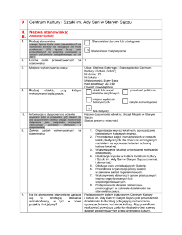9 Centrum Kultury i Sztuki im. Ady Sari w Starym Sączu II. Nazwa stanowiska: B. Animator kultury 1. Rodzaj stanowiska: Stanowisko biurowe lub obsługowe (uwaga: łączna liczba osób przewidzianych na stanowiska biurowe lub obsługowe nie może przekraczać 20% łącznej liczby osób przewidzianych na wszystkie stanowiska w ramach zatrudnienia subsydiowanego na rok 2011) 2. Liczba osób stanowisko: przewidywanych 3. Miejsce wykonywania pracy: 4. Rodzaj obiektu, przy wykonywane będą prace: na X Stanowisko merytoryczne 1 Ulica: Stefana Batorego ( Starosądeckie Centrum Kultury i Sztuki „Sokół”) Nr domu: 23 Nr lokalu: Miejscowość; Stary Sącz Kod pocztowy: 33-340 Powiat: nowosądecki obiekt lub zespół obiektów zabytkowych którym miejsce wydarzeń historycznych przestrzeń publiczna zabytki archeologiczne x 5. Informacje o dysponencie obiektu (wypełnić tylko w przypadku, gdy oferent nie jest dysponentem obiektu; uwaga: konieczność dołączenia jako załącznika umowy/listu intencyjnego pomiędzy oferentem a dysponentem) 6. Zakres zadań stanowisku: wykonywanych na 7. Na ile planowane stanowisko wpisuje się w strategię działania wnioskodawcy, w tym w nowe projekty i inicjatywy? Nie dotyczy Nazwa dysponenta obiektu: Urząd Miejski w Starym Sączu Status prawny: własność 1. Organizacja imprez lokalnych, sporządzanie kalendarium kolejnych imprez. 2. Prowadzenie zajęć instruktorskich w ramach kółek plastycznych dla dzieci ze szczególnym naciskiem na upowszechnianie i ochronę kultury lokalnej. 3. Wspomaganie lokalnej artystycznej twórczości amatorskiej. 4. Realizacja wystaw w Galerii Centrum Kultury i Sztuki im. Ady Sari w Starym Sączu (montaż i demontaż) 5. Obsługa osób zwiedzających Galerię. 6. Prawidłowa organizacja pracy Galerii w zakresie zadań regulaminowych. 7. Wykonywanie dekoracji i opraw plastycznych imprez organizowanych lub współorganizowanych. 8. Podejmowanie działań reklamowopromocyjnych w zakresie działalności na stanowisku pracy. Podstawowym celem statutowym Centrum Kultury i Sztuki im. Ady Sari w Starym Sączu jest prowadzenie działalności kulturalnej polegającej na tworzeniu, upowszechnianiu i ochronie kultury. Aby prawidłowo realizować powyższe zadania niezbędny jest szereg działań podejmowanych przez animatora kultury, którego celem pracy jest upowszechnianie i ochrona kultury w publicznej placówce oraz w środowisku lokalnym. Oczekiwania, co do wymagań kwalifikacyjnych: 8. Wykształcenie: animacja społecznokulturalna, pedagogiczne Niezbędne: licencjat Pożądane: wyższe 9. Doświadczenie zawodowe: tak Niezbędne: tak Pożądane: -- 10. Umiejętności: Niezbędne: Pożądane: -- -dobry organizator -dobry organizator -dynamiczny w działaniu -dynamiczny w działaniu -rzetelny i sumienny w wywiązywaniu się z podjętych zobowiązań -rzetelny i sumienny w wywiązywaniu się z podjętych zobowiązań -człowiek przekazujący wiedzę w sposób przystępny i ciekawy -kreatywny i innowacyjny -szybki i zdecydowany w podejmowaniu decyzji -człowiek z łatwością w nawiązujący kontaktów międzyludzkie 11. -człowiek przekazujący wiedzę w sposób przystępny i ciekawy -kreatywny i innowacyjny -szybki i zdecydowany w podejmowaniu decyzji -dobrze stawiający pytania i inteligentnie organizować pracę -człowiek z łatwością w nawiązujący kontaktów międzyludzkie Cechy osobowe: -dobrze stawiający pytania i inteligentnie organizować pracę Niezbędne: -odpowiedzialność -odpowiedzialność -dużą odporność psychiczną -dużą odporność psychiczną -zrównoważenie psychiczne -zrównoważenie psychiczne -serdeczny i przyjacielski stosunek do ludzi; szczerość i uczciwość -serdeczny i przyjacielski stosunek do ludzi; szczerość i uczciwość -poczucie humoru -poczucie humoru -życzliwość, subtelność, wyrozumiałość -życzliwość, subtelność, wyrozumiałość -sprawiedliwość -sprawiedliwość Pożądane: -- -cierpliwość -cierpliwość -takt -takt -zdolność do refleksji -zdolność do refleksji 12. Oferta jest kierowana również do osób z niepełnosprawnością 13. Wstępne wymagania dotyczące sprawności kandydata (np. stopień sprawności fizycznej, intelektualnej, wzroku, słuchu, odporność na stres itp.) Umiejętności, które osoba nabędzie na stanowisku: x Tak Nie 1. Umiejętność organizacji imprez lokalnych i sporządzania kalendarium kolejnych imprez. 2. Umiejętność prowadzenia zajęć instruktorskich w ramach kółek plastycznych dla dzieci ze szczególnym naciskiem na upowszechnianie i ochronę kultury lokalnej. 3. Umiejętność wspomagania lokalnej artystycznej twórczości amatorskiej. 4. Umiejętność realizacja wystaw w Galerii Centrum Kultury i Sztuki im. Ady Sari w Starym Sączu (montaż i demontaż) 5. Umiejętność wykonywania dekoracji i opraw plastycznych imprez organizowanych lub współorganizowanych. 14. Sposób wprowadzenia osoby na stanowisko (szkolenia wewnętrzne, instruktaże): Przeszkolenie z zakresu BHP i p.poż. Wprowadzające szkolenie wewnętrzne i instruktarzowe. 15. Sposób nadzoru/ monitorowania pracy na stanowisku: na bieżąco, zgodnie z harmonogramem pracy 16. Sposób organizacji pracy – czas pracy, np. Czy stanowisko wymaga dyspozycyjności w soboty/ niedzielę/ święta? Stanowisko pracy wymaga dyspozycyjności w soboty /niedzielę/ święta. 17. Czy istnieje możliwość zatrudnienia przez Wnioskodawcę po zatrudnieniu subsydiowanym? W stosunku do ilu osób zgłaszanych na stanowisko objęte niniejszą ofertą Wnioskodawca deklaruje możliwość zatrudnienia. 18. Dodatkowe informacje, które mogą być istotne przy ocenie oferty: x Tak Nie Liczba osób:1 W Centrum Kultury i Sztuki im. Ady Sari w Starym Sączu przez ostatnie 2 lata staż odbywały 3 osoby. Ponadto zatrudniona była osoba z PUP z projektu 50+. Centrum Kultury i Sztuki im. Ady Sari w Starym Sączu współpracuje z PWSZ w Nowym Sączu przyjmując na praktyki studentów z ki