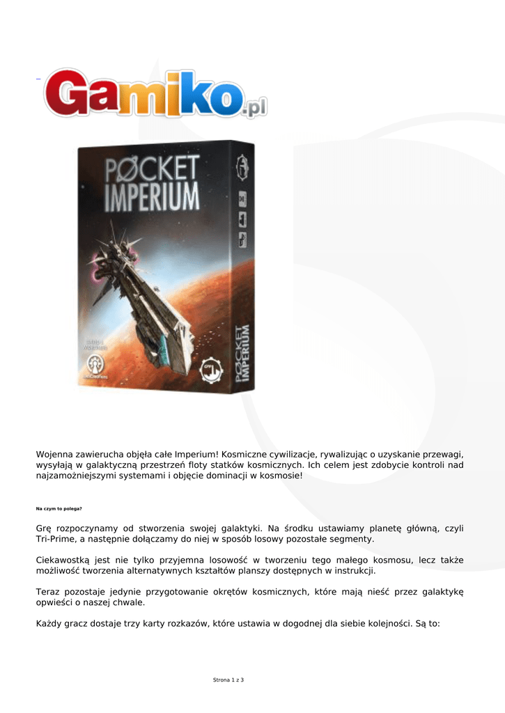 Wojenna zawierucha objęła całe Imperium! Kosmiczne cywilizacje, rywalizując o uzyskanie przewagi, wysyłają w galaktyczną przestrzeń floty statków kosmicznych. Ich celem jest zdobycie kontroli nad najzamożniejszymi systemami i objęcie dominacji w kosmosie! Na czym to polega? Grę rozpoczynamy od stworzenia swojej galaktyki. Na środku ustawiamy planetę główną, czyli Tri-Prime, a następnie dołączamy do niej w sposób losowy pozostałe segmenty. Ciekawostką jest nie tylko przyjemna losowość w tworzeniu tego małego kosmosu, lecz także możliwość tworzenia alternatywnych kształtów planszy dostępnych w instrukcji. Teraz pozostaje jedynie przygotowanie okrętów kosmicznych, które mają nieść przez galaktykę opwieści o naszej chwale. Każdy gracz dostaje trzy karty rozkazów, które ustawia w dogodnej dla siebie kolejności. Są to: Strona 1 z 3 ekspansja - rozwój, rozrost floty, eksploracja - odkrywanie bezkresów kosmosu, czyli ruch statków po mapie i eksterminacja - atak, czyli bezpośredni wpływ na rozwój innych graczy. Tylko od nas zależy, na co zdecydujemy się najpierw. Nie ma tutaj przypadku. Jednak musimy pamiętać, że kiedy dwaj gracze wybiorą w tym samym momencie identyczną kartę, to ich szanse na wygraną maleją, ponieważ efekt generowany przez kartę proporcjonalnie maleje przykładowo ruch, który zamierzaliśmy wykonać (eksploracja) zamiast docierać o trzy hexy od miejsca startu, dotrze jedynie o dwa. Eksploatacja jest fazą, która decyduje o losie naszych galaktycznych podróżników, to w niej podlicza się punkty. Każdy z graczy ma możliwość wybrania sektora galaktyki, który jest dla niego najbardziej lukratywnym kąskiem. Planety, na których dotarcie poświęcamy wiele statków, podróżując przez mroki kosmosu, teraz mogą nam oddać swoje bogactwa. Posiadają one poziomy i, jeśli są odkryte przez nasze statki, dają nam punkty równe tym poziomom. Trzeba jednak pamiętać o tym, że jeżeli przeciwnik w wybranym przez nas sektorze również odkrył planety, to też otrzymuje za nie punkty. Wyjątkowym ruchem jest zajęcie centralnej planety, czyli Tri-Prime. Gracz, który przetrwał batalię o ten właśnie sektor nie dostaje za niego profitów. Może za to wybrać jeden sąsiadujący sektor i z niego czerpać surowce – czyli punkty. Za co pokochasz tę grę? Pocket Imperium łączy w sobie minimalizm wyglądu z wysoką grywalnością, strategię z konfrontacją i, co najważniejsze, niewielki rozmiar z ogromnym potencjałem. Wiele trybów gry, losowo generowana plansza i mnogość taktyk prowadzących do zwycięstwa gwarantuje dobrą zabawę na wiele godzin, podzielonych na przyjemnie krótkie rozgrywki. Pocket Imperium to tytuł, którego nie powinno zabraknąć na pólkach fanów sci-fi. Jego główną zaletą jest to, że łączy w sobie lubiane w grach o znacznie większej skali4X (exploring, expanding, e xterminating, exploiting) z krótkim czasem rozgrywki - trwa ona zazwyczaj nie więcej niż godzinę i to z tłumaczeniem zasad! Zawartość pudełka: 7 dwustronnych kafelków planszy 52 żetony statków 12 kart rozkazów 4 karty pomocy 42 kafelki punktów zwycięstwa 1 wskaźnik pierwszego gracza instrukcja Wiek Strona 2 z 3 12 + Liczba graczy 2-4 Czas gry ok. 45 minut Instrukcja polska Wydanie polskie Producent Games Factory Publishing Projektant David J. Mortimer Strona 3 z 3