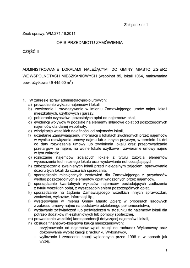 Załącznik nr 1 Znak sprawy: WM.271.16.2011 OPIS PRZEDMIOTU ZAMÓWIENIA CZĘŚĆ II ADMINISTROWANIE LOKALAMI NALEŻĄCYMI DO GMINY MIASTO ZGIERZ WE WSPÓLNOTACH MIESZKANIOWYCH (wspólnot 85, lokali 1064, maksymalna pow. użytkowa 49 445,00 m2) 1. W zakresie spraw administracyjno-biurowych: a) prowadzenie wykazu najemców i lokali, b) zawieranie i rozwiązywanie w imieniu Zamawiającego umów najmu lokali mieszkalnych, użytkowych i garaży, c) pobieranie czynszów i pozostałych opłat od najemców lokali, d) ewidencji wpływów w podziale na elementy składowe opłat od poszczególnych najemców dla danej wspólnoty, e) windykacja wszelkich należności od najemców lokali, f) udzielanie Zamawiającemu informacji o lokalach zwolnionych przez najemców w wyniku rozwiązania umowy najmu lub z innych przyczyn, w terminie 14 dni od daty rozwiązania umowy lub zwolnienia lokalu oraz przeprowadzanie przetargów na najem, na wolne lokale użytkowe i zawieranie umowy najmu w tym zakresie, g) rozliczanie najemców zdających lokale z tytułu zużycia elementów wyposażenia technicznego lokalu oraz wystawianie not obciążających, h) zabezpieczanie zwalnianych lokali przed nielegalnym zajęciem, sprawowanie dozoru tych lokali do czasu ich sprzedania, i) sporządzanie miesięcznych zestawień dla Zamawiającego z przychodów według poszczególnych elementów opłat wnoszonych przez najemców, j) sporządzanie kwartalnych wykazów najemców posiadających zadłużenia z tytułu wszelkich opłat, z wyszczególnieniem poszczególnych opłat, k) sporządzanie na żądanie Zamawiającego wszelkich innych sprawozdań, zestawień, wykazów, informacji itp., l) występowanie w imieniu Gminy Miasto Zgierz w procesach sądowych z zakresu umowy najmu na podstawie udzielonego pełnomocnictwa, l) wydawanie zaświadczeń lub poświadczeń w stosunku do najemców lokali dla potrzeb dodatków mieszkaniowych lub pomocy społecznej, m) prowadzenie wszelkiej korespondencji dotyczącej najemców i lokali, n) obsługa finansowo-księgowa kaucji mieszkaniowych: przyjmowanie od najemców wpłat kaucji na rachunek Wykonawcy oraz dokonywanie wypłat kaucji z rachunku Wykonawcy, wyliczanie i zwracanie kaucji wpłaconych przed 1998 r. w sposób jak wyżej, 1 prowadzenie pełnej analityki kaucji na kontach pozabilansowych, sporządzanie miesięcznych rozliczeń wszystkich operacji finansowych w zakresie kaucji do dnia 07-tego następnego miesiąca, na podstawie którego Urząd Miasta Zgierza do dnia 15-tego danego miesiąca dokona odpowiedniego przelewu na konto bankowe Wykonawcy w wysokości równej wypłaconym kaucjom, a Wykonawca przekaże na konto Zamawiającego równowartość przyjętych kaucji również do dnia 15-tego danego miesiąca, o) przetwarzanie danych osobowych w: 1) zakresie danych osobowych (tj.: nazwiska i imiona, adres zamieszkania lub pobytu, seria i nr dowodu osobistego) 2) cel przetwarzania danych: a) administrowanie i zarządzanie budynkami wspólnot mieszkaniowych, b) zawieranie umów najmu na lokale mieszkalne i użytkowe, c) aktualizacja opłat z tytułu najmu lokali mieszkalnych i użytkowych. 2. W zakresie spraw administracyjno-technicznych: a) wykonywanie konserwacji oraz bieżących napraw lokali w zakresie obciążającym właściciela lokalu, b) rozpatrywanie wniosków najemców oraz wydawanie zgody na wykonanie we własnym zakresie napraw lub remontu lokalu, należących do obowiązków właściciela lokalu w przypadku uznania konieczności ich wykonania na koszt właściciela lokalu, c) dokonywanie odbiorów w/w prac wykonywanych przez najemców oraz kompensowanie ich wydatków z opłatami za czynsz, d) prowadzenie ewidencji prac, o których mowa w pkt. c wraz z wysokością poniesionych wydatków, e) organizowanie i prowadzenie remontów lokali w uzgodnieniu z Zamawiającym, f) sporządzanie corocznych propozycji potrzeb remontowych dla poszczególnych lokali, w rozbiciu na daną wspólnotę, według konieczności ich wykonania, potwierdzonych przeprowadzonymi kontrolami stanu technicznego, g) na odrębne zlecenie Zamawiającego wykonywanie wszelkich prac związanych z remontami nie podlegającymi ustawie – Prawo zamówień publicznych, h) pełnienie funkcji inwestora zastępczego w zakresie prowadzenia robót remontowych wymagających przeprowadzania postępowań o udzielenie zamówień publicznych oraz sprawowanie nadzoru inwestorskiego nad tymi robotami, i) prowadzenie ewidencji wszelkich prac remontowych dla poszczególnych lokali wraz z wysokością ponoszonych kosztów dla danej wspólnoty. 3. W zakresie spraw związanych z wykonywaniem czynności, będących przedmiotem umowy, Zamawiający upoważnia Wykonawcę do dochodzenia roszczeń Zamawiającego i reprezentowania Zamawiającego przed sądami powszechnymi i w postępowaniu egzekucyjnym, w sprawach o: a) zapłatę z tytułu zaległych płatności za czynsz najmu i opłat za świadczenia dodatkowe, b) odszkodowanie za bezumowne korzystanie z lokali, c) eksmisję z lokali mieszkalnych i użytkowych, d) odszkodowanie za szkody wyrządzone Zamawiającemu. 2 4. Wykonawca jest zobowiązany do wykonania czynności administracji z należytą starannością i chronienia interesów Zamawiającego w toku wykonywania powierzonych zadań i czynności. 5. Wykonawca jest zobowiązany przekazywać wpływy z czynszu najmu, opłat niezależnych od właściciela z wszystkich lokali oraz ściągniętych odsetek za zwłokę w zapłacie na konto Urzędu Miasta Zgierza w Banku Spółdzielczym w Zgierzu nr konta 04 8783 0004 0017 2303 2000 0107 w terminie do dnia 15-tego i 25-tego danego miesiąca. Rozliczenie miesięczne powinno być dokonane przez Wykonawcę do dnia 07-tego miesiąca następnego. a) Wykonawca refakturuje opłaty niezależne od właściciela na podstawie faktur wystawionych przez dostawcę usług / kserokopię faktur w załączeniu/. b) w przypadku przekroczenia terminów określonych w pkt. 5 Wykonawca zobowiązany jest zapłaci
