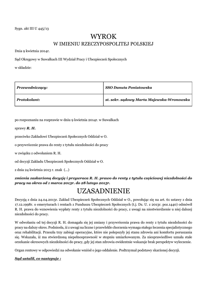 Sygn. akt III U 445/13 WYROK W IMIENIU RZECZYPOSPOLITEJ POLSKIEJ Dnia 9 kwietnia 2014r. Sąd Okręgowy w Suwałkach III Wydział Pracy i Ubezpieczeń Społecznych w składzie: Przewodniczący: SSO Danuta Poniatowska Protokolant: st. sekr. sądowy Marta Majewska-Wronowska po rozpoznaniu na rozprawie w dniu 9 kwietnia 2014r. w Suwałkach sprawy R. H. przeciwko Zakładowi Ubezpieczeń Społecznych Oddział w O. o przywrócenie prawa do renty z tytułu niezdolności do pracy w związku z odwołaniem R. H. od decyzji Zakładu Ubezpieczeń Społecznych Oddział w O. z dnia 24 kwietnia 2013 r. znak (...) zmienia zaskarżoną decyzję i przywraca R. H. prawo do renty z tytułu częściowej niezdolności do pracy na okres od 1 marca 2013r. do 28 lutego 2015r. UZASADNIENIE Decyzją z dnia 24.04.2013r. Zakład Ubezpieczeń Społecznych Oddział w O., powołując się na art. 61 ustawy z dnia 17.12.1998r. o emeryturach i rentach z Funduszu Ubezpieczeń Społecznych (t.j. Dz. U. z 2013r. poz.1440) odmówił R. H. prawa do wznowienia wypłaty renty z tytułu niezdolności do pracy, z uwagi na niestwierdzenie u niej dalszej niezdolności do pracy. W odwołaniu od tej decyzji R. H. domagała się jej zmiany i przywrócenia prawa do renty z tytułu niezdolności do pracy na dalszy okres. Podniosła, iż z uwagi na liczne i przewlekłe chorzenia wymaga stałego leczenia specjalistycznego oraz rehabilitacji. Przeszła trzy zabiegi operacyjne, które nie polepszyły jej stanu zdrowia ani komfortu poruszania się. Wskazała, iż ma stwierdzoną niepełnosprawność w stopniu umiarkowanym. Za niesprawiedliwe uznała stałe orzekanie okresowych niezdolności do pracy, gdy jej stan zdrowia ewidentnie wskazuje brak perspektyw wyleczenie. Organ rentowy w odpowiedzi na odwołanie wniósł o jego oddalenie. Podtrzymał podstawy skarżonej decyzji. Sąd ustalił, co następuje : R. H. (ur. (...)) do dnia 28.02.2013r. była uprawniona do renty z tytułu częściowej niezdolności do pracy. W dniu 23.01.2013r. wystąpiła z wnioskiem o ponowne ustalenie prawa do tego świadczenia. Odwołująca była zatrudniona w Gimnazjum nr 1 w G. na stanowisku sekretarza. Lekarz orzecznik stwierdził u odwołującej częściową niezdolność do pracy do dnia 28.02.2014r. W ramach nadzoru zwierzchniczego zastrzeżenia do tego orzeczenia złożył główny lekarz orzecznik i sprawę przekazano do rozpoznania komisji lekarskiej ZUS. Przed wydaniem orzeczenia komisja uzyskała opinię lekarza konsultanta z zakresu ortopedii, który stwierdził, iż odwołująca jest zdolna do wykonywania dotychczasowej pracy zarobkowej. Komisja lekarska ostatecznie nie stwierdziła u odwołującej niezdolności do pracy. Sąd poczynił ustalenia, co do aktualnego stanu zdrowia wnioskodawczyni, dopuszczając na tę okoliczność dowód z opinii biegłych lekarzy sądowych odpowiednich specjalności, mając na uwadze rodzaj schorzeń rozpoznanych u odwołującej. Biegli lekarze sądowi zostali zobowiązani do wypowiedzenia się czy wnioskodawczyni jest częściowo niezdolna do pracy, jeżeli tak, czy jest to niezdolność stała czy okresowa oraz czy nastąpiło istotne pogorszenie bądź poprawa jej stanu zdrowia od ostatniego badania z dnia 20.09.2012r. Przy sporządzaniu opinii biegli uwzględnili zgromadzoną w sprawie dokumentację medyczną oraz przeprowadzili badanie odwołującej. Pierwszą opinię w sprawie wydał zespół biegłych lekarzy sądowych, w skład którego wchodzili specjaliści z zakresu neurologii, ortopedii i chorób wewnętrznych (k.10-12). Biegli rozpoznali u odwołującej schorzenia neurologiczne, ortopedyczne, stan po przebytych zabiegach operacyjnych o podłożu ortopedycznym oraz endokrynologicznym. Zaopiniowali, iż stwierdzone u niej schorzenia i stopień ich nasilenia nie powodują niezdolności do pracy. Nie stwierdzili niedowładów w zakresie kończyn górnych i dolnych, ani zaburzeń funkcji kręgosłupa i kończyn, które ograniczałyby w znacznym stopniu jej zdolność do pracy. Ich zdaniem od ostatniego badania nastąpiła poprawa stanu zdrowia odwołującej w zakresie funkcji ruchowej kończyny dolnej lewej, zwłaszcza stopy. W związku z zastrzeżeniami odwołującej drugą opinię sporządził drugi zespół biegłych lekarzy sądowych z zakresu ortopedii i neurologii. Rozpoznali oni u odwołującej chorobę zwyrodnieniową lewego stawu biodrowego z dysfunkcją kończyny, chorobę zwyrodnieniową kręgosłupa szyjnego i L-S oraz stan po zabiegu operacyjnym Zaopiniowali, iż schorzenia te powodują u wnioskodawczyni dalszą częściową niezdolność do pracy na okres 2 lat, od 01.03.2013r. Nie stwierdzili, aby od ostatniego badania doszło do poprawy stanu zdrowia wnioskodawczyni, gdyż ruchomość lewego stawu biodrowego uległa zmniejszeniu. Odwołująca nadal utyka, chód jej jest niewydolny z powodu bólu (k.35-37). Biegli opiniujący w pierwszym zespole zgodzili się ze stanowiskiem drugiego zespołu biegłych (k. 60). Sąd zważył, co następuje: Z uwagi na fakt, iż wnioskodawczyni do 28.02.2013r. legitymowała się prawem do renty z tytułu częściowej niezdolności do pracy i wniosła o jej przywrócenie, żądanie podlegało rozpoznaniu na podstawie art. 61 ustawy z dnia 17.12.1998r. o emeryturach i rentach z Funduszu Ubezpieczeń Społecznych (t.j. Dz. U. z 2013r. poz.1440). Zgodnie z jego treścią prawo do renty, które ustało w związku z ustąpieniem niezdolności do pracy, podlega przywróceniu o ile niezdolność do pracy zostanie stwierdzona w okresie 18 miesięcy od ustania tego prawa. Jak stanowi art. 12 ust 1 ustawy o emeryturach i rentach z FUS niezdolność do pracy powoduje utratę zdolności do pracy zarobkowej z powodu naruszenia sprawności organizmu i nie rokuje jej odzyskania po przekwalifikowaniu. Utrata zdolności do pracy skutkuje ustaleniem jej stopnia, zgodnie z treścią art. 12 ust.2 i 3 ustawy o emeryturach i rentach z FUS poprzez zakwalifikowanie jej do częściowej bą