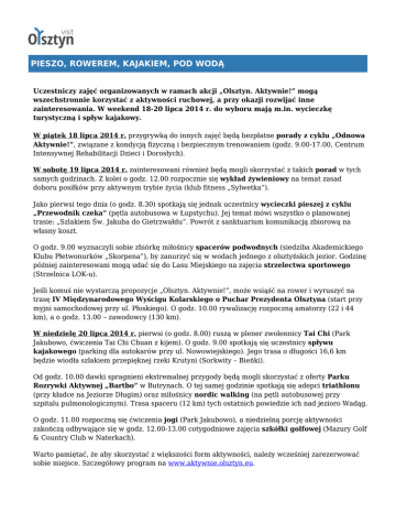 PIESZO, ROWEREM, KAJAKIEM, POD WODĄ Uczestniczy zajęć organizowanych w ramach akcji „Olsztyn. Aktywnie!” mogą wszechstronnie korzystać z aktywności ruchowej, a przy okazji rozwijać inne zainteresowania. W weekend 18-20 lipca 2014 r. do wyboru mają m.in. wycieczkę turystyczną i spływ kajakowy. W piątek 18 lipca 2014 r. przygrywką do innych zajęć będą bezpłatne porady z cyklu „Odnowa Aktywnie!”, związane z kondycją fizyczną i bezpiecznym trenowaniem (godz. 9.00-17.00, Centrum Intensywnej Rehabilitacji Dzieci i Dorosłych). W sobotę 19 lipca 2014 r. zainteresowani również będą mogli skorzystać z takich porad w tych samych godzinach. Z kolei o godz. 12.00 rozpocznie się wykład żywieniowy na temat zasad doboru posiłków przy aktywnym trybie życia (klub fitness „Sylwetka”). Jako pierwsi tego dnia (o godz. 8.30) spotkają się jednak uczestnicy wycieczki pieszej z cyklu „Przewodnik czeka” (pętla autobusowa w Łupstychu). Jej temat mówi wszystko o planowanej trasie: „Szlakiem Św. Jakuba do Gietrzwałdu”. Powrót z sanktuarium komunikacją zbiorową na własny koszt. O godz. 9.00 wyznaczyli sobie zbiórkę miłośnicy spacerów podwodnych (siedziba Akademickiego Klubu Płetwonurków „Skorpena”), by zanurzyć się w wodach jednego z olsztyńskich jezior. Godzinę później zainteresowani mogą udać się do Lasu Miejskiego na zajęcia strzelectwa sportowego (Strzelnica LOK-u). Jeśli komuś nie wystarczą propozycje „Olsztyn. Aktywnie!”, może wsiąść na rower i wyruszyć na trasę IV Międzynarodowego Wyścigu Kolarskiego o Puchar Prezydenta Olsztyna (start przy myjni samochodowej przy ul. Płoskiego). O godz. 10.00 rywalizację rozpoczną amatorzy (22 i 44 km), a o godz. 13.00 – zawodowcy (130 km). W niedzielę 20 lipca 2014 r. pierwsi (o godz. 8.00) ruszą w plener zwolennicy Tai Chi (Park Jakubowo, ćwiczenia Tai Chi Chuan z kijem). O godz. 9.00 spotkają się uczestnicy spływu kajakowego (parking dla autokarów przy ul. Nowowiejskiego). Jego trasa o długości 16,6 km będzie wiodła szlakiem przepięknej rzeki Krutyni (Sorkwity – Bieńki). Od godz. 10.00 dawki spragnieni ekstremalnej przygody będą mogli skorzystać z oferty Parku Rozrywki Aktywnej „Bartbo” w Butrynach. O tej samej godzinie spotkają się adepci triathlonu (przy kładce na Jeziorze Długim) oraz miłośnicy nordic walking (na pętli autobusowej przy szpitalu pulmonologicznym). Trasa spaceru (12 km) tych ostatnich powiedzie ich nad jezioro Wadąg. O godz. 11.00 rozpoczną się ćwiczenia jogi (Park Jakubowo), a niedzielną porcję aktywności zakończą odbywające się w godz. 12.00-13.00 cotygodniowe zajęcia szkółki golfowej (Mazury Golf & Country Club w Naterkach). Warto pamiętać, że aby skorzystać z większości form aktywności, należy wcześniej zarezerwować sobie miejsce. Szczegółowy program na www.aktywnie.olsztyn.eu. www.visit.olsztyn.eu