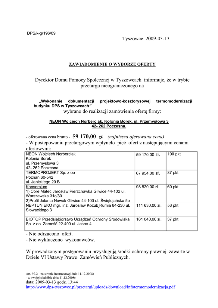 DPS/k-g/196/09 Tyszowce. 2009-03-13 ZAWIADOMIENIE O WYBORZE OFERTY Dyrektor Domu Pomocy Społecznej w Tyszowcach informuje, Ŝe w trybie przetargu nieograniczonego na „Wykonanie dokumentacji budynku DPS w Tyszowcach” projektowo-kosztorysowej termomodernizacji wybrano do realizacji zamówienia ofertę firmy: NEON Wojciech Norberciak, Kolonia Borek, ul. Przemysłowa 3 42- 262 Poczesna. - oferowana cena brutto - 59 170,00 zł. (najniŜsza oferowana cena) - W postępowaniu przetargowym wpłynęło pięć ofert z następującymi cenami ofertowymi: NEON Wojciech Norberciak Kolonia Borek ul. Przemysłowa 3 42- 262 Poczesna TERMOPROJEKT Sp. z oo Poznań 60-542 ul. Janickiego 20 B Konsorcjum 1) Core Matec Jarosław Pierzchawka Gliwice 44-102 ul. Warszawska 31c/30 2)Profil Jolanta Nowak Gliwice 44-100 ul. Świętojańska 5b NEPTUN EKO mgr. inŜ. Jarosław Kozub Rumia 84-230 ul. Słowackiego 3 BIOTOP Przedsiębiorstwo Urządzeń Ochrony Środowiska Sp. z oo. Zamość 22-400 ul. Jasna 4 59 170,00 zł. 100 pkt 67 954,00 zł. 87 pkt 98 820,00 zł. 60 pkt 111 630,00 zł. 53 pkt 161 040,00 zł. 37 pkt - Nie odrzucono ofert. - Nie wykluczono wykonawców. W prowadzonym postępowaniu przysługują środki ochrony prawnej zawarte w Dziele VI Ustawy Prawo Zamówień Publicznych. Art. 92.2 - na stronie internetowej dnia 11.12.2008r - w swojej siedzibie dnia 11.12.2008r. data: 2009-03-13 godz. 13:44 http://www.dps-tyszowce.pl/przetargi/uploads/download/infotermomodernizacja.pdf