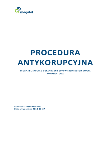 PROCEDURA ANTYKORUPCYJNA MEGATEL S PÓŁKA Z OGRANICZONĄ ODPOWIEDZIALNOŚCIĄ SPÓŁKA KOMANDYTOWA AUTORZY: ZARZĄD MEGATEL D A T A U T W O R Z E N I A 2014‐06‐27 1. DEFINICJE. Ilekroć w dalszej części niniejszej procedury będzie mowa o: 1.1. Spółce – należy przez to rozumieć spółkę Megatel spółka z ograniczoną odpowiedzialnością spółka komandytowa. 1.2. Pracowniku – należy przez to rozumieć osobę zatrudnioną na stałe w Spółce na podstawie umowy o pracę lub umowy cywilnoprawnej. 1.3. Współpracowniku – należy przez to rozumieć każdą osobę współpracującą ze Spółką, w szczególności jako dostawca usług lub podwykonawca. 1.4. Kontrahent/Klient – należy przez to rozumieć każdą osobę lub firmę, na rzecz której Spółka wykonuje usługę, sprzedaż, wdrożenie, kontrakt lub realizację umowy. 1.5. Działaniach Korupcyjnych – należy przez to rozumieć działania wyczerpujące znamiona przestępstw określonych w art. 229 kodeksu karnego, 230 kodeksu karnego lub 230a kodeksu karnego. 1.6. Inne Nadużycia Gospodarcze – należy przez to rozumieć działania niestanowiące Działań Korupcyjnych, jednak stojące w sprzeczności z zasadą uczciwej konkurencji lub dobrych obyczajów kupieckich, stanowiące przestępstwa lub wykroczenia związane z obrotem gospodarczym, lub działania potencjalnie korupcyjne. 2. CEL. 2.1. Celem niniejszej procedury jest ustalenie jednolitych zasad dotyczących postępowania w razie stwierdzenia nadużyć, zapobiegania i przeciwdziałania nadużyciom dokonywanym na szkodę Spółki oraz działań niezgodnych z Kodeksem Etyki. 2.2. Celem procedury jest również zapewnienie transparentności działań Spółki względem jej partnerów handlowych. 3. ZAKRES PRZEDMIOTOWY I PODMIOTOWY. 3.1. Procedura dotyczy wszelkich Działań Korupcyjnych i Innych Nadużyć Gospodarczych z udziałem pracowników, jak również udziałowców, konsultantów, dostawców, kontrahentów i wszelkich podmiotów pozostających w relacjach gospodarczych ze Spółką. 3.2. Procedura powinna być przestrzegana przez wszystkich Pracowników i Współpracowników Spółki, bez względu na staż pracy, stanowisko, czy relacje ze Spółką. www.megatel.com.pl Strona 1 z 7 4. ZAKRES ODPOWIEDZIALNOŚCI. 4.1. Za wdrożenie i przestrzeganie niniejszej procedury odpowiadają członkowie zarządu komplementariusza Spółki. 4.2. Aktualna Procedura Antykorupcyjna jest dostępna na stronie internetowej www.megatel.com.pl oraz w siedzibie spółki. 4.3. Wszyscy Pracownicy mają obowiązek zapoznać się z niniejszą procedurą i przestrzegać jej w toku wykonywania swoich obowiązków. 4.4. Informacja o wdrożeniu i dostępności Dokumentu Procedury Antykorupcyjnej jest umieszczona na stronie internetowej spółki pod adresem www.megatel.com.pl oraz w stopce korespondencji mailowej przedstawicieli firmy, co ma ułatwić zapoznanie się z jej zasadami Współpracownikom i Kontrahentom Spółki. 4.5. Pracownicy na stanowiskach kierowniczych mają obowiązek identyfikować inherentne ryzyka nadużyć, wpisane w obszar ich zadań. Kierownicy muszą zwracać uwagę na wszelkie przejawy nieprawidłowości odnośnie procesów, za które są odpowiedzialni oraz na wszelkie potencjalne nadużycia. W toku realizacji niniejszej Procedury, Pracownicy na stanowiskach kierowniczych będą tworzyć rejestr Działań Korupcyjnych lub Innych Nadużyć Gospodarczych, który będzie służył w przyszłości jako wytyczne, pomagające w identyfikowaniu w Spółce działań niedozwolonych. Do rejestru wpisywane będą wszystkie zachowania, które w efekcie doprowadziły do podjęcia przez Spółkę działań na podstawie niniejszej procedury. Za prowadzenie rejestru odpowiada Zarząd Komplementariusza Spółki. 4.6. O każdym potencjalnym nadużyciu Pracownik lub Współpracownik ma obowiązek niezwłocznie poinformować przełożonego, lub przełożonego wyższego szczebla jeśli nadużycie dotyczy jego bezpośredniego przełożonego. W przypadku, gdy dana informacja nie będzie miała potwierdzenia w faktach nie będą podejmowane kroki wyjaśniające. Za działania niedozwolone uznaje się: 4.6.1. obiecywanie jakichkolwiek korzyści majątkowych lub osobistych, 4.6.2. proponowanie jakichkolwiek korzyści majątkowych lub osobistych, 4.6.3. wręczanie jakichkolwiek korzyści majątkowych lub osobistych, 4.6.4. przyjmowanie jakichkolwiek korzyści majątkowych lub osobistych, www.megatel.com.pl Strona 2 z 7 5. ZASADY OGÓLNE. 5.1. Pracownikom i Współpracownikom Spółki nie wolno podejmować Działań Korupcyjnych lub Innych Nadużyć Gospodarczych w żadnych okolicznościach. 5.2. O każdym podejrzeniu występowania Działań Korupcyjnych lub Innych Nadużyć Gospodarczych, Pracownicy lub Współpracownicy Spółki niezwłocznie zobowiązani są zawiadomić Spółkę. 6. DZIAŁANIA KORUPCYJNE. Dla celów niniejszej procedury, działania korupcyjne obejmują wszelkie działania noszące znamiona przestępstwa lub wykroczenia, w tym przede wszystkim następujące działania: 6.1. Obiecywanie, proponowanie, nakłanianie, wręczanie jakichkolwiek korzyści majątkowych lub osobistych, poza zwyczajowymi upominkami świątecznymi i materiałami promocyjnymi (zgodnymi z przepisami podatkowymi i obowiązującym prawem). 6.2. Przyjmowanie korzyści majątkowych od przedstawicieli dostawców Spółki, jak również nieuzasadnione preferowanie niektórych dostawców Spółki. 6.3. Pracownicy i Współpracownicy zobowiązani są wykonywać swoje obowiązki w sposób gwarantujący transparentność działań. 7. INNE NADUŻYCIA GOSPODARCZE. Dla celów niniejszej procedury, nadużycia i niewłaściwe zachowania obejmują wszelkie działania noszące znamiona przestępstwa lub wykroczenia (w tym przestępstwa lub wykroczenia skarbowe), a także inne zachowania, w tym między innymi następujące działania: 7.1. Przywłaszczenie mienia Spółki (materiałów, produktów, sprz