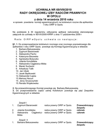 UCHWAŁA NR 69/VIII/2010 RADY OKRĘGOWEJ IZBY RADCÓW PRAWNYCH W OPOLU z dnia 14 września 2010 roku w sprawie powołania komisji egzaminacyjnych na kolokwium roczne dla aplikantów I roku OIRP w Opolu Na podstawie § 30 regulaminu odbywania aplikacji radcowskiej stanowiącego załącznik do uchwały nr 90/VII/2009 KRRP z dnia 17 października 2009 r Rada OIRP wOpolu uchwala co następuje: §1. 1. Do przeprowadzenia kolokwium rocznego oraz rocznego poprawkowego dla aplikantów I roku OIRP Opolu powołuje się Komisję Egzaminacyjną w składzie: 1. Barbara Bieluszewska 2. Zygmunt Baranowski 3. Aleksandra Pacho 4. Katarzyna Bisowska 5. Agnieszka Bożyczko 6. Jolanta Konofalska 7. Aleksandra Ciąglewicz-Miśta 8. Marek Suchecki 9. Arkadiusz Talik 10. Jan Uksik 11. Jacek Będkowski 12. Aleksander Łapka 13. Mariusz Nocuń 14. Jerzy Gruszczyński 15. Renata Wojakowska 2. Na przewodniczącego Komisji powołuje się Barbarę Bieluszewską 3. Do przeprowadzenia części ustnej Kolokwium powołuje się pięć Zespołów Egzaminacyjnych w składzie 1. 2. 3. 1. Zespół I Zygmunt Baranowski radca prawny OIRP w Opolu Jolanta Konofalska radca prawny OIRP w Opolu Aleksandra Ciąglewicz- radca prawny OIRP w Opolu Miśta Zespół II Barbara Bieluszewska radca prawny OIRP w Opolu Przewodniczący Zespołu członek członek Przewodniczący Zespołu 2. 3. Katarzyna Bisowska Marek Suchecki radca prawny OIRP w Opolu radca prawny OIRP w Opolu członek członek 1. Zespół III Agnieszka Bożyczko radca prawny OIRP w Opolu 2. 3. Arkadiusz Talik Jan Uksik radca prawny OIRP w Opolu radca prawny OIRP w Opolu Przewodniczący Zespołu członek członek 1. Zespół IV Aleksandra Pacho radca prawny OIRP w Opolu 2. 3. Jerzy Gruszczyński Aleksander Łapka radca prawny OIRP w Opolu radca prawny OIRP w Opolu 1. Zespół V Jacek Będkowski radca prawny OIRP w Opolu 2. 3. Mariusz Nocuń Renata Wojakowska radca prawny OIRP w Opolu radca prawny OIRP w Opolu Przewodniczący Zespołu członek członek Przewodniczący Zespołu członek członek §3. 1. Szczegółowe zasady przeprowadzenia Kolokwium stanowią załącznik nr 1 do niniejszej uchwały 2. Terminy egzaminów ustnych przeprowadzanych przez poszczególne Zespoły wraz ze wskazaniem aplikantów przystępujących do egzaminu w danym dniu stanowią załącznik numer dwa do niniejszej uchwały. §4. Uchwała wchodzi w życie z dniem podjęcia. Sekretarz Rady OIRP Aleksandra Ciąglewicz - Miśta Dziekan Rady OIRP Barbara Bieluszewska Załącznik nr 1 Informacje organizacyjne dotyczące kolokwium rocznego aplikantów I roku OIRP w Opolu I. Czynności przed rozpoczęciem kolokwium. 1. Miejscem przeprowadzenia kolokwium w formie pisemnej w dniu 22 listopada 2010r. jest Aula Politechniki Opolskiej znajdująca się w Opolu przy ul. Prószkowskiej – godzina 11. 2. Miejscem przeprowadzenia kolokwium w formie ustnej w dniach 1-10 grudnia jest odpowiednio dla aplikantów grupy A B C siedziba OIRP w Opolu, dla aplikantów grupy D i E siedziba Delegatury OIRP w Częstochowie(szczegółowy podział na grupy stanowi załącznik nr 2 do Uchwały). 3. W trakcie kolokwium zdający nie może posiadać przy sobie żadnych przedmiotów lub urządzeń służących do przekazu, odczytu lub odbioru informacji, np. telefonu komórkowego, laptopa, palmtopa, i-poda, kalkulatora itp. przeprowadzenia W przypadku kolokwium wniesienia tego typu na teren urządzeń, miejsca obowiązek zdeponowania na czas trwania kolokwium poza miejscem zdawania kolokwium obciąża zdającego, który ponosi ryzyko ich utraty lub uszkodzenia. 4. Kolokwium w formie pisemnej wszystkich członków komisji, powinno odbywać się w obecności a przez cały czas trwania tego kolokwium na sali znajdować się powinni co najmniej 3 członkowie komisji. 5. Zestawy pytań testowych i zestawy pytań na część ustną kolokwium zostaną przygotowane przez Komisję i przekazane Przewodniczącemu. II. Przebieg kolokwium 6. Nieobecność zdającego w którejkolwiek części kolokwium , uważa się za odstąpienie od udziału w kolokwium. 7. Każdorazowo przed rozpoczęciem każdej części kolokwium, przed wejściem na salę, zdający okazują dokument ze zdjęciem potwierdzający tożsamość, a następnie w przypadku części pisemnej losują numer stolika. Zdający - po wylosowaniu nr stolika - winni zająć wskazane miejsce i nie powinni opuszczać sali. 8. Przed rozpoczęciem kolokwium w formie pisemnej przewodniczący komisji udziela informacji o przebiegu kolokwium, o zasadach dokonywania oceny oraz sposobie i terminie ogłoszenia wyników kolokwium. 9. Prace na części pisemnej kolokwium są kodowane. Zdający losuje kopertę, na której widnieje numer kodu, a w środku znajduje się czysta kartka. Na czystej kartce zdający wpisuje swoje imię i nazwisko, po czym umieszcza kartkę w kopercie. Numer kodu powinien być umieszczony na kopercie, w prawym górnym rogu na pierwszej stronie zestawu pytań testowych i na każdej stronie karty odpowiedzi. Odpowiedzi zaznaczone na teście, zamiast na karcie odpowiedzi, nie będą uwzględniane. Po zebraniu kopert z kodami przewodniczący winien ogłosić o rozpoczęciu przystąpienia do rozwiązywania zestawu pytań testowych. Od tego momentu, liczony jest czas na rozwiązywanie zestawu pytań testowych – czas to 60 minut. 10. Kolokwium w formie pisemnej polega na rozwiązaniu testu składającego się z zestawu 30 pytań. Wybór odpowiedzi polega na zakreśleniu na karcie odpowiedzi jednej z trzech propozycji odpowiedzi (A, albo B, albo C). Niedozwolona jest zmiana zakreślonej odpowiedzi. 11. Po zakończeniu pracy przed wyznaczonym czasem, zdający pozostaje na miejscu i sygnalizuje ukończenie pracy przez podniesienie ręki, po czym przewodniczący lub członek komisji odbiera od niego pracę. Po upływie wyznaczonego poinformować zdających o czasu, zakończeniu przewodniczący kolokwium i winien polecić zaprzestanie rozwiązywania zestawu pytań testowych. Zdający winni ze