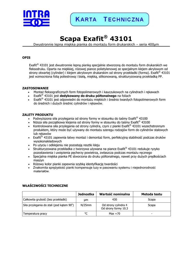 Scapa Exafit® 43101 Dwustronnie lepna miękka pianka do montażu form drukarskich – seria 400µm OPIS Exafit® 43101 jest dwustronnie lepną pianką specjalnie stworzoną do montażu form drukarskich we fleksodruku. Oparta na miękkiej, różowej piance polietylenowej ze specjalnym klejem akrylowym od strony otwartej (cylinder) i klejem akrylowym drukarskim od strony przekładki (forma). Exafit® 43101 jest wzmocniona folią poliestrową i białą, miękką, silikonowaną, strukturyzowaną przekładką PP. ZASTOSOWANIE • Montaż fleksograficznych form fotopolimerowych i kauczukowych na cylindrach i rękawach • Exafit® 43101 jest dedykowany do druku półtonalnego na foliach • Exafit® 43101 jest odpowiedni do montażu miękkich i średnio twardych fotopolimerowych form do średnich i dużych średnic cylindrów i rękawów. ZALETY PRODUKTU ® • Podwyższona siła przylegania od strony formy w stosunku do taśmy Exafit 43100 ® • Niższa siła początkowa klejenia od strony formy w stosunku do taśmy Exafit 43100 ® • Kontrolowana siła przylegania od strony cylindra, czyni z pianki Exafit 43101 wszechstronnym produktem, który może być używany do montażu szeregu rodzajów form do cylindrów stalowych lub rękawów ® • Exafit 43101 zapewnia łatwy montaż i demontaż form, perfekcyjną stabilność podczas druków wysokonakładowych • Po użyciu i odklejeniu nie pozostają resztki kleju ® • Strukturyzowana przekładka z tworzywa używana na piance Exafit 43101 redukuje ryzyko pozostawienia i uwięzienia pęcherzy powietrza, zwłaszcza podczas montażu ręcznego • Specjalna miękka pianka PE stworzona do druku półtonalnego, nawet przy dużych prędkościach maszyn • Różowy kolor pianki zapewnia szybką identyfikację twardości • Znakomita sprężystość pianki kompensuje luzy w pasowaniu systemu i niejednorodność materiałów. WŁAŚCIWOŚCI TECHNICZNE Całkowita grubość (bez przekładki) Siła przylegania do stali (pod kątem 90o) Temperatura pracy Jednostka Wartość nominalna Metoda testu µm 430 Scapa N/25mm Od strony cylindra 4 Od strony formy 10.3 Scapa Max +70 - o C STANDARDOWY WYGLĄD I ROZMIARY • • • • Długość rolki: 25m Szerokość rolki: 455, 1380mm Rdzeń: 76mm (3”) Scapa Kolory: różowy ZASADY MAGAZYNOWANIA Rolki taśmy powinny być przechowywane w pozycji leżącej prostopadłej do krawędzi cięcia w oryginalnych opakowaniach. Rolki muszą być zabezpieczone przed kurzem, wilgocią, bezpośrednim nasłonecznieniem oraz oparami rozpuszczalników. Magazynowanie w temperaturze +10°C do +25°C Okres przechowywania zależy od zachowania powyższych warunków i warunków klimatycznych i nie powinien być dłuższy niż 12 miesięcy. UWAGI O UŻYCIU Powierzchnia cylindra/formy powinna być czysta, sucha i wolna od kurzu i brudu, oleju i innych zanieczyszczeń. Powyższe dane techniczne opierają się na przeprowadzonych testach i doświadczeniach producenta, wg naszej opinii wiarygodnych i niezawodnych. Nie dają one jednak pełnej gwarancji i nie zwalniają użytkownika od przeprowadzenia prób i testów, właściwych dla konkretnego zastosowania. Uprzejmie informujemy, iż nie ponosimy odpowiedzialności za jakiekolwiek powstałe szkody czy straty, także w stosunku do osób trzecich. Autoryzowany Dystrybutor w Polsce: INTRA Sp. z o.o., ul. Wierzbowa 44, 90-133 Łódź, tel. +48 42 678 01 94, faks +48 42 678 10 09 e-mail: [email protected] 24/08/2011