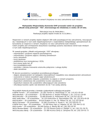 Projekt realizowany w ramach Inicjatywy na rzecz zatrudnienia ludzi młodych Małopolska Wojewódzka Komenda OHP prowadzi nabór do projektu „Obudź swój potencjał - YEI”, kierowanego do młodzieży w wieku 18-24 lata. Rekrutacja trwa do 30.04.2016 r. Realizacja projektu będzie trwała do 31.12.2016 r. Wsparciem w ramach projektu będzie objętych 200 osób pozostających bez zatrudnienia, nieuczących się i nieszkolących w tym osób niepełnosprawnych z województwa małopolskiego upoważnionych do korzystania ze wsparcia w ramach Inicjatywy na rzecz zatrudnienia ludzi młodych. Celem projektu jest zmniejszenie stosunkowo wysokiego poziomu bezrobocia wśród ludzi młodych w tym osób niepełnosprawnych. W ramach projektu „Obudź swój potencjał - YEI” oferujemy: - indywidualne i grupowe wsparcie psychologiczne - indywidualne i grupowe zajęcia z doradcą zawodowym - kursy zawodowe - kursy językowe - podstawowy kurs komputerowy i ECDL - kurs prawa jazdy kat „B” - kurs przedsiębiorczości - warsztaty z zakresu kreowania wizerunku połączone z usługą stylisty - staże zawodowe W okresie uczestnictwa w projekcie uczestnikom przysługuje: - objęcie ubezpieczeniem od następstw nieszczęśliwych wypadków oraz ubezpieczeniem zdrowotnym - wyżywienie w trakcie wszystkich zajęć szkoleniowych - dofinansowanie kosztów dojazdu uczestników na zajęcia w ramach programu - stypendium szkoleniowe dla uczestników kursów zawodowych - stypendium stażowe dla uczestników odbywających staż zawodowy - refundacja kosztów opieki nad dzieckiem do lat 7 lub osobą zależną Wszystkich chętnych prosimy o kontakt z jednostkami realizującymi projekt: CEIPM Tarnów – 20 uczestników - 33-100 Tarnów ul. Mościckiego 27, tel. (14) 621-95-64 MCK Bochnia – 20 uczestników - 32-700 Bochnia ul. Wojska Polskiego 1, tel. (14) 611-20-68 MCK Brzesko – 20 uczestników - 32-800 Brzesko ul. Piastowska 2B, tel. (14) 621-05-25 OSZ Andrychów – 20 uczestników - 34-120 Andrychów ul. Starowiejska 22B, tel. (33) 874-49-28 OSZ Kraków – 20 uczestników - 30-610 Kraków ul. Har. St. Millana 16, tel. (12) 257-00-87 MCK Chrzanów – 20 uczestników - 32-500 Chrzanów ul. Rynek 4, tel. (32) 620-02-73 CEIPM Nowy Sącz – 20 uczestników - 33-300 Nowy Sącz ul. Rejtana 18, tel. (18) 444-31-52 OSZ Gorlice – 20 uczestników - 38-300 Gorlice ul. Biecka 9B, tel. (18) 352-20-78 MCK Mszana Dolna – 20 uczestników - 32-730 Mszana Dolna ul. Matejki 11, tel. (18) 331-36-76 MCK Krynica Zdrój – 20 uczestników - 33-380 Krynica Zdrój ul. Zdrojowa 59, tel. (18) 534 92 73