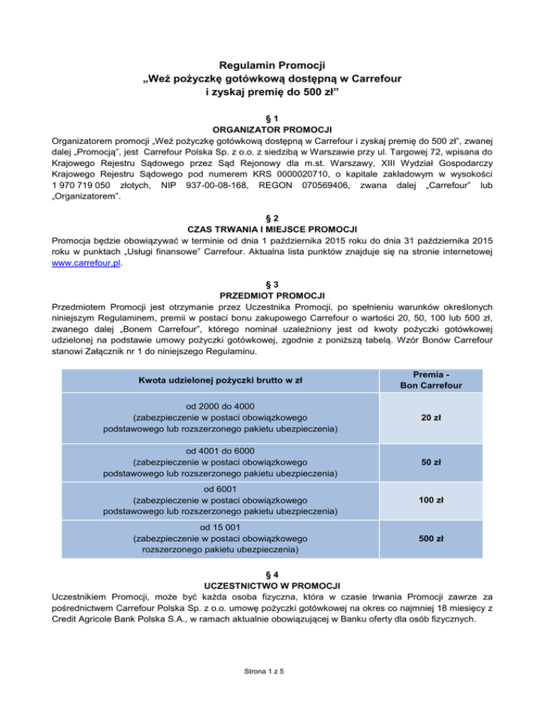 Regulamin Promocji „Weź pożyczkę gotówkową dostępną w Carrefour i zyskaj premię do 500 zł” §1 ORGANIZATOR PROMOCJI Organizatorem promocji „Weź pożyczkę gotówkową dostępną w Carrefour i zyskaj premię do 500 zł”, zwanej dalej „Promocją”, jest Carrefour Polska Sp. z o.o. z siedzibą w Warszawie przy ul. Targowej 72, wpisana do Krajowego Rejestru Sądowego przez Sąd Rejonowy dla m.st. Warszawy, XIII Wydział Gospodarczy Krajowego Rejestru Sądowego pod numerem KRS 0000020710, o kapitale zakładowym w wysokości 1 970 719 050 złotych, NIP 937-00-08-168, REGON 070569406, zwana dalej „Carrefour” lub „Organizatorem”. §2 CZAS TRWANIA I MIEJSCE PROMOCJI Promocja będzie obowiązywać w terminie od dnia 1 października 2015 roku do dnia 31 października 2015 roku w punktach „Usługi finansowe” Carrefour. Aktualna lista punktów znajduje się na stronie internetowej www.carrefour.pl. §3 PRZEDMIOT PROMOCJI Przedmiotem Promocji jest otrzymanie przez Uczestnika Promocji, po spełnieniu warunków określonych niniejszym Regulaminem, premii w postaci bonu zakupowego Carrefour o wartości 20, 50, 100 lub 500 zł, zwanego dalej „Bonem Carrefour”, którego nominał uzależniony jest od kwoty pożyczki gotówkowej udzielonej na podstawie umowy pożyczki gotówkowej, zgodnie z poniższą tabelą. Wzór Bonów Carrefour stanowi Załącznik nr 1 do niniejszego Regulaminu. Kwota udzielonej pożyczki brutto w zł Premia Bon Carrefour od 2000 do 4000 (zabezpieczenie w postaci obowiązkowego podstawowego lub rozszerzonego pakietu ubezpieczenia) 20 zł od 4001 do 6000 (zabezpieczenie w postaci obowiązkowego podstawowego lub rozszerzonego pakietu ubezpieczenia) 50 zł od 6001 (zabezpieczenie w postaci obowiązkowego podstawowego lub rozszerzonego pakietu ubezpieczenia) 100 zł od 15 001 (zabezpieczenie w postaci obowiązkowego rozszerzonego pakietu ubezpieczenia) 500 zł §4 UCZESTNICTWO W PROMOCJI Uczestnikiem Promocji, może być każda osoba fizyczna, która w czasie trwania Promocji zawrze za pośrednictwem Carrefour Polska Sp. z o.o. umowę pożyczki gotówkowej na okres co najmniej 18 miesięcy z Credit Agricole Bank Polska S.A., w ramach aktualnie obowiązującej w Banku oferty dla osób fizycznych. Strona 1 z 5 1. 2. 3. 4. 1. 2. 3. 4. 5. 3. 1. 2. 3. 4. 5. §5 ODBIÓR PREMII Z chwilą zawarcia umowy pożyczki gotówkowej w punkcie „Usługi Finansowe” Carrefour, Uczestnik Promocji otrzyma Kupon upoważniający do odebrania premii, o której mowa w § 3 powyżej, zwany dalej „Kuponem”. Wzór Kuponu stanowi Załącznik nr 2 do niniejszego Regulaminu. Bon Carrefour zostanie wydany Uczestnikowi Promocji po 30 dniach od dnia zawarcia umowy pożyczki gotówkowej na podstawie przekazanego przez Uczestnika Promocji Kuponu. Bon Carrefour zostanie wydany w punkcie „Usługi Finansowe” Carrefour, w którym Uczestnik Promocji podpisał umowę pożyczki gotówkowej. Nieodebranie Bonu Carrefour przez Uczestnika Promocji w terminie do 60 dni od daty podpisania umowy pożyczki gotówkowej jest równoznaczne z rezygnacją Uczestnika Promocji z Bonu Carrefour. §6 TRYB SKŁADANIA I ROZPATRYWANIA REKLAMACJI Każdemu Uczestnikowi Promocji przysługuje prawo wniesienia reklamacji w zakresie niezgodności przeprowadzenia Promocji z niniejszym Regulaminem, która powinna być złożona w jeden z następujących sposobów: osobiście w dowolnym punkcie „Usługi finansowe” Carrefour, telefonicznie pod numerem infolinii +48 71 799 71 30 lub 801 706 701 (opłata zgodnie z cennikiem operatora), w godz. od 7.00 do 22.00, listem wysłanym na adres Credit Agricole Bank Polska S.A., Plac Orląt Lwowskich 1, 53-605 Wrocław, z dopiskiem: „Weź pożyczkę gotówkową dostępną w Carrefour i zyskaj premię do 500 zł”; Reklamacja skierowana do Banku musi zawierać dokładne dane osobowe zgłaszającego reklamację (imię, nazwisko, pesel, adres zamieszkania wraz z kodem pocztowym reklamującego), przyczynę reklamacji, treść żądania reklamującego oraz opis okoliczności uzasadniających reklamację. Reklamacja składana w punkcie „Usługi finansowe” Carrefour musi zawierać dane osobowe zgłaszającego reklamację (imię, nazwisko, numer telefonu), przyczynę reklamacji, treść żądania reklamującego oraz opis okoliczności uzasadniających reklamację. Termin rozpatrzenia reklamacji wraz z wysłaniem odpowiedzi wynosi nie więcej niż 14 dni roboczych licząc od dnia otrzymania reklamacji, z zastrzeżeniem pkt. 5 poniżej. Jeżeli z uwagi na złożoność sprawy będącej powodem reklamacji zajdzie konieczność przeprowadzenia dodatkowego postępowania wyjaśniającego, termin, o którym mowa powyżej, może zostać przedłużony. W takim przypadku Organizator poinformuje Uczestnika o prowadzonym postępowaniu i określi nowy termin rozpatrzenia reklamacji, nie dłuższy jednak niż 30 dni. Uczestnik Promocji zostanie powiadomiony o sposobie rozpatrzenia reklamacji za pomocą listu zwykłego na adres podany przez Uczestnika Promocji lub: a) telefonicznie za pośrednictwem serwisu telefonicznego, b) poprzez wysyłkę wiadomości SMS na numer telefonu komórkowego Uczestnika Promocji. §7 BON CARREFOUR Bony Carrefour, o których mowa w § 3 są bonami na okaziciela, uprawniającymi okaziciela bonu do częściowej lub całkowitej zapłaty za zakupione produkty oferowane do sprzedaży w hipermarketach lub supermarketach Carrefour. Bony Carrefour mogą być realizowane w terminie ważności, który widnieje na bonie, jednakże nie wcześniej niż 5 dni od daty jego otrzymania. W przypadku, gdy wartość zakupionych produktów będzie niższa od wartości nominalnej Bonu Carrefour, sklep Carrefour nie zwraca różnicy pomiędzy wartością zakupionych produktów a wartością Bonu Carrefour. W przypadku, gdy wartość produktów będzie wyższa od wartości bonu Carrefour, jego okaziciel będzie zobowiązany dopłacić różnicę. Bony Carrefour nie mogą być przed