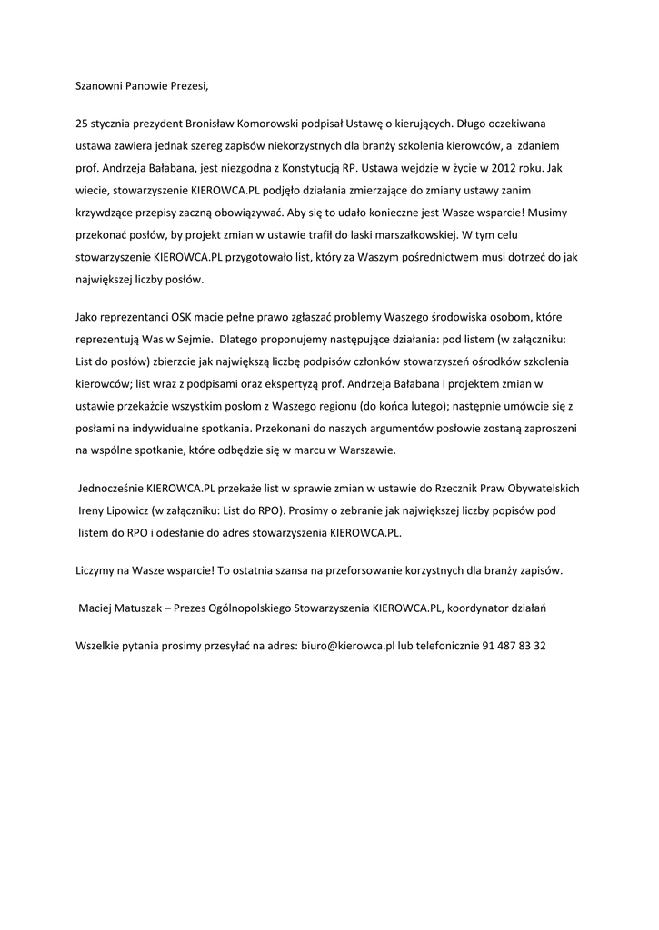 Szanowni Panowie Prezesi, 25 stycznia prezydent Bronisław Komorowski podpisał Ustawę o kierujących. Długo oczekiwana ustawa zawiera jednak szereg zapisów niekorzystnych dla branży szkolenia kierowców, a zdaniem prof. Andrzeja Bałabana, jest niezgodna z Konstytucją RP. Ustawa wejdzie w życie w 2012 roku. Jak wiecie, stowarzyszenie KIEROWCA.PL podjęło działania zmierzające do zmiany ustawy zanim krzywdzące przepisy zaczną obowiązywad. Aby się to udało konieczne jest Wasze wsparcie! Musimy przekonad posłów, by projekt zmian w ustawie trafił do laski marszałkowskiej. W tym celu stowarzyszenie KIEROWCA.PL przygotowało list, który za Waszym pośrednictwem musi dotrzed do jak największej liczby posłów. Jako reprezentanci OSK macie pełne prawo zgłaszad problemy Waszego środowiska osobom, które reprezentują Was w Sejmie. Dlatego proponujemy następujące działania: pod listem (w załączniku: List do posłów) zbierzcie jak największą liczbę podpisów członków stowarzyszeo ośrodków szkolenia kierowców; list wraz z podpisami oraz ekspertyzą prof. Andrzeja Bałabana i projektem zmian w ustawie przekażcie wszystkim posłom z Waszego regionu (do kooca lutego); następnie umówcie się z posłami na indywidualne spotkania. Przekonani do naszych argumentów posłowie zostaną zaproszeni na wspólne spotkanie, które odbędzie się w marcu w Warszawie. Jednocześnie KIEROWCA.PL przekaże list w sprawie zmian w ustawie do Rzecznik Praw Obywatelskich Ireny Lipowicz (w załączniku: List do RPO). Prosimy o zebranie jak największej liczby popisów pod listem do RPO i odesłanie do adres stowarzyszenia KIEROWCA.PL. Liczymy na Wasze wsparcie! To ostatnia szansa na przeforsowanie korzystnych dla branży zapisów. Maciej Matuszak – Prezes Ogólnopolskiego Stowarzyszenia KIEROWCA.PL, koordynator działao Wszelkie pytania prosimy przesyład na adres: [email protected] lub telefonicznie 91 487 83 32