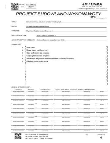 1,24x1,24 eM.FORMA Z123/12-11 12.2011 ZLECENIE : DATA : BI U R O P R O J E K T O W E e-mail: [email protected] www.emforma.pl PROJEKT BUDOWLANO-WYKONAWCZY CPV: TEMAT Remont kominów – obudowa kanałów wentylacyjnych OBIEKT Budynek mieszkalny wielorodzinny INWESTOR Wspólnota Mieszkaniowa ul. Sosnowa 5 ADRES INWESTORA 62-510 Konin, ul. Sosnowa 5 ADRES INWESTYCJI, NR DZIAŁKI Konin, ul. Sosnowa 5, działka nr ew. 72/38 ZAWARTOŚĆ: 1 Spis treści 2 Kopia mapy ewidencyjnej 3 Opis techniczny do projektu 4 Część graficzna do projektu 5 Informacja dotycząca Bezpieczeństwa i Ochrony Zdrowia 6 Oświadczenie projektanta ZESPÓŁ OPRACOWUJĄCY: Architektura Projektant Architektoniczna ZAKRES OPRACOWANIA STANOWISKO SPECJALNOŚĆ IMIĘ I NAZWISKO UPRAWNIENIA PODPIS ZAKRES OPRACOWANIA STANOWISKO SPECJALNOŚĆ IMIĘ I NAZWISKO UPRAWNIENIA PODPIS ZAKRES OPRACOWANIA STANOWISKO SPECJALNOŚĆ IMIĘ I NAZWISKO UPRAWNIENIA PODPIS ZAKRES OPRACOWANIA STANOWISKO SPECJALNOŚĆ IMIĘ I NAZWISKO UPRAWNIENIA PODPIS ZAKRES OPRACOWANIA STANOWISKO SPECJALNOŚĆ IMIĘ I NAZWISKO UPRAWNIENIA PODPIS ZAKRES OPRACOWANIA STANOWISKO SPECJALNOŚĆ IMIĘ I NAZWISKO UPRAWNIENIA PODPIS ZAKRES OPRACOWANIA STANOWISKO SPECJALNOŚĆ IMIĘ I NAZWISKO UPRAWNIENIA PODPIS ZAKRES OPRACOWANIA STANOWISKO SPECJALNOŚĆ IMIĘ I NAZWISKO UPRAWNIENIA PODPIS ZAKRES OPRACOWANIA STANOWISKO SPECJALNOŚĆ IMIĘ I NAZWISKO UPRAWNIENIA PODPIS ZAKRES OPRACOWANIA STANOWISKO SPECJALNOŚĆ IMIĘ I NAZWISKO UPRAWNIENIA PODPIS 62-513 Brzeźno, ul. Świerkowa 16 tel.: 0 606 110 786, 0 602 608 480 NIP 665-251-46-91 Regon 311626090 mgr inŜ. arch. Mikołaj Jarominiak WP-OIA/OKK/UpB/7/2007 TOM EGZEMPLARZ e Biuro projektowe eM.Forma. Remont kominów – obudowa kanałów wentylacyjnych – Konin, ul. Sosnowa 5 1. Spis treści. 1. Spis treści.................................................................................................................................. 1 2. Kopia mapy ewidencyjnej.......................................................................................................... 2 3. Opis techniczny do projektu. ..................................................................................................... 3 3.1. Przedmiot opracowania. ................................................................................................ 3 3.2. Opis budynku................................................................................................................. 3 3.3. Remont kominów........................................................................................................... 3 3.4. Sprzęt i materiały........................................................................................................... 4 3.5. Wymagania techniczno – technologiczne. .................................................................... 5 3.6. Kolorystyka. ................................................................................................................... 5 3.7. Zalecenia ogólne do wykonania robót........................................................................... 5 3.8. Uwagi końcowe. ............................................................................................................ 5 4. Część graficzna do projektu...................................................................................................... 6 4.1. Rys. nr 1 Schemat obudowy TYP A .............................................................................. 7 4.2. Rys. nr 2 Schemat obudowy TYP B .............................................................................. 8 4.3. Rys. nr 3 Czapa Ŝelbetowa obudowy TYP A................................................................. 9 4.4. Rys. nr 4 Czapa Ŝelbetowa obudowy TYP B............................................................... 10 4.5. Rys. nr 5 Przekrój I-I TYP A i B ................................................................................... 11 4.6. Rys. nr 6 Przekrój II TYP A i B .................................................................................... 12 5. Informacja dotycząca bezpieczeństwa i ochrony zdrowia. ..................................................... 13 5.1. Zakres robót przewidzianych do realizacji................................................................... 14 5.2. Wykaz istniejących obiektów....................................................................................... 14 5.3. Elementy zagospodarowania działki stwarzające zagroŜenie. ................................... 14 5.4. Przewidywane zagroŜenia, ich skala, miejsce i czas ich występowania..................... 14 5.5. InstruktaŜ. .................................................................................................................... 14 5.6. Środki techniczne i organizacyjne zapobiegające niebezpieczeństwom powstałym w wyniku prowadzonych robót. .............................................................................................. 15 6. Oświadczenie projektanta. ...................................................................................................... 16 1 Zagospodarowanie dzia³ki. Istniej¹ce zagospodarowanie dzia³ki nie ulega zmianie. Wszystkie parametry, czyli powierzchnia zabudowy oraz wysokoœæ budynku pozostaj¹ bez zmian. Oddzia³ywanie projektowanych prac remontowych kominów zamyka siê w granicach przedmiotowej dzia³ki budowlanej o nr ew. 72/38 Biuro projektowe eM.Forma. Remont kominów – obudowa kanałów wentylacyjnych – Konin, ul. Sosnowa 5 3. Opis techniczny do projektu. 3.1. Przedmiot opracowania. Przedmiotem opracowania jest projekt remontu kominów polegający na obudowaniu przewodów wentylacyjnych ponad dachem budynku mieszkalnego wielorodzinnego połoŜonego w Koninie przy ul. Sosnowej 5, działka nr 72/38. W związku z remontem kominów zachodzi konieczność wykonania obmurówki kanałów stalowych wraz czapami Ŝelbetowymi. 3.2. Opis budynku. Przedmiotowy obiekt 
