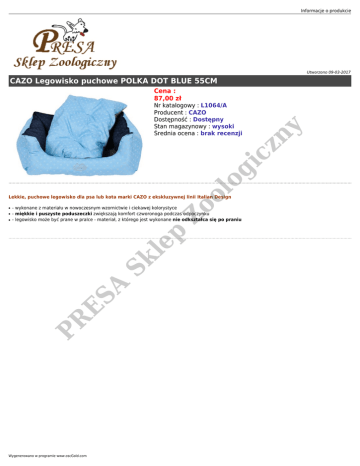 Informacje o produkcie Utworzono 09-03-2017 CAZO Legowisko puchowe POLKA DOT BLUE 55CM lo gi cz Nr katalogowy : L1064/A Producent : CAZO Dostępność : Dostępny Stan magazynowy : wysoki Średnia ocena : brak recenzji ny Cena : 87,00 zł ● ● - wykonane z materiału w nowoczesnym wzornictwie i ciekawej kolorystyce - miękkie i puszyste poduszeczki zwiększają komfort czworonoga podczas odpoczynku - legowisko może być prane w pralce - materiał, z którego jest wykonane nie odkształca się po praniu PR ES A Sk le p ● Zo o Lekkie, puchowe legowisko dla psa lub kota marki CAZO z ekskluzywnej linii Italian Design Wygenerowano w programie www.oscGold.com