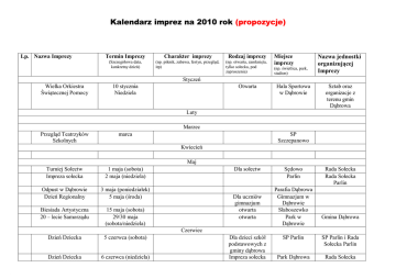 Kalendarz imprez na 2010 rok (propozycje) Lp. Nazwa Imprezy Termin Imprezy Charakter imprezy Rodzaj imprezy (Szczegółowa data, konkretny dzień) (np. piknik, zabawa, festyn, przegląd, itp) (np. otwarta, zamknięta, tylko sołecka, pod zaproszenia) Miejsce imprezy (np. świetlica, park, stadion) Nazwa jednostki organizującej Imprezy Styczeń Wielka Orkiestra Świątecznej Pomocy 10 stycznia Niedziela Otwarta Hala Sportowa w Dąbrowie Sztab oraz organizacje z terenu gmin Dąbrowa Luty Marzec Przegląd Teatrzyków Szkolnych marca SP Szczepanowo Kwiecień Maj Turniej Sołectw Impreza sołecka 1 maja (sobota) 2 maja (niedziela) Odpust w Dąbrowie Dzień Regionalny 3 maja (poniedziałek) 5 maja (środa) Biesiada Artystyczna 20 – lecie Samorządu 15 maja (sobota) 29/30 maja (sobota/niedziela) Dla sołectw Dla uczniów gimnazjum otwarta otwarta Sędowo Parlin Parafia Dąbrowa Gimnazjum w Dąbrowie Słaboszewko Park w Dąbrowie Rada Sołecka Rada Sołecka Parlin Gmina Dąbrowa Czerwiec Dzień Dziecka 5 czerwca (sobota) Dzień Dziecka 6 czerwca (niedziela) Dla dzieci szkół podstawowych z gminy dąbrowa Impreza sołecka SP Parlin SP Parlin i Rada Sołecka Parlin Park Dąbrowa Rada Sołecka Kalendarz imprez na 2010 rok (propozycje) Dzień Dziecka 5/6 czerwca otwarta Impreza sołecka Impreza sołecka 12 czerwca 12 czerwca Park w Dąbrowie Słaboszewko Parlinek Impreza sołecka 19 czerwca Sucharzewo Impreza sołecka 20 czerwca Szczepankowo Impreza sołecka 27 czerwca Szczepanowo Dąbrowa Rada sołecka Dąbrowa Rada Sołecka Rada Sołecka Parlinek Rada Sołecka Sucharzewo Rada Sołecka Szczepankowo Szczepanowo lipiec Impreza sołecka 3 lipca Krzekotowo Impreza sołecka 3 lipca Rozpoczęcie lata Przegląd Chórów 17/18 lipca Przegląd chórów Odpust Parlin Impreza sołecka 10 sierpnia 14/15 Dożynki Gminne 29 sierpnia (niedziela) Dąbrowa Dla chórów Świetlica w Szczepanowie Rada Sołecka Krzekotowo Rada Sołecka Dąbrowa Chór Seniora Szczepanowo sierpień Kościół Parlin Szczepanowo otwarta Park w Dąbrowie Parafia Parlin Rada Sołecka Szczepanowo Urząd Gminy w Dabrowie wrzesień Forum dla organizacji pozarządowych Impreza sołecka 4 września 11 września Pałac w Słaboszewku Parlinek Młode Dęby Rada Sołecka Kalendarz imprez na 2010 rok (propozycje) październik listopad grudzień