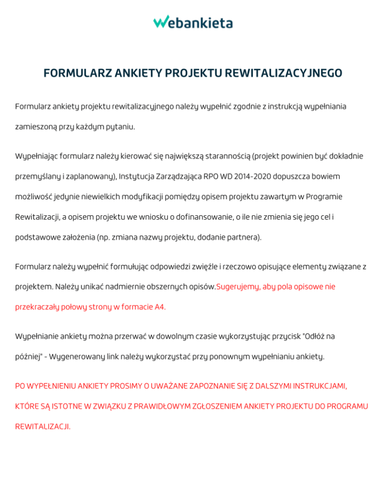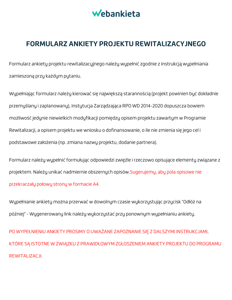 FORMULARZ ANKIETY PROJEKTU REWITALIZACYJNEGO Formularz ankiety projektu rewitalizacyjnego należy wypełnić zgodnie z instrukcją wypełniania zamieszoną przy każdym pytaniu. Wypełniając formularz należy kierować się największą starannością (projekt powinien być dokładnie przemyślany i zaplanowany), Instytucja Zarządzająca RPO WD 2014-2020 dopuszcza bowiem możliwość jedynie niewielkich modyfikacji pomiędzy opisem projektu zawartym w Programie Rewitalizacji, a opisem projektu we wniosku o dofinansowanie, o ile nie zmienia się jego cel i podstawowe założenia (np. zmiana nazwy projektu, dodanie partnera). Formularz należy wypełnić formułując odpowiedzi zwięźle i rzeczowo opisujące elementy związane z projektem. Należy unikać nadmiernie obszernych opisów.Sugerujemy, aby pola opisowe nie przekraczały połowy strony w formacie A4. Wypełnianie ankiety można przerwać w dowolnym czasie wykorzystując przycisk "Odłóż na później" - Wygenerowany link należy wykorzystać przy ponownym wypełnianiu ankiety. PO WYPEŁNIENIU ANKIETY PROSIMY O UWAŻANE ZAPOZNANIE SIĘ Z DALSZYMI INSTRUKCJAMI, KTÓRE SĄ ISTOTNE W ZWIĄZKU Z PRAWIDŁOWYM ZGŁOSZENIEM ANKIETY PROJEKTU DO PROGRAMU REWITALIZACJI. 1. Zgoda na przetwarzanie danych osobowych TAK 2. Nazwa projektu Modernizacja budynku mieszkalnego zlokalizowanego na obszarze rewitalizowanym w Kamionkach Wielkich przez Wspólnotę Mieszkaniową "Razem" 3. Dane wnioskodawcy Nawa podmiotu : Wspólnota Mieszkaniowa "Razem" Imię i nazwisko osoby do kontaktów: Jan Kowalski Kod pocztowy : 22-022 Miejscowość : Kamionki Ulica / nr domu / nr lokalu : Akacjowa 24 telefon : 601 601 601 e-mail : [email protected] 4. Czy projekt realizowany będzie w partnerstwie? Nie 5. Nazwa partnerów. nie dot. 6. Miejsce realizacji projektu (adres) Miejscowość : Kamionki Kod pocztowy : 22-022 Ulica : Akacjowa nr : 24 7. Termin rozpoczęcia realizacji projektu: 04/05/2016 8. Termin zakończenia realizacji projektu: 30/06/2017 9. Typ projektu sfera przestrzenno-funkcjonalna 10. Opis problemu jaki ma rozwiązać realizacja projektu Obiekt budynku mieszkalnego charakteryzuje się znacznym stopniem zniszczenia, który dot. głównie części wspólnych tzn. dachu oraz klatki schodowej oraz elewacji. - W zakresie dachu zniszczone jest więźba dachowa oraz poszycie dachu jak również instalacja odgromowa. Zniszczone są rynny oraz obróbka blacharska. - W zakresie klatki schodowej zniszczona jest stolarka okienna oraz schody oraz tynki. Instalacja elektryczna wymaga wymiany. Drzwi wejściowe na klatkę są zniszczone. - W zakresie elewacji wymaga ona docieplenia ze względu na niskie parametry energetyczne budynku. 11. Cel projektu Celem głównym projektu jest poprawa warunków życia mieszkańców budynku mieszkalnego w Kamionkach Wielkich, ul. Akacjowa 24 poprzez poprawę jego stanu technicznego. Cele pośrednie to: zapobieganie dalszej degradacji budynku poprzez modernizację dachu; - poprawa wydajności energetycznej budynku poprzez modernizację elewacji; - poprawa bezpieczeństwa mieszkańców poprzez modernizację instalacji elektrycznej. 12. Odbiorcy projektu Odbiorcami bezpośrednimi projektu będą mieszkańcy budynku mieszkalnego przy ul. Akacjowej 24 w Kamionkach Wielkich dzięki poprawie warunków życia w budynku. Odbiorcami pośrednimi projektu będą mieszkańcy obszaru rewitalizacyjnego poprzez poprawę wizerunku tego terenu, 13. Zakres rzeczowy projektu - Modernizacja dachu: wymiana części więźby dachowej, wymiana poszycia dachu, wymiana elementów odwodnienia budynku (rynny), naprawa instalacji odgromowej, - Klatka schodowa: wymiana stolarki okiennej, wymiana drzwi wejściowych wraz z instalacją domofonu, naprawa schodów, wymiana instalacji elektrycznej wraz z montażem energooszczędnego oświetlenia. Naprawa tynków oraz malowanie klatki schodowej. - Elewacja: naprawa elewacji poprzez docieplenie styropianem o gr. 10 cm oraz nałożenie tynków. 14. Wskaźnik produktu 57 Inny wskaźnik 15. Własny wskaźnik produktu Nazwa adekwatnego wskaźnika wraz z jednostką: Powierzchnia zmodernizowanego budynku - m2 16. Wartość wskaźnika produktu 1000 17. Wskaźniki rezultatu 25 Inny wskaźnik 18. Własny wskaźnik rezultatu Nazwa adekwatnego wskaźnika wraz z jednostką: Liczba osób zamieszkujących budynek - osoby 19. Wartość wskaźnika rezultatu 50 20. Sposób pomiaru wskaźniów Dla wskaźnika produktu - protokół odbioru Dla wskaźnika rezultatu - lista mieszkańców budynku 21. Całkowita wartość projektu (zł) 1000000 22. Wnioskowana dotacja (zł) 850000 23. Źródło finansowania ze środków UE RPO WD Działanie 6.3 Rewitalizacja zdegradowanych obszarów 24. Gotowość projektu do realizacji Wnioskodawca posiada projekt techniczny Wnioskodawca posiada pozwolenie na budowę lub dokonał zgłoszenia budowy 25. Data uzyskania lub spodziewana data uzyskania pozwolenia na budowę - jeżeli dotyczy 02/02/2016 26. Potwierdzenie prawdziwości informacji. TAK