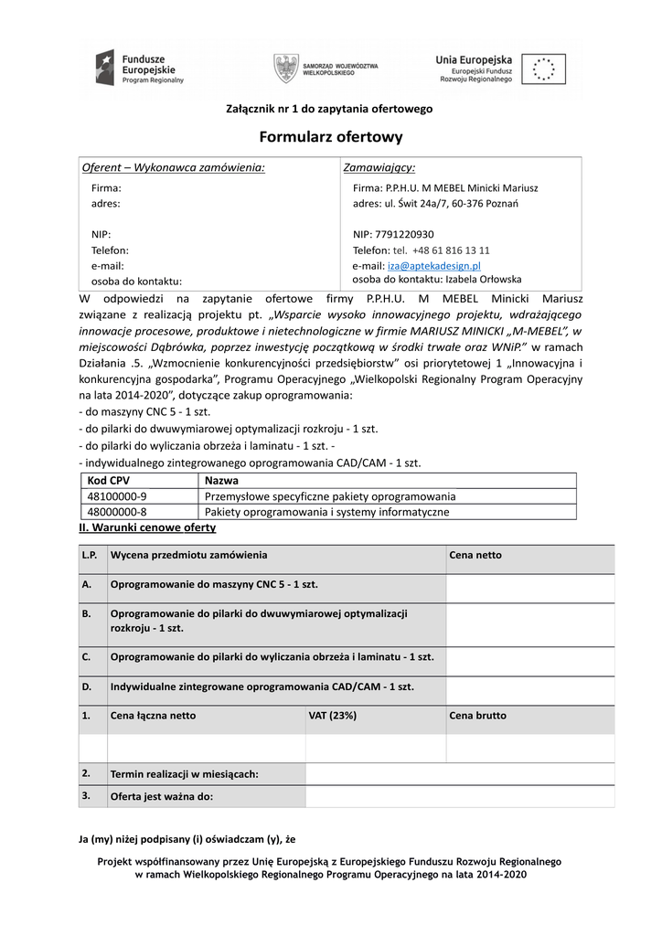 Załącznik nr 1 do zapytania ofertowego Formularz ofertowy Oferent – Wykonawca zamówienia: Zamawiający: Firma: adres: Firma: P.P.H.U. M MEBEL Minicki Mariusz adres: ul. Świt 24a/7, 60-376 Poznań NIP: Telefon: e-mail: osoba do kontaktu: NIP: 7791220930 Telefon: tel. +48 61 816 13 11 e-mail: [email protected] osoba do kontaktu: Izabela Orłowska W odpowiedzi na zapytanie ofertowe firmy P.P.H.U. M MEBEL Minicki Mariusz związane z realizacją projektu pt. „Wsparcie wysoko innowacyjnego projektu, wdrażającego innowacje procesowe, produktowe i nietechnologiczne w firmie MARIUSZ MINICKI „M-MEBEL”, w miejscowości Dąbrówka, poprzez inwestycję początkową w środki trwałe oraz WNiP.” w ramach Działania .5. „Wzmocnienie konkurencyjności przedsiębiorstw” osi priorytetowej 1 „Innowacyjna i konkurencyjna gospodarka”, Programu Operacyjnego „Wielkopolski Regionalny Program Operacyjny na lata 2014-2020”, dotyczące zakup oprogramowania: - do maszyny CNC 5 - 1 szt. - do pilarki do dwuwymiarowej optymalizacji rozkroju - 1 szt. - do pilarki do wyliczania obrzeża i laminatu - 1 szt. - indywidualnego zintegrowanego oprogramowania CAD/CAM - 1 szt. Kod CPV Nazwa 48100000-9 Przemysłowe specyficzne pakiety oprogramowania 48000000-8 Pakiety oprogramowania i systemy informatyczne II. Warunki cenowe oferty L.P. Wycena przedmiotu zamówienia Cena netto A. Oprogramowanie do maszyny CNC 5 - 1 szt. B. Oprogramowanie do pilarki do dwuwymiarowej optymalizacji rozkroju - 1 szt. C. Oprogramowanie do pilarki do wyliczania obrzeża i laminatu - 1 szt. D. Indywidualne zintegrowane oprogramowania CAD/CAM - 1 szt. 1. Cena łączna netto 2. Termin realizacji w miesiącach: 3. Oferta jest ważna do: VAT (23%) Cena brutto Ja (my) niżej podpisany (i) oświadczam (y), że Projekt współfinansowany przez Unię Europejską z Europejskiego Funduszu Rozwoju Regionalnego w ramach Wielkopolskiego Regionalnego Programu Operacyjnego na lata 2014-2020 1) Wykonawca oświadcza, że zna i akceptuje warunki realizacji zamówienia określone w zapytaniu ofertowym oraz nie wnosi żadnych zastrzeżeń i uwag w tym zakresie. 2) Wykonawca posiada uprawnienia do wykonywania określonej działalności lub czynności, jeżeli przepisy nakładają obowiązek posiadania takich uprawnień. 3) Wykonawca posiada niezbędną wiedzę i doświadczenia dotyczącą przedmiotu zamówienia. 4) Wykonawca znajdujemy się w sytuacji ekonomicznej i finansowej zapewniającej wykonanie zamówienia we wskazanych terminach. 5) Wykonawca posiada potencjał techniczny i zawodowy niezbędne dla realizacji przedmiotu zamówienia. 6) Oświadczam, iż *) (jestem/nie jestem) powiązany osobowo lub kapitałowo z Zamawiającym. Przez powiązania osobowe lub kapitałowe rozumie się wzajemne powiązania pomiędzy Zamawiającym lub osobami upoważnionymi do zaciągania zobowiązań w imieniu Zamawiającego lub osobami wykonującymi w imieniu Zamawiającego czynności związanych z przygotowaniem i przeprowadzeniem procedury wyboru Wykonawcy a Wykonawcą, polegające w szczególności na: a) uczestniczeniu w spółce jako wspólnik spółki cywilnej lub spółki osobowej; b) posiadaniu co najmniej 10% udziałów lub akcji; c) pełnieniu funkcji członka organu nadzorczego lub zarządzającego, prokurenta, pełnomocnika; d) pozostawaniu w związku małżeńskim, w stosunku pokrewieństwa lub powinowactwa w linii prostej, w stosunku pokrewieństwa lub powinowactwa w linii bocznej do drugiego stopnia lub pozostawania w stosunku przysposobienia, opieki lub kurateli; e) pozostawaniu z wykonawcą w takim stosunku prawnym lub faktycznym, że może to budzić uzasadnione wątpliwości co do bezstronności tych osób; Miejscowość . . . . . . . . . . . . . . . . . . . . . . . . dnia . . . . . . . . . . . . . . . . .................................................................................... (podpisy osób upoważnionych do reprezentacji i pieczęć wystawcy oferty) Projekt współfinansowany przez Unię Europejską z Europejskiego Funduszu Rozwoju Regionalnego w ramach Wielkopolskiego Regionalnego Programu Operacyjnego na lata 2014-2020