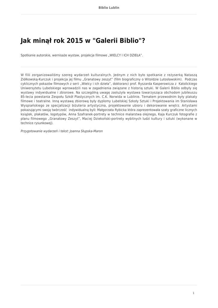 Biblio Lublin Jak minął rok 2015 w "Galerii Biblio"? Spotkanie autorskie, wernisaże wystaw, projekcje filmowe „WIELCY I ICH DZIEŁA”. W filii zorganizowaliśmy szereg wydarzeń kulturalnych. Jednym z nich było spotkanie z reżyserką Nataszą Ziółkowską-Kurczuk i projekcja jej filmu „Granatowy zeszyt” (film biograficzny o Witoldzie Lutosławskim). Podczas cyklicznych pokazów filmowych z serii „Wielcy i ich dzieła”, doktoranci prof. Ryszarda Kasperowicza z Katolickiego Uniwersytetu Lubelskiego wprowadzili nas w zagadnienia związane z historią sztuki. W Galerii Biblio odbyły się wystawy indywidualne i zbiorowe. Na szczególną uwagę zasłużyła wystawa towarzysząca obchodom jubileuszu 85-lecia powstania Zespołu Szkół Plastycznych im. C.K. Norwida w Lublinie. Tematem przewodnim były plakaty filmowe i teatralne. Inną wystawą zbiorową były dyplomy Lubelskiej Szkoły Sztuki i Projektowania im Stanisława Wyspiańskiego ze specjalizacji biżuteria artystyczna, projektowanie ubioru i dekorowanie wnętrz. Artystami pokazującymi swoją twórczość indywidualną byli: Małgorzata Rybicka która zaprezentowała szaty graficzne licznych książek, plakatów, logotypów, Anna Szafranek-portrety w technice malarstwa olejnego, Kaja Kurczuk fotografie z planu filmowego „Granatowy Zeszyt”, Maciej Dziekoński-portrety wybitnych ludzi kultury i sztuki (wykonane w technice rysunkowej). Przygotowanie wydarzeń i tekst: Joanna Słupska-Maron 1