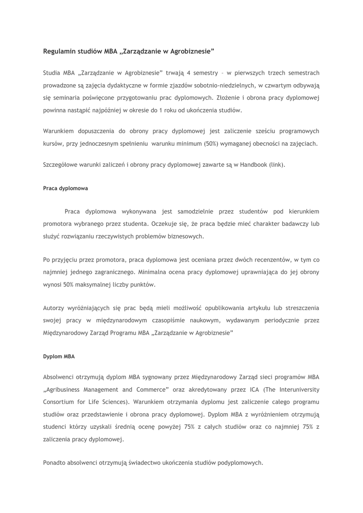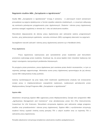 Regulamin studiów MBA „Zarządzanie w Agrobiznesie” Studia MBA „Zarządzanie w Agrobiznesie” trwają 4 semestry – w pierwszych trzech semestrach prowadzone są zajęcia dydaktyczne w formie zjazdów sobotnio-niedzielnych, w czwartym odbywają się seminaria poświęcone przygotowaniu prac dyplomowych. Złożenie i obrona pracy dyplomowej powinna nastąpić najpóźniej w okresie do 1 roku od ukończenia studiów. Warunkiem dopuszczenia do obrony pracy dyplomowej jest zaliczenie sześciu programowych kursów, przy jednoczesnym spełnieniu warunku minimum (50%) wymaganej obecności na zajęciach. Szczegółowe warunki zaliczeń i obrony pracy dyplomowej zawarte są w Handbook (link). Praca dyplomowa Praca dyplomowa wykonywana jest samodzielnie przez studentów pod kierunkiem promotora wybranego przez studenta. Oczekuje się, że praca będzie mieć charakter badawczy lub służyć rozwiązaniu rzeczywistych problemów biznesowych. Po przyjęciu przez promotora, praca dyplomowa jest oceniana przez dwóch recenzentów, w tym co najmniej jednego zagranicznego. Minimalna ocena pracy dyplomowej uprawniająca do jej obrony wynosi 50% maksymalnej liczby punktów. Autorzy wyróżniających się prac będą mieli możliwość opublikowania artykułu lub streszczenia swojej pracy w międzynarodowym czasopiśmie naukowym, wydawanym periodycznie przez Międzynarodowy Zarząd Programu MBA „Zarządzanie w Agrobiznesie” Dyplom MBA Absolwenci otrzymują dyplom MBA sygnowany przez Międzynarodowy Zarząd sieci programów MBA „Agribusiness Management and Commerce” oraz akredytowany przez ICA (The Interuniversity Consortium for Life Sciences). Warunkiem otrzymania dyplomu jest zaliczenie całego programu studiów oraz przedstawienie i obrona pracy dyplomowej. Dyplom MBA z wyróżnieniem otrzymują studenci którzy uzyskali średnią ocenę powyżej 75% z całych studiów oraz co najmniej 75% z zaliczenia pracy dyplomowej. Ponadto absolwenci otrzymują świadectwo ukończenia studiów podyplomowych.