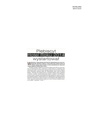 HOTELARZ 2013-12-01 Plebiscyt Hotel Roku 2014 wystartował ystartowała 3. edycja plebiscytu Hotel Roku 2014 organizowanego przez serwis rezerwacyjny HRS. Hotel Roku to plebiscyt, w którym klienci hoteli, zarówno prywatni, jak i biznesowi, glosując poprzez formularz na stronie www.hotelroku.com, mogą ocenić i wyróżnić najlepsze ich zdaniem hotele w Polsce. Warunkiem nominacji w plebiscycie jest obecność obiektu w bazie HRS oraz oceny otrzy mane od dotychczasowych gości, umieszczone w serwisie HRS.pl. Do zwycięskiego tytułu nominowanych zostało w sumie 90 hoteli w dziewięciu kategoriach: Premiera, Biznes, Najlepszy Serwis, Ekonomiczny, Luksusowy, Design, SPA, Wypoczynkowy, Palace i Zamki oraz główna kategoria - Hotel Roku 2014 (najwięcej głosów ze wszystkich kategorii). Hotele są podzielone na sieciowe i niezależne. Nowością tegorocznego konkursu są kategorie Travel Managerów, w których decyzje o przyznaniu nagród podejmować będzie specjalne jury, złożone z pracowni ków największych polskich i międzynarodowych firm, odpowiedzialnych za organizację podróży służbowych. Profesjonalne jury wybierze laureatów w trzech kategoriach: MICE, Najlepszy Serwis i Biznes. Ogłoszenie wyników plebiscytu odbędzie się w marcu. Partnerami medialnymi konkur su są „Hotelarz", „Newsweek" i „Forbes". • W