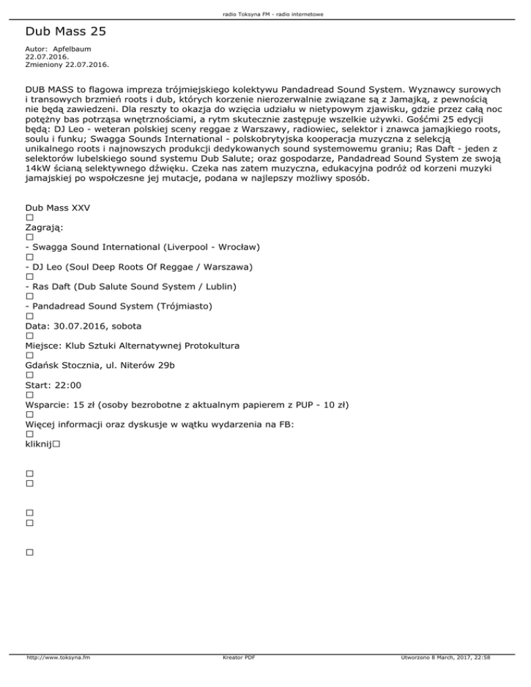 radio Toksyna FM - radio internetowe Dub Mass 25 Autor: Apfelbaum 22.07.2016. Zmieniony 22.07.2016. DUB MASS to flagowa impreza trójmiejskiego kolektywu Pandadread Sound System. Wyznawcy surowych i transowych brzmień roots i dub, których korzenie nierozerwalnie związane są z Jamajką, z pewnością nie będą zawiedzeni. Dla reszty to okazja do wzięcia udziału w nietypowym zjawisku, gdzie przez całą noc potężny bas potrząsa wnętrznościami, a rytm skutecznie zastępuje wszelkie używki. Gośćmi 25 edycji będą: DJ Leo - weteran polskiej sceny reggae z Warszawy, radiowiec, selektor i znawca jamajkiego roots, soulu i funku; Swagga Sounds International - polskobrytyjska kooperacja muzyczna z selekcją unikalnego roots i najnowszych produkcji dedykowanych sound systemowemu graniu; Ras Daft - jeden z selektorów lubelskiego sound systemu Dub Salute; oraz gospodarze, Pandadread Sound System ze swoją 14kW ścianą selektywnego dźwięku. Czeka nas zatem muzyczna, edukacyjna podróż od korzeni muzyki jamajskiej po wspołczesne jej mutacje, podana w najlepszy możliwy sposób. Dub Mass XXV Zagrają: - Swagga Sound International (Liverpool - Wrocław) - DJ Leo (Soul Deep Roots Of Reggae / Warszawa) - Ras Daft (Dub Salute Sound System / Lublin) - Pandadread Sound System (Trójmiasto) Data: 30.07.2016, sobota Miejsce: Klub Sztuki Alternatywnej Protokultura Gdańsk Stocznia, ul. Niterów 29b Start: 22:00 Wsparcie: 15 zł (osoby bezrobotne z aktualnym papierem z PUP - 10 zł) Więcej informacji oraz dyskusje w wątku wydarzenia na FB: kliknij http://www.toksyna.fm Kreator PDF Utworzono 8 March, 2017, 22:58