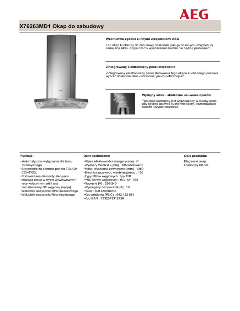 X76263MD1 Okap do zabudowy Wzornictwo zgodne z innymi urządzeniami AEG Ten okap kuchenny do zabudowy doskonale pasuje do innych urządzeń tej samej linii AEG, dzięki czemu wykończenie kuchni nie będzie problemem. Zintegrowany elektroniczny panel sterowania Zintegrowany elektroniczny panel sterowania tego okapu kuchennego pozwala wybrać dokładnie takie ustawienia, jakich potrzebujesz. Wydajny silnik - skuteczne usuwanie oparów Ten okap kuchenny jest wyposażony w mocny silnik, aby szybko usuwać kuchenne opary, pozostawiając świeże i czyste powietrze. Funkcje: Dane techniczne: Opis produktu: • Automatyczne wyłączanie dla trybu intensywnego •Sterowanie za pomocą panelu TOUCH CONTROL •Podświetlane elementy sterujące •Możliwa praca w trybie wywiewowym i recyrkulacyjnym, jeśli jest zainstalowany filtr węglowy (opcja) •Wskaźnik nasycenia filtra tłuszczowego •Wskaźnik nasycenia filtra węglowego • Klasa efektywności energetycznej : C •Wymiary WxSzxG [mm] : 1350x598x470 •Maks. wysokość zewnętrzna [mm] : 1350 •Średnica przewodu wentylacyjnego : 150 •Typy filtrów węglowych : typ 150 •PNC filtrów węglowych : 942 121 988 •Napięcie [V] : 220-240 •Wymagany bezpiecznik [A] : 10 •Kolor : stal szlachetna •Kod produktu (PNC) : 942 122 864 •Kod EAN : 7332543312726 Elegancki okap kominowy 60 cm. X76263MD1 Okap do zabudowy