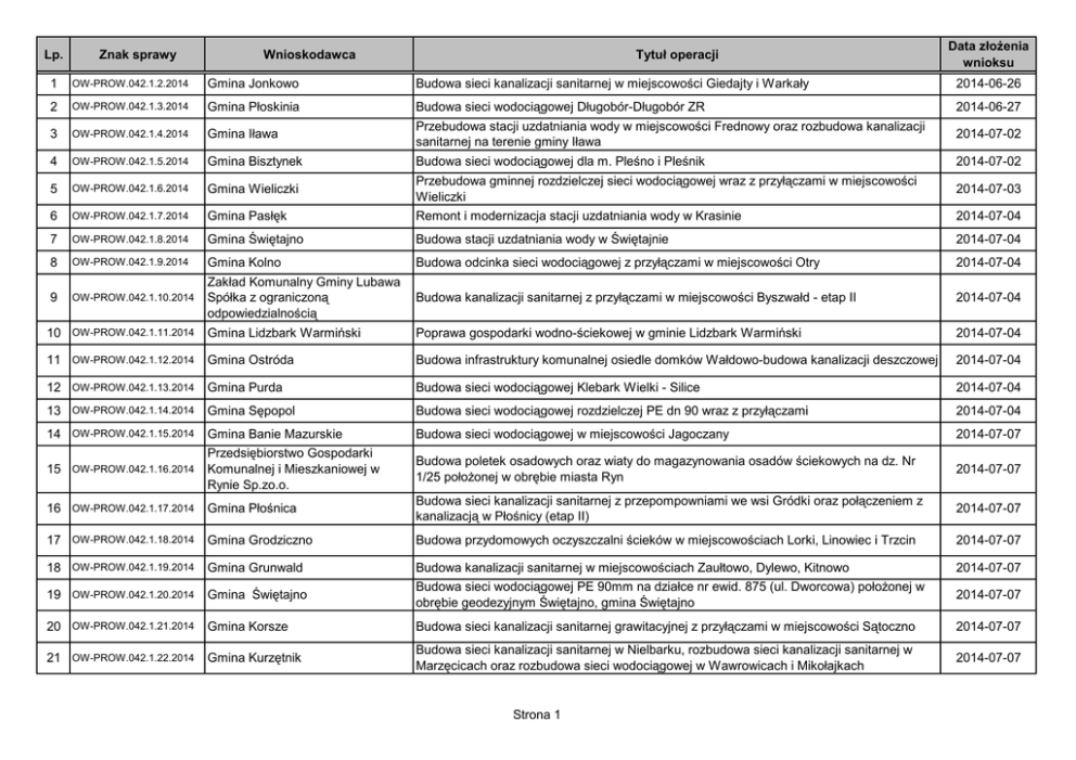 Lp. Znak sprawy Wnioskodawca Tytuł operacji Data złoŜenia wnioksu 1 OW-PROW.042.1.2.2014 Gmina Jonkowo Budowa sieci kanalizacji sanitarnej w miejscowości Giedajty i Warkały 2014-06-26 2 OW-PROW.042.1.3.2014 Gmina Płoskinia Budowa sieci wodociągowej Długobór-Długobór ZR 2014-06-27 3 OW-PROW.042.1.4.2014 Gmina Iława Przebudowa stacji uzdatniania wody w miejscowości Frednowy oraz rozbudowa kanalizacji sanitarnej na terenie gminy Iława 2014-07-02 4 OW-PROW.042.1.5.2014 Gmina Bisztynek Budowa sieci wodociągowej dla m. Pleśno i Pleśnik 2014-07-02 5 OW-PROW.042.1.6.2014 Gmina Wieliczki Przebudowa gminnej rozdzielczej sieci wodociągowej wraz z przyłączami w miejscowości Wieliczki 2014-07-03 6 OW-PROW.042.1.7.2014 Gmina Pasłęk Remont i modernizacja stacji uzdatniania wody w Krasinie 2014-07-04 7 OW-PROW.042.1.8.2014 Gmina Świętajno Budowa stacji uzdatniania wody w Świętajnie 2014-07-04 8 OW-PROW.042.1.9.2014 Gmina Kolno Budowa odcinka sieci wodociągowej z przyłączami w miejscowości Otry 2014-07-04 9 OW-PROW.042.1.10.2014 Zakład Komunalny Gminy Lubawa Spółka z ograniczoną odpowiedzialnością Budowa kanalizacji sanitarnej z przyłączami w miejscowości Byszwałd - etap II 2014-07-04 10 OW-PROW.042.1.11.2014 Gmina Lidzbark Warmiński Poprawa gospodarki wodno-ściekowej w gminie Lidzbark Warmiński 2014-07-04 11 OW-PROW.042.1.12.2014 Gmina Ostróda Budowa infrastruktury komunalnej osiedle domków Wałdowo-budowa kanalizacji deszczowej 2014-07-04 12 OW-PROW.042.1.13.2014 Gmina Purda Budowa sieci wodociągowej Klebark Wielki - Silice 2014-07-04 13 OW-PROW.042.1.14.2014 Gmina Sępopol Budowa sieci wodociągowej rozdzielczej PE dn 90 wraz z przyłączami 2014-07-04 14 OW-PROW.042.1.15.2014 Gmina Banie Mazurskie Budowa sieci wodociągowej w miejscowości Jagoczany 2014-07-07 15 OW-PROW.042.1.16.2014 Przedsiębiorstwo Gospodarki Komunalnej i Mieszkaniowej w Rynie Sp.zo.o. Budowa poletek osadowych oraz wiaty do magazynowania osadów ściekowych na dz. Nr 1/25 połoŜonej w obrębie miasta Ryn 2014-07-07 16 OW-PROW.042.1.17.2014 Gmina Płośnica Budowa sieci kanalizacji sanitarnej z przepompowniami we wsi Gródki oraz połączeniem z kanalizacją w Płośnicy (etap II) 2014-07-07 17 OW-PROW.042.1.18.2014 Gmina Grodziczno Budowa przydomowych oczyszczalni ścieków w miejscowościach Lorki, Linowiec i Trzcin 2014-07-07 18 OW-PROW.042.1.19.2014 Gmina Grunwald Budowa kanalizacji sanitarnej w miejscowościach Zaułtowo, Dylewo, Kitnowo 2014-07-07 19 OW-PROW.042.1.20.2014 Gmina Świętajno Budowa sieci wodociągowej PE 90mm na działce nr ewid. 875 (ul. Dworcowa) połoŜonej w obrębie geodezyjnym Świętajno, gmina Świętajno 2014-07-07 20 OW-PROW.042.1.21.2014 Gmina Korsze Budowa sieci kanalizacji sanitarnej grawitacyjnej z przyłączami w miejscowości Sątoczno 2014-07-07 21 OW-PROW.042.1.22.2014 Gmina Kurzętnik Budowa sieci kanalizacji sanitarnej w Nielbarku, rozbudowa sieci kanalizacji sanitarnej w Marzęcicach oraz rozbudowa sieci wodociągowej w Wawrowicach i Mikołajkach 2014-07-07 Strona 1 Lp. Znak sprawy Wnioskodawca 22 OW-PROW.042.1.23.2014 Gmina Piecki 23 OW-PROW.042.1.24.2014 Gmina Jedwabno 24 OW-PROW.042.1.25.2014 25 OW-PROW.042.1.26.2014 26 OW-PROW.042.1.27.2014 27 OW-PROW.042.1.28.2014 28 OW-PROW.042.1.29.2014 29 OW-PROW.042.1.30.2014 Tytuł operacji Budowa sieci wodociągowej rozdzielczej wraz z przyłączami w miejscowości Ostrów Pieckowski oraz remont stacji uzdatniania i ujęcia wody w Pieckach Budowa sieci wodociągowej i kanalizacji sanitarnej w miejscowościach Małszewo (zabudowa rekreacyjna) i Dzierzki oraz budowa sieci kanalizacji sanitarnej w miejscowościach Lipniki i Jedwabno Zakład BudŜetowy Gospodarki Budowa kanalizacji sanitarnej Galiny-Bartoszyce Obszar "C" obejmujący miejscowość Komunalnej i Mieszkaniowej Gminy Ciemna Wola Bartoszyce Budowa sieci kanalizacji sanitarnej grawitacyjnej i tłocznej wraz z przepompownią ścieków w Gmina Susz miejscowości Jawty Wielkie - etap I Rozwiązanie gospodarki wodno-ściekowej na terenie gminy Stawiguda poprzez budowę sieci Gmina Stawiguda kanalizacyjnej w miejscowości Ruś i Stawiguda Budowa sieci wodociągowych wraz z przyłączami zasilającymi jednostki osadnicze w Gmina Janowiec Kościelny miejscowościach Bielawy, Szczepkowo-Zalesie, Kuce oraz Zabłocie Kanigowskie i Gnidki gminy Janowiec Kościelny Budowa sieci wodociągowej i kanalizacji sanitarnej - odcinek Strzelce - Bogaczewo, Gmina Gmina GiŜycko GiŜycko Przebudowa i rozbudowa kanalizacji oraz budowa oczyszczalni ścieków w miejscowości Gmina Zalewo Jaśkowo Data złoŜenia wnioksu 2014-07-07 2014-07-07 2014-07-07 2014-07-07 2014-07-07 2014-07-07 2014-07-07 2014-07-07 30 OW-PROW.042.1.31.2014 Gmina Dźwierzuty Budowa sieci wodociągowych w miejscowości Rańsk 2014-07-07 31 OW-PROW.042.1.32.2014 Gmina Biskupiec Remont i rozbudowa infrastruktury towarzyszącej hydroforni w miejscowościach Łąkorek i Szwarcenowo oraz rozbudowa odcinka sieci wodociągowej w miejscowości Słupnica 2014-07-07 32 OW-PROW.042.1.33.2014 Gmina Gietrzwałd Budowa kanalizacji sanitarnej w m. Śródka, Gmina Gietrzwałd 2014-07-07 33 OW-PROW.042.1.34.2014 WIKOM Wodociągi i Oczyszczanie Budowa kanalizacji sanitarnej w miejscowościach: Glitajny, Parys, Równina Dolna, Równina Miasta Sp. z o.o. w Korszach Górna oraz budowa przyłącza wodociągowego w miejscowości Babieniec 34 OW-PROW.042.1.35.2014 Gmina Szczytno Rozbudowa sieci wodociągowej i sieci kanalizacji sanitarnej w msc. Rudka i Lipowa Góra Wschodnia Strona 2 2014-07-07 2014-07-07