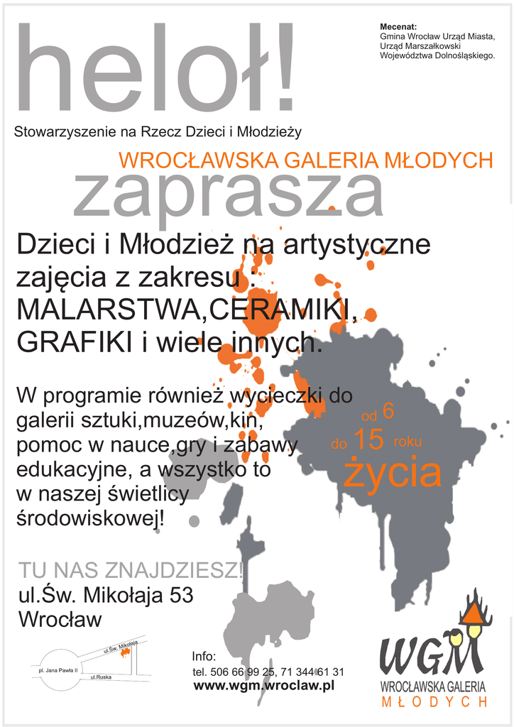 helo³! Mecenat: Gmina Wroc³aw Urz¹d Miasta, Urz¹d Marsza³kowski Województwa Dolnoœl¹skiego. Stowarzyszenie na Rzecz Dzieci i M³odzie¿y WROC£AWSKA GALERIA M£ODYCH zaprasza Dzieci i M³odzie¿ na artystyczne zajêcia z zakresu : MALARSTWA,CERAMIKI, GRAFIKI i wiele innych. W programie równie¿ wycieczki do 6 od galerii sztuki,muzeów,kin, pomoc w nauce,gry i zabawy do 15 roku edukacyjne, a wszystko to w naszej œwietlicy œrodowiskowej! ¿ycia TU NAS ZNAJDZIESZ! ul.Œw. Miko³aja 53 Wroc³aw tel. 506 66 99 25, 71 344 61 31 www.wgm.wroclaw.pl