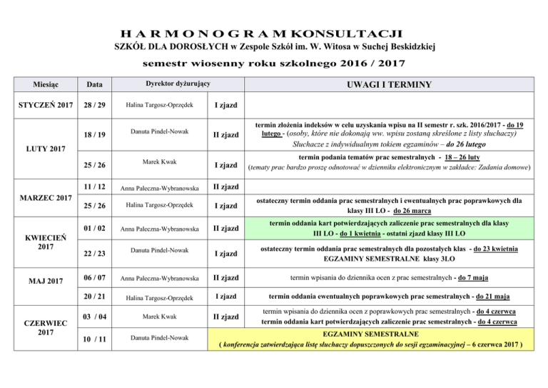 H A R M O N O G R A M KONSULTACJI SZKÓŁ DLA DOROSŁYCH w Zespole Szkół im. W. Witosa w Suchej Beskidzkiej semestr wiosenny roku szkolnego 2016 / 2017 Dyrektor dyżurujący Miesiąc Data STYCZEŃ 2017 28 / 29 Halina Targosz-Oprzędek 18 / 19 Danuta Pindel-Nowak UWAGI I TERMINY I zjazd II zjazd Słuchacze z indywidualnym tokiem egzaminów – do 26 lutego LUTY 2017 MAJ 2017 CZERWIEC 2017 termin podania tematów prac semestralnych - 18 – 26 luty (tematy prac bardzo proszę odnotować w dzienniku elektronicznym w zakładce: Zadania domowe) 25 / 26 Marek Kwak I zjazd 11 / 12 Anna Paleczna-Wybranowska II zjazd 25 / 26 Halina Targosz-Oprzędek I zjazd ostateczny termin oddania prac semestralnych i ewentualnych prac poprawkowych dla klasy III LO - do 26 marca 01 / 02 Anna Paleczna-Wybranowska II zjazd termin oddania kart potwierdzających zaliczenie prac semestralnych dla klasy III LO - do 1 kwietnia - ostatni zjazd klasy III LO 22 / 23 Danuta Pindel-Nowak I zjazd ostateczny termin oddania prac semestralnych dla pozostałych klas - do 23 kwietnia EGZAMINY SEMESTRALNE klasy 3LO 06 / 07 Anna Paleczna-Wybranowska II zjazd termin wpisania do dziennika ocen z prac semestralnych - do 7 maja 20 / 21 Halina Targosz-Oprzędek I zjazd termin oddania ewentualnych poprawkowych prac semestralnych - do 21 maja 03 / 04 Marek Kwak II zjazd termin wpisania do dziennika ocen z poprawkowych prac semestralnych - do 4 czerwca termin oddania kart potwierdzających zaliczenie prac semestralnych - do 4 czerwca 10 / 11 Danuta Pindel-Nowak MARZEC 2017 KWIECIEŃ 2017 termin złożenia indeksów w celu uzyskania wpisu na II semestr r. szk. 2016/2017 - do 19 lutego - (osoby, które nie dokonają ww. wpisu zostaną skreślone z listy słuchaczy) EGZAMINY SEMESTRALNE ( konferencja zatwierdzająca listę słuchaczy dopuszczonych do sesji egzaminacyjnej – 6 czerwca 2017 )