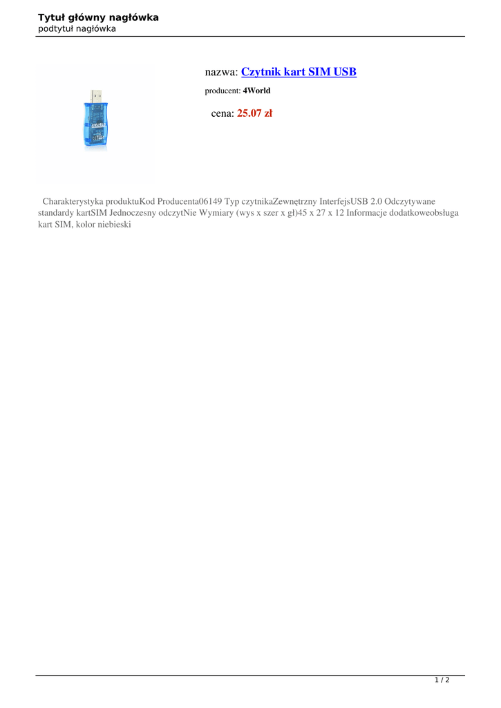 Tytuł główny nagłówka podtytuł nagłówka nazwa: Czytnik kart SIM USB producent: 4World cena: 25.07 zł Charakterystyka produktuKod Producenta06149 Typ czytnikaZewnętrzny InterfejsUSB 2.0 Odczytywane standardy kartSIM Jednoczesny odczytNie Wymiary (wys x szer x gł)45 x 27 x 12 Informacje dodatkoweobsługa kart SIM, kolor niebieski 1/2 Tytuł główny nagłówka podtytuł nagłówka nazwa Kod Producenta Wymiary (wys x szer x gł) www Interfejs Typ czytnika Odczytywane standardy kart Jednoczesny odczyt wartość 06149 45 x 27 x 12 mm http://4world.pl/categories/product/52/960 USB 2.0 Zewnętrzny SIM Nie 2/2