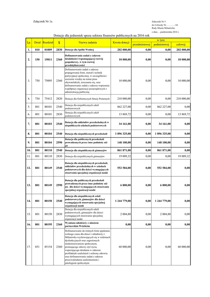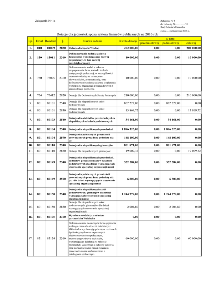 Załącznik Nr 1a Załacznik Nr 5 do Uchwały Nr ………../16 Rady Miasta Milanówka z dnia …października 2016 r. Dotacje dla jednostek spoza sektora finansów publicznych na 2016 rok Lp. Dział Rozdział § Nazwa zadania 1. 010 01009 2830 Dotacja dla Spółki Wodnej 2. 150 15011 2360 działalności wspomagającej rozwój Kwota dotacji w tym: przedmiotowej podmiotowej celowej 202 000,00 0,00 0,00 202 000,00 10 000,00 0,00 0,00 10 000,00 Dofinansowanie zadań z zakresu propagowania form, metod i technik partycypacji społecznej, w szczególności szerzenie wiedzy na temat praw obywatelskich, zrzeszania się, oraz dofinansowanie zadań z zakresu wspierania współpracy organizacji pozarządowych z administracją publiczną 10 000,00 0,00 0,00 10 000,00 210 000,00 0,00 0,00 210 000,00 Dofinansowania zadań z zakresu gospodarczy, w tym rozwój przedsiębiorczości 3. 750 75095 2360 4. 754 75412 2820 Dotacja dla Ochotniczych Straży Pożarnych 5. 801 80101 2540 Dotacja dla niepublicznych szkół podstawowych 862 227,00 0,00 862 227,00 0,00 6. 801 80101 2830 Dotacja dla niepublicznych szkół podstawowych 13 869,72 0,00 0,00 13 869,72 7. 801 80103 2540 Dotacja dla oddziałów przedszkolnych w niepubliczych szkołach podstawowych 34 161,00 0,00 34 161,00 0,00 8. 801 80104 2540 Dotacja dla niepublicznych przedszkoli 1 896 325,00 0,00 1 896 325,00 0,00 9. 801 80104 2590 prowadzonych przez inne podmioty niż 148 100,00 0,00 148 100,00 0,00 861 871,00 0,00 861 871,00 0,00 19 009,32 0,00 0,00 19 009,32 Dotacja dla publicznych przedszkoli jst 10. 801 80110 2540 Dotacja dla niepublicznych gimnazjów 11. 801 80110 2830 Dotacja dla niepublicznych gimnazjów 12. 801 80149 2540 Dotacja dla niepublicznych przedszkoli, oddziałów przedszkolnych w szkołach podstawowych dla dzieci wymagających stosowania specjalnej organizacji nauki 552 584,00 0,00 552 584,00 0,00 13. 801 80149 2590 Dotacja dla publicznych przedszkoli prowadzonych przez inne podmioty niż jst, dla dzieci wymagających stosowania specjalnej organizacji nauki 6 800,00 0,00 6 800,00 0,00 1 244 779,00 0,00 1 244 779,00 0,00 2 004,80 0,00 2 004,80 0,00 0,00 0,00 0,00 0,00 60 000,00 0,00 0,00 60 000,00 Dotacja dla niepublicznych szkół podstawowych, gimnazjów dla dzieci wymagających stosowania specjalnej organizacji nauki Dotacja dla niepublicznych szkół podstawowych, gimnazjów dla dzieci wymagających stosowania specjalnej organizacji nauki 14. 801 80150 2540 15. 801 80150 2830 16. 801 80195 2360 Wymiana młodzieży z miastem partnerskim Welzheim 2360 Dofinansowanie do różnych form spędzania wolnego czasu dla dzieci i młodzieży z Milanówka wychowujących się w rodzinach dysfunkcyjnych oraz zagrożonych niedostosowaniem społecznym, promującego zdrowy styl życia, wspierającego działania w zakresie profilaktyki uzależnień i ochrony zdrowia oraz dofinansowanie zadań z zakresu przeciwdziałania uzależnieniom i patologiom społecznym 17. 851 85154 Dofinansowanie zadań z zakresu ochrony i promocji zdrowia oraz dofinansowanie zadań z zakresu działalności na rzecz osób niepełnosprawnych 18. 851 85195 2360 19. 853 85305 2830 organizacji opieki w formie żłobka lub 45 000,00 0,00 0,00 45 000,00 156 000,00 0,00 0,00 156 000,00 16 000,00 0,00 0,00 16 000,00 Dotacja celowa na zadania z zakresu klubu dziecięcego 20. 854 85412 2360 Zadania z zakresu edukacji, oświaty i wychowania oraz dofinansowanie do wypoczynku dla dzieci i młodzieży z Milanówka poprzez organizację imprez integracyjnych, w tym kolonii, obozów 21. 900 90095 2360 Dofinansowanie zadań z zakresu ekologii i ochrony środowiska 10 000,00 0,00 0,00 10 000,00 22. 921 92120 2720 Dotacja na ochronę zabytków i opiekę nad zabytkami 45 000,00 0,00 0,00 45 000,00 23. 921 92195 2360 dóbr kultury i dziedzictwa narodowego oraz 90 000,00 0,00 0,00 90 000,00 575 000,00 0,00 0,00 575 000,00 7 070 730,84 0,00 5 608 851,80 1 461 879,04 Upowszechnianie kultury, sztuki, ochrony edukacja dorosłych 24. 926 92695 2360 Dofinansowanie zadań własnych organizacji pozarządowych na prowadzenie zajęć w zakresie kultury fizycznej, sportu i rekreacji na terenie miasta oraz podczas wyjazdów sportowych Ogółem