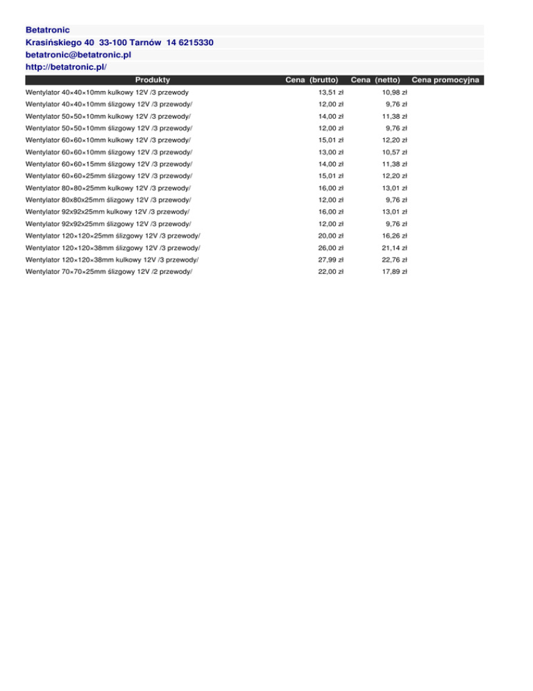 Betatronic Krasińskiego 40 33-100 Tarnów 14 6215330 [email protected] http://betatronic.pl/ Produkty Cena (brutto) Cena (netto) Wentylator 40×40×10mm kulkowy 12V /3 przewody 13,51 zł 10,98 zł Wentylator 40×40×10mm ślizgowy 12V /3 przewody/ 12,00 zł 9,76 zł Wentylator 50×50×10mm kulkowy 12V /3 przewody/ 14,00 zł 11,38 zł Wentylator 50×50×10mm ślizgowy 12V /3 przewody/ 12,00 zł 9,76 zł Wentylator 60×60×10mm kulkowy 12V /3 przewody/ 15,01 zł 12,20 zł Wentylator 60×60×10mm ślizgowy 12V /3 przewody/ 13,00 zł 10,57 zł Wentylator 60×60×15mm ślizgowy 12V /3 przewody/ 14,00 zł 11,38 zł Wentylator 60×60×25mm ślizgowy 12V /3 przewody/ 15,01 zł 12,20 zł Wentylator 80×80×25mm kulkowy 12V /3 przewody/ 16,00 zł 13,01 zł Wentylator 80x80x25mm ślizgowy 12V /3 przewody/ 12,00 zł 9,76 zł Wentylator 92x92x25mm kulkowy 12V /3 przewody/ 16,00 zł 13,01 zł Wentylator 92x92x25mm ślizgowy 12V /3 przewody/ 12,00 zł 9,76 zł Wentylator 120×120×25mm ślizgowy 12V /3 przewody/ 20,00 zł 16,26 zł Wentylator 120×120×38mm ślizgowy 12V /3 przewody/ 26,00 zł 21,14 zł Wentylator 120×120×38mm kulkowy 12V /3 przewody/ 27,99 zł 22,76 zł Wentylator 70×70×25mm ślizgowy 12V /2 przewody/ 22,00 zł 17,89 zł Cena promocyjna