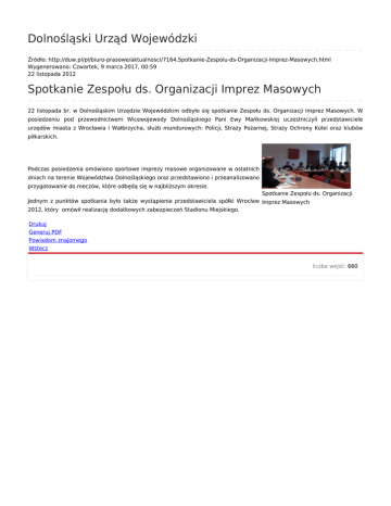 Dolnośląski Urząd Wojewódzki Źródło: http://duw.pl/pl/biuro-prasowe/aktualnosci/7164,Spotkanie-Zespolu-ds-Organizacji-Imprez-Masowych.html Wygenerowano: Czwartek, 9 marca 2017, 00:59 22 listopada 2012 Spotkanie Zespołu ds. Organizacji Imprez Masowych 22 listopada br. w Dolnośląskim Urzędzie Wojewódzkim odbyło się spotkanie Zespołu ds. Organizacji Imprez Masowych. W posiedzeniu pod przewodnictwem Wicewojewody Dolnośląskiego Pani Ewy Mańkowskiej uczestniczyli przedstawiciele urzędów miasta z Wrocławia i Wałbrzycha, służb mundurowych: Policji, Straży Pożarnej, Straży Ochrony Kolei oraz klubów piłkarskich. Podczas posiedzenia omówiono sportowe imprezy masowe organizowane w ostatnich dniach na terenie Województwa Dolnośląskiego oraz przedstawiono i przeanalizowano przygotowanie do meczów, które odbędą się w najbliższym okresie. Spotkanie Zespołu ds. Organizacji Jednym z punktów spotkania było także wystąpienie przedstawiciela spółki Wrocław Imprez Masowych 2012, który omówił realizację dodatkowych zabezpieczeń Stadionu Miejskiego. Drukuj Generuj PDF Powiadom znajomego Wstecz liczba wejść: 660