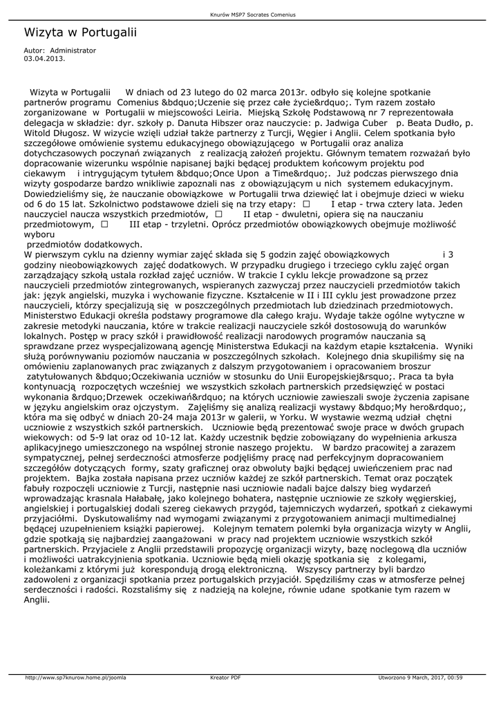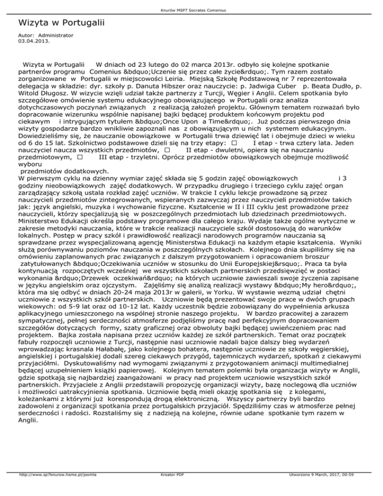 Knurów MSP7 Socrates Comenius Wizyta w Portugalii Autor: Administrator 03.04.2013. Wizyta w Portugalii W dniach od 23 lutego do 02 marca 2013r. odbyło się kolejne spotkanie partnerów programu Comenius „Uczenie się przez całe życie”. Tym razem zostało zorganizowane w Portugalii w miejscowości Leiria. Miejską Szkołę Podstawową nr 7 reprezentowała delegacja w składzie: dyr. szkoły p. Danuta Hibszer oraz nauczycie: p. Jadwiga Cuber p. Beata Dudło, p. Witold Długosz. W wizycie wzięli udział także partnerzy z Turcji, Węgier i Anglii. Celem spotkania było szczegółowe omówienie systemu edukacyjnego obowiązującego w Portugalii oraz analiza dotychczasowych poczynań związanych z realizacją założeń projektu. Głównym tematem rozważań było dopracowanie wizerunku wspólnie napisanej bajki będącej produktem końcowym projektu pod ciekawym i intrygującym tytułem „Once Upon a Time”. Już podczas pierwszego dnia wizyty gospodarze bardzo wnikliwie zapoznali nas z obowiązującym u nich systemem edukacyjnym. Dowiedzieliśmy się, że nauczanie obowiązkowe w Portugalii trwa dziewięć lat i obejmuje dzieci w wieku od 6 do 15 lat. Szkolnictwo podstawowe dzieli się na trzy etapy: · I etap - trwa cztery lata. Jeden nauczyciel naucza wszystkich przedmiotów, · II etap - dwuletni, opiera się na nauczaniu przedmiotowym, · III etap - trzyletni. Oprócz przedmiotów obowiązkowych obejmuje możliwość wyboru przedmiotów dodatkowych. W pierwszym cyklu na dzienny wymiar zajęć składa się 5 godzin zajęć obowiązkowych i3 godziny nieobowiązkowych zajęć dodatkowych. W przypadku drugiego i trzeciego cyklu zajęć organ zarządzający szkołą ustala rozkład zajęć uczniów. W trakcie I cyklu lekcje prowadzone są przez nauczycieli przedmiotów zintegrowanych, wspieranych zazwyczaj przez nauczycieli przedmiotów takich jak: język angielski, muzyka i wychowanie fizyczne. Kształcenie w II i III cyklu jest prowadzone przez nauczycieli, którzy specjalizują się w poszczególnych przedmiotach lub dziedzinach przedmiotowych. Ministerstwo Edukacji określa podstawy programowe dla całego kraju. Wydaje także ogólne wytyczne w zakresie metodyki nauczania, które w trakcie realizacji nauczyciele szkół dostosowują do warunków lokalnych. Postęp w pracy szkół i prawidłowość realizacji narodowych programów nauczania są sprawdzane przez wyspecjalizowaną agencję Ministerstwa Edukacji na każdym etapie kształcenia. Wyniki służą porównywaniu poziomów nauczania w poszczególnych szkołach. Kolejnego dnia skupiliśmy się na omówieniu zaplanowanych prac związanych z dalszym przygotowaniem i opracowaniem broszur zatytułowanych „Oczekiwania uczniów w stosunku do Unii Europejskiej’. Praca ta była kontynuacją rozpoczętych wcześniej we wszystkich szkołach partnerskich przedsięwzięć w postaci wykonania ”Drzewek oczekiwań” na których uczniowie zawieszali swoje życzenia zapisane w języku angielskim oraz ojczystym. Zajęliśmy się analizą realizacji wystawy „My hero”, która ma się odbyć w dniach 20-24 maja 2013r w galerii, w Yorku. W wystawie wezmą udział chętni uczniowie z wszystkich szkół partnerskich. Uczniowie będą prezentować swoje prace w dwóch grupach wiekowych: od 5-9 lat oraz od 10-12 lat. Każdy uczestnik będzie zobowiązany do wypełnienia arkusza aplikacyjnego umieszczonego na wspólnej stronie naszego projektu. W bardzo pracowitej a zarazem sympatycznej, pełnej serdeczności atmosferze podjęliśmy pracę nad perfekcyjnym dopracowaniem szczegółów dotyczących formy, szaty graficznej oraz obwoluty bajki będącej uwieńczeniem prac nad projektem. Bajka została napisana przez uczniów każdej ze szkół partnerskich. Temat oraz początek fabuły rozpoczęli uczniowie z Turcji, następnie nasi uczniowie nadali bajce dalszy bieg wydarzeń wprowadzając krasnala Hałabałę, jako kolejnego bohatera, następnie uczniowie ze szkoły węgierskiej, angielskiej i portugalskiej dodali szereg ciekawych przygód, tajemniczych wydarzeń, spotkań z ciekawymi przyjaciółmi. Dyskutowaliśmy nad wymogami związanymi z przygotowaniem animacji multimedialnej będącej uzupełnieniem książki papierowej. Kolejnym tematem polemki była organizacja wizyty w Anglii, gdzie spotkają się najbardziej zaangażowani w pracy nad projektem uczniowie wszystkich szkół partnerskich. Przyjaciele z Anglii przedstawili propozycję organizacji wizyty, bazę noclegową dla uczniów i możliwości uatrakcyjnienia spotkania. Uczniowie będą mieli okazję spotkania się z kolegami, koleżankami z którymi już korespondują drogą elektroniczną. Wszyscy partnerzy byli bardzo zadowoleni z organizacji spotkania przez portugalskich przyjaciół. Spędziliśmy czas w atmosferze pełnej serdeczności i radości. Rozstaliśmy się z nadzieją na kolejne, równie udane spotkanie tym razem w Anglii. http://www.sp7knurow.home.pl/joomla Kreator PDF Utworzono 9 March, 2017, 00:59