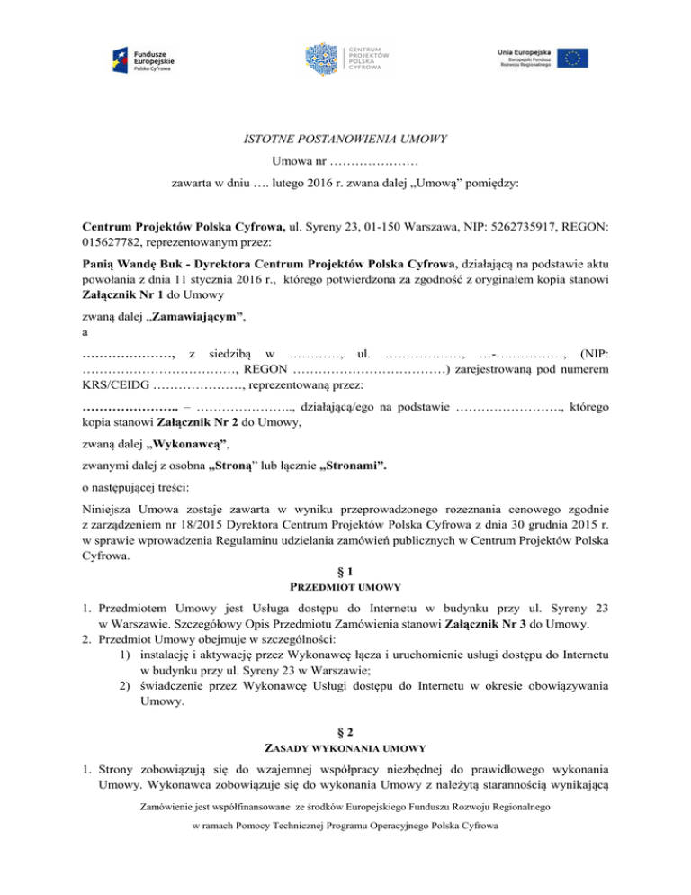 ISTOTNE POSTANOWIENIA UMOWY Umowa nr ………………… zawarta w dniu …. lutego 2016 r. zwana dalej „Umową” pomiędzy: Centrum Projektów Polska Cyfrowa, ul. Syreny 23, 01-150 Warszawa, NIP: 5262735917, REGON: 015627782, reprezentowanym przez: Panią Wandę Buk - Dyrektora Centrum Projektów Polska Cyfrowa, działającą na podstawie aktu powołania z dnia 11 stycznia 2016 r., którego potwierdzona za zgodność z oryginałem kopia stanowi Załącznik Nr 1 do Umowy zwaną dalej „Zamawiającym”, a …………………, z siedzibą w …………, ul. ………………, …-….…………, (NIP: ………………………………, REGON ………………………………) zarejestrowaną pod numerem KRS/CEIDG …………………, reprezentowaną przez: ………………….. – ………………….., działającą/ego na podstawie ……………………., którego kopia stanowi Załącznik Nr 2 do Umowy, zwaną dalej „Wykonawcą”, zwanymi dalej z osobna „Stroną” lub łącznie „Stronami”. o następującej treści: Niniejsza Umowa zostaje zawarta w wyniku przeprowadzonego rozeznania cenowego zgodnie z zarządzeniem nr 18/2015 Dyrektora Centrum Projektów Polska Cyfrowa z dnia 30 grudnia 2015 r. w sprawie wprowadzenia Regulaminu udzielania zamówień publicznych w Centrum Projektów Polska Cyfrowa. §1 PRZEDMIOT UMOWY 1. Przedmiotem Umowy jest Usługa dostępu do Internetu w budynku przy ul. Syreny 23 w Warszawie. Szczegółowy Opis Przedmiotu Zamówienia stanowi Załącznik Nr 3 do Umowy. 2. Przedmiot Umowy obejmuje w szczególności: 1) instalację i aktywację przez Wykonawcę łącza i uruchomienie usługi dostępu do Internetu w budynku przy ul. Syreny 23 w Warszawie; 2) świadczenie przez Wykonawcę Usługi dostępu do Internetu w okresie obowiązywania Umowy. §2 ZASADY WYKONANIA UMOWY 1. Strony zobowiązują się do wzajemnej współpracy niezbędnej do prawidłowego wykonania Umowy. Wykonawca zobowiązuje się do wykonania Umowy z należytą starannością wynikającą Zamówienie jest współfinansowane ze środków Europejskiego Funduszu Rozwoju Regionalnego w ramach Pomocy Technicznej Programu Operacyjnego Polska Cyfrowa 2. 3. 4. 5. z profesjonalnego charakteru prowadzonej przez niego działalności, zgodnie z zasadami współczesnej wiedzy technicznej i stosowanymi normami technicznymi. Wykonawca zobowiązuje się do wykonania przedmiotu Umowy zgodnie ze szczegółowymi wymaganiami dotyczącymi zakresu, treści i formy określonymi w Załączniku Nr 3 do Umowy oraz zgodnie z ofertą Wykonawcy stanowiącą Załącznik Nr 5 do Umowy, w sposób, który będzie kompletny i wyczerpujący z punktu widzenia celu, któremu przedmiot Umowy ma służyć. Wykonawca zobowiązuje się do wykonania Umowy przy użyciu własnych materiałów, urządzeń i środków. Wykonawca zobowiązuje się świadczyć Usługi 24 godziny na dobę, przez 7 dni w tygodniu w okresie realizacji Umowy. Wykonawca oświadcza, że dysponuje wszelkimi niezbędnymi informacjami i pozwoleniami wymaganymi przez przepisy prawa w dziedzinach związanych z wykonaniem przedmiotu Umowy, a także dysponuje odpowiednim personelem i odpowiednimi środkami gwarantującymi profesjonalną realizację Umowy. §3 TERMIN REALIZACJI UMOWY 1. Umowa zostaje zawarta na czas określony do dnia 17 października 2016 r. 2. Wykonawca zobowiązuje się do wykonania czynności wskazanych w § 1 ust. 2 pkt 1 w terminie umożliwiającym rozpoczęcie świadczenia Usługi, o której mowa w § 1 ust. 2 pkt 2 od dnia 1 marca 2016 r. od godziny 00.00. §4 PODWYKONAWCY 1. Wykonawca może zlecić podwykonawcom jedynie te części (zakresy) prac, które zostały wskazane przez niego w ofercie. Wykonawca będzie samodzielnie świadczył usługę dostępu do Internetu. Wykonawca jest odpowiedzialny za działania, uchybienia i zaniedbania każdego podwykonawcy i jego pracowników tak, jakby to były działania, zaniechania, uchybienia i zaniedbania jego i jego własnych pracowników lub przedstawicieli. 2. Wykonawca jest zobowiązany pisemnie zawiadomić Zamawiającego o danych podwykonawców. 3. Wykonawca zobowiązany jest pisemnie poinformować podwykonawców o warunkach niniejszej umowy oraz zapewnia, że podwykonawcy zobowiązani będą do stosowania wszelkich warunków i zobowiązań ciążących na Wykonawcy na jej podstawie. §5 REALIZACJA I ODBIÓR PRZEDMIOTU UMOWY 1. Prawidłowa realizacja przez Wykonawcę czynności, o których mowa w § 1 ust. 2 pkt 1 oraz rozpoczęcia świadczenia Usług przez Wykonawcę zostanie potwierdzone podpisanym przez Strony Protokołem Odbioru, którego wzór stanowi Załącznik Nr 4 do Umowy. 2. Zamawiający podpisze Protokół Odbioru lub zgłosi zastrzeżenia. Zastrzeżenia mogą być zgłoszone mailem lub faxem na adresy i numery wskazane w § 5 ust. 7 pkt 2. 3. W przypadku zgłoszenia zastrzeżeń ze strony Zamawiającego, Wykonawca na własny koszt i ryzyko zobowiązany jest do ich uwzględnia w całości. W takim przypadku procedura odbioru Zamówienie jest współfinansowane ze środków Europejskiego Funduszu Rozwoju Regionalnego w ramach Pomocy Technicznej Programu Operacyjnego Polska Cyfrowa 4. 5. 6. 7. 8. zostanie przeprowadzona ponownie, stosownie do postanowień niniejszego paragrafu; za datę odbioru uważa się datę odbioru poprawionego, uwzględniającego wszystkie zastrzeżenia Zamawiającego. Protokół Odbioru, o których mowa w ust. 1 zostanie wystawiany w 2 (dwóch) jednobrzmiących egzemplarzach (jeden egzemplarz dla Wykonawcy i jeden egzemplarz dla Zamawiającego). W przypadku zaistnienia nie dających się usunąć wad Zamawiający ma prawo: 1) żądać obniżenia wynagrodzenia, o ile wady nie mają wpływu na użytkowanie przedmiotu umowy zgodnie z przeznaczeniem, 2) żądać wykonania przedmiotu umowy od nowa lub odstąpić od umowy z winy Wykonawcy, o ile wady uniemożliwiają użytkowanie przedmiotu umowy zgodnie z przeznaczeniem. Wykonawca zobowi