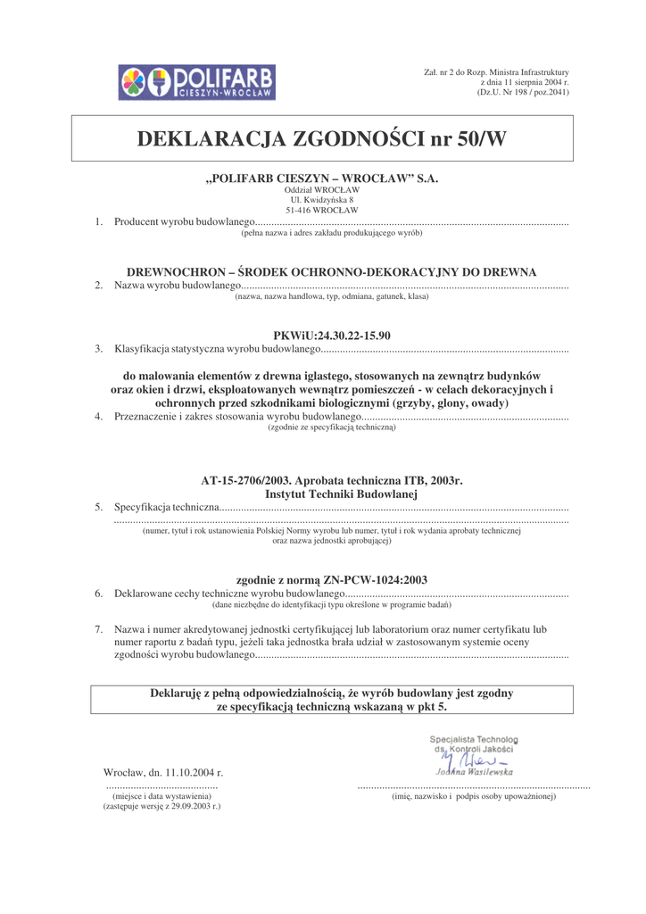 Zał. nr 2 do Rozp. Ministra Infrastruktury z dnia 11 sierpnia 2004 r. (Dz.U. Nr 198 / poz.2041) DEKLARACJA ZGODNO CI nr 50/W „POLIFARB CIESZYN – WROCŁAW” S.A. Oddział WROCŁAW Ul. Kwidzy ska 8 51-416 WROCŁAW 1. Producent wyrobu budowlanego................................................................................................................... 2. Nazwa wyrobu budowlanego........................................................................................................................ 3. Klasyfikacja statystyczna wyrobu budowlanego........................................................................................... 4. 5. (pełna nazwa i adres zakładu produkuj cego wyrób) DREWNOCHRON – RODEK OCHRONNO-DEKORACYJNY DO DREWNA (nazwa, nazwa handlowa, typ, odmiana, gatunek, klasa) PKWiU:24.30.22-15.90 do malowania elementów z drewna iglastego, stosowanych na zewn trz budynków oraz okien i drzwi, eksploatowanych wewn trz pomieszcze - w celach dekoracyjnych i ochronnych przed szkodnikami biologicznymi (grzyby, glony, owady) Przeznaczenie i zakres stosowania wyrobu budowlanego............................................................................ (zgodnie ze specyfikacj techniczn ) AT-15-2706/2003. Aprobata techniczna ITB, 2003r. Instytut Techniki Budowlanej Specyfikacja techniczna................................................................................................................................ ....................................................................................................................................................................... (numer, tytuł i rok ustanowienia Polskiej Normy wyrobu lub numer, tytuł i rok wydania aprobaty technicznej oraz nazwa jednostki aprobuj cej) zgodnie z norm ZN-PCW-1024:2003 6. Deklarowane cechy techniczne wyrobu budowlanego.................................................................................. 7. Nazwa i numer akredytowanej jednostki certyfikuj cej lub laboratorium oraz numer certyfikatu lub numer raportu z bada typu, je eli taka jednostka brała udział w zastosowanym systemie oceny zgodno ci wyrobu budowlanego................................................................................................................... (dane niezb dne do identyfikacji typu okre lone w programie bada ) Deklaruj z pełn odpowiedzialno ci , e wyrób budowlany jest zgodny ze specyfikacj techniczn wskazan w pkt 5. Wrocław, dn. 11.10.2004 r. ......................................... (miejsce i data wystawienia) (zast puje wersj z 29.09.2003 r.) ...................................................................................... (imi , nazwisko i podpis osoby upowa nionej) Zał. nr 2 do Rozp. Ministra Infrastruktury z dnia 11 sierpnia 2004 r. (Dz.U. Nr 198 / poz.2041) DEKLARACJA ZGODNO CI nr 64/W „POLIFARB CIESZYN – WROCŁAW” S.A. Oddział WROCŁAW Ul. Kwidzy ska 8 51-416 WROCŁAW 1. Producent wyrobu budowlanego................................................................................................................... 2. Nazwa wyrobu budowlanego........................................................................................................................ 3. Klasyfikacja statystyczna wyrobu budowlanego........................................................................................... 4. Przeznaczenie i zakres stosowania wyrobu budowlanego............................................................................ 5. (pełna nazwa i adres zakładu produkuj cego wyrób) DREWNOCHRON IMPREGNAT PREMIUM Z WOSKIEM (nazwa, nazwa handlowa, typ, odmiana, gatunek, klasa) PKWiU: 24.30.22-15.90 do malowania powierzchni drewnianych lub drewnopochodnych (zgodnie ze specyfikacj techniczn ) PN-C-81753:2002 Impregnaty ochronno-dekoracyjne (Rodzaj A: ochronno-dekoracyjne, przeznaczone do malowania powierzchni drewnianych lub drewnopochodnych) Specyfikacja techniczna................................................................................................................................ (numer, tytuł i rok ustanowienia Polskiej Normy wyrobu lub numer, tytuł i rok wydania aprobaty technicznej oraz nazwa jednostki aprobuj cej) ....................................................................................................................................................................... zgodnie z norm ZN-PCW-2228:2005 6. Deklarowane cechy techniczne wyrobu budowlanego.................................................................................. 7. Nazwa i numer akredytowanej jednostki certyfikuj cej lub laboratorium oraz numer certyfikatu lub numer raportu z bada typu, je eli taka jednostka brała udział w zastosowanym systemie oceny zgodno ci wyrobu budowlanego................................................................................................................... (dane niezb dne do identyfikacji typu okre lone w programie bada ) Deklaruj z pełn odpowiedzialno ci , e wyrób budowlany jest zgodny ze specyfikacj techniczn wskazan w pkt 5. Wrocław, dn. 13.04.2005r. ......................................... (miejsce i data wystawienia) ...................................................................................... (imi , nazwisko i podpis osoby upowa nionej) Zał. nr 2 do Rozp. Ministra Infrastruktury z dnia 11 sierpnia 2004 r. (Dz.U. Nr 198 / poz.2041) DEKLARACJA ZGODNO CI nr 48/W „POLIFARB CIESZYN – WROCŁAW” S.A. Oddział WROCŁAW Ul. Kwidzy ska 8 51-416 WROCŁAW 1. Producent wyrobu budowlanego................................................................................................................... 2. Nazwa wyrobu budowlanego........................................................................................................................ 3. Klasyfikacja statystyczna wyrobu budowlanego........................................................................................... 4. 5. (pełna nazwa i adres zakładu produkuj cego wyr