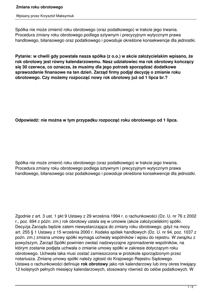 Zmiana roku obrotowego Wpisany przez Krzysztof Maksymiuk Spółka nie może zmienić roku obrotowego (oraz podatkowego) w trakcie jego trwania. Procedura zmiany roku obrotowego podlega sztywnym i precyzyjnym wytycznym prawa handlowego, bilansowego oraz podatkowego i powoduje określone konsekwencje dla jednostki. Pytanie: w chwili gdy powstała nasza spółka (z o.o.) w akcie założycielskim wpisano, że rok obrotowy jest równy kalendarzowemu. Nasz udziałowiec ma rok obrotowy kończący się 30 czerwca, co oznacza, że musimy dla jego potrzeb sporządzać dodatkowe sprawozdanie finansowe na ten dzień. Zarząd firmy podjął decyzję o zmianie roku obrotowego. Czy możemy rozpocząć nowy rok obrotowy już od 1 lipca br.? Odpowiedź: nie można w tym przypadku rozpocząć roku obrotowego od 1 lipca. Spółka nie może zmienić roku obrotowego (oraz podatkowego) w trakcie jego trwania. Procedura zmiany roku obrotowego podlega sztywnym i precyzyjnym wytycznym prawa handlowego, bilansowego oraz podatkowego i powoduje określone konsekwencje dla jednostki. Zgodnie z art. 3 ust. 1 pkt 9 Ustawy z 29 września 1994 r. o rachunkowości (Dz. U. nr 76 z 2002 r., poz. 694 z późn. zm.) rok obrotowy ustala się w umowie (akcie założycielskim) spółki. Decyzja Zarządu będzie zatem niewystarczająca do zmiany roku obrotowego, gdyż na mocy art. 255 § 1 Ustawy z 15 września 2000 r. Kodeks spółek handlowych (Dz. U. nr 94, poz. 1037 z poźn. zm.) zmiana umowy spółki wymaga uchwały wspólników i wpisu do rejestru. W związku z powyższym, Zarząd Spółki powinien zwołać nadzwyczajne zgromadzenie wspólników, na którym zostanie podjęta uchwała o zmianie umowy spółki w zakresie dotyczącym roku obrotowego. Uchwała taka musi zostać zamieszczona w protokole sporządzonym przez notariusza. Zmianę umowy spółki należy zgłosić do Krajowego Rejestru Sądowego. Ustawa o rachunkowości definiuje rok obrotowy jako rok kalendarzowy lub inny okres trwający 12 kolejnych pełnych miesięcy kalendarzowych, stosowany również do celów podatkowych. W 1/3 Zmiana roku obrotowego Wpisany przez Krzysztof Maksymiuk przypadku zmiany roku obrotowego pierwszy po zmianie rok obrotowy powinien być dłuższy niż 12 kolejnych miesięcy. Podobne regulacje zawiera Ustawa z dnia 15 lutego 1992 r. o podatku dochodowym od osób prawnych (Dz. U. nr 54 z 2000 r., poz. 654 z późn. zm.), która w art. 8 ust. 1 stwierdza, że rokie m podatkowym jest rok kalendarzowy, chyba że podatnik postanowi inaczej w umowie spółki i zawiadomi o tym właściwego naczelnika urzędu skarbowego; wówczas rokiem podatkowym jest okres kolejnych dwunastu miesięcy kalendarzowych. W razie zmiany roku podatkowego, za pierwszy po zmianie rok podatkowy uważa się okres od pierwszego miesiąca następującego po zakończeniu poprzedniego roku podatkowego do końca roku nowo przyjętego. Okres ten nie może być krótszy niż dwanaście i dłuższy niż dwadzieścia trzy kolejne miesiące kalendarzowe. Zawiadomienia o zmianie roku podatkowego należy dokonać najpóźniej w terminie 30 dni, licząc od dnia zakończenia ostatniego roku podatkowego, czyli do 30 stycznia 2008 r. w przedstawionym przypadku. Do zawiadomienia należy dołączyć odpis uchwały o zmianie umowy spółki (w ciągu dwóch tygodni od zarejestrowania zmiany umowy w KRS). Uwaga: w opisanym wyżej przypadku, po spełnieniu wymogów formalnych, bieżący rok obrotowy (i podatkowy) Spółki Czytelnika zakończy się 31 grudnia 2007 r., kolejny obejmie okres 1 stycznia 2008 r. - 30 czerwca 2009 r., a następny - 1 lipca 2009 r. - 30 czerwca 2010 r. itd. Oznacza to, że Spółka będzie prowadzić księgi za kolejny rok obrotowy przez okres dłuższy niż 12 miesięcy i dopiero upływ tego okresu będzie umożliwiał ich zamknięcie i otwarcie ksiąg nowego (trwającego już 12 miesięcy) roku obrotowego. W roku „przejściowym" Spółka będzie zobowiązana do opłacania comiesięcznych zaliczek na podatek dochodowy od osób prawnych przez dłuższy okres (do maja 2009 r.), a termin złożenia zeznania rocznego CIT-8 za ten rok przypadnie na 30 września 2009 r. Sprawozdanie finansowe za ten rok będzie podlegać zatwierdzeniu do 31 grudnia 2009 r. Gdyby Spółka sporządzała swoje sprawozdanie według Międzynarodowych Standardów Rachunkowości, powinna dokonać dodatkowych ujawnień. MSR 1 par. 49 stanowi, że odstępstwo od generalnej zasady sporządzenia sprawozdania za okresy roczne wymaga 2/3 Zmiana roku obrotowego Wpisany przez Krzysztof Maksymiuk podania, tak jak w sprawozdaniu sporządzonym według Ustawy o rachunkowości, okresu objętego sprawozdaniem. Ponadto, Spółka powinna ujawnić przyczynę zastosowania dłuższego od jednego roku okresu sprawozdawczego oraz fakt, że dane dotyczące okresu poprzedzającego (dane porównawcze) w rachunku zysków i strat, zestawieniu zmian w kapitale własnym, rachunku przepływów pieniężnych i informacji dodatkowej nie są całkowicie porównywalne. 3/3