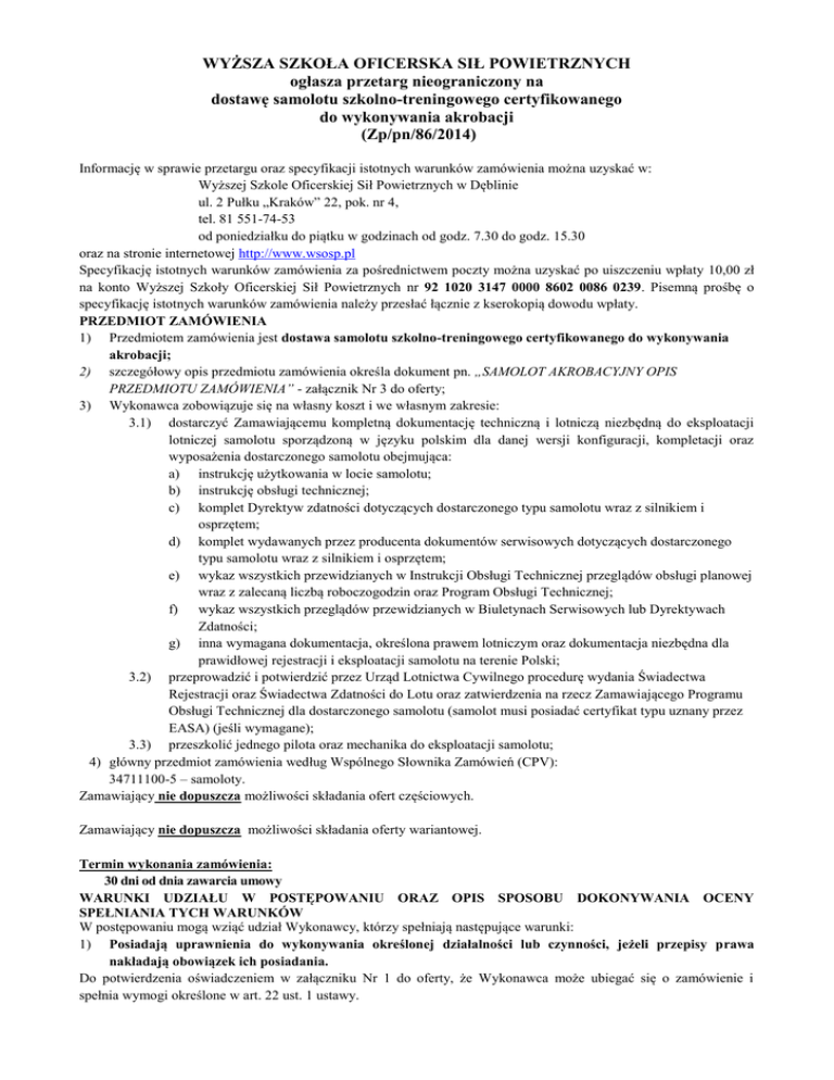 WYŻSZA SZKOŁA OFICERSKA SIŁ POWIETRZNYCH ogłasza przetarg nieograniczony na dostawę samolotu szkolno-treningowego certyfikowanego do wykonywania akrobacji (Zp/pn/86/2014) Informację w sprawie przetargu oraz specyfikacji istotnych warunków zamówienia można uzyskać w: Wyższej Szkole Oficerskiej Sił Powietrznych w Dęblinie ul. 2 Pułku „Kraków” 22, pok. nr 4, tel. 81 551-74-53 od poniedziałku do piątku w godzinach od godz. 7.30 do godz. 15.30 oraz na stronie internetowej http://www.wsosp.pl Specyfikację istotnych warunków zamówienia za pośrednictwem poczty można uzyskać po uiszczeniu wpłaty 10,00 zł na konto Wyższej Szkoły Oficerskiej Sił Powietrznych nr 92 1020 3147 0000 8602 0086 0239. Pisemną prośbę o specyfikację istotnych warunków zamówienia należy przesłać łącznie z kserokopią dowodu wpłaty. PRZEDMIOT ZAMÓWIENIA 1) Przedmiotem zamówienia jest dostawa samolotu szkolno-treningowego certyfikowanego do wykonywania akrobacji; 2) szczegółowy opis przedmiotu zamówienia określa dokument pn. „SAMOLOT AKROBACYJNY OPIS PRZEDMIOTU ZAMÓWIENIA” - załącznik Nr 3 do oferty; 3) Wykonawca zobowiązuje się na własny koszt i we własnym zakresie: 3.1) dostarczyć Zamawiającemu kompletną dokumentację techniczną i lotniczą niezbędną do eksploatacji lotniczej samolotu sporządzoną w języku polskim dla danej wersji konfiguracji, kompletacji oraz wyposażenia dostarczonego samolotu obejmująca: a) instrukcję użytkowania w locie samolotu; b) instrukcję obsługi technicznej; c) komplet Dyrektyw zdatności dotyczących dostarczonego typu samolotu wraz z silnikiem i osprzętem; d) komplet wydawanych przez producenta dokumentów serwisowych dotyczących dostarczonego typu samolotu wraz z silnikiem i osprzętem; e) wykaz wszystkich przewidzianych w Instrukcji Obsługi Technicznej przeglądów obsługi planowej wraz z zalecaną liczbą roboczogodzin oraz Program Obsługi Technicznej; f) wykaz wszystkich przeglądów przewidzianych w Biuletynach Serwisowych lub Dyrektywach Zdatności; g) inna wymagana dokumentacja, określona prawem lotniczym oraz dokumentacja niezbędna dla prawidłowej rejestracji i eksploatacji samolotu na terenie Polski; 3.2) przeprowadzić i potwierdzić przez Urząd Lotnictwa Cywilnego procedurę wydania Świadectwa Rejestracji oraz Świadectwa Zdatności do Lotu oraz zatwierdzenia na rzecz Zamawiającego Programu Obsługi Technicznej dla dostarczonego samolotu (samolot musi posiadać certyfikat typu uznany przez EASA) (jeśli wymagane); 3.3) przeszkolić jednego pilota oraz mechanika do eksploatacji samolotu; 4) główny przedmiot zamówienia według Wspólnego Słownika Zamówień (CPV): 34711100-5 – samoloty. Zamawiający nie dopuszcza możliwości składania ofert częściowych. Zamawiający nie dopuszcza możliwości składania oferty wariantowej. Termin wykonania zamówienia: 30 dni od dnia zawarcia umowy WARUNKI UDZIAŁU W POSTĘPOWANIU ORAZ OPIS SPOSOBU DOKONYWANIA OCENY SPEŁNIANIA TYCH WARUNKÓW W postępowaniu mogą wziąć udział Wykonawcy, którzy spełniają następujące warunki: 1) Posiadają uprawnienia do wykonywania określonej działalności lub czynności, jeżeli przepisy prawa nakładają obowiązek ich posiadania. Do potwierdzenia oświadczeniem w załączniku Nr 1 do oferty, że Wykonawca może ubiegać się o zamówienie i spełnia wymogi określone w art. 22 ust. 1 ustawy. 2) Posiadają wiedzę i doświadczenie niezbędne do wykonania zamówienia Do potwierdzenia oświadczeniem w załączniku Nr 1 do oferty, że Wykonawca może ubiegać się o zamówienie i spełnia wymogi określone w art. 22 ust. 1 ustawy. Dysponują odpowiednim potencjałem technicznym oraz osobami zdolnymi do wykonania zamówienia. Do potwierdzenia oświadczeniem w załączniku Nr 1 do oferty, że Wykonawca może ubiegać się o zamówienie i spełnia wymogi określone w art. 22 ust. 1 ustawy. 3) Znajdują się w sytuacji ekonomicznej i finansowej zapewniającej wykonanie zamówienia. Do potwierdzenia oświadczeniem w załączniku Nr 1 do oferty, że Wykonawca może ubiegać się o zamówienie i spełnia wymogi określone w art. 22 ust. 1 ustawy. 4) Nie podlegają wykluczeniu z postępowania o udzielenie zamówienia publicznego. Do potwierdzenia: oświadczeniem w załączniku Nr 2 do oferty, że Wykonawca nie podlega wykluczeniu na podstawie art. 24 ust. 1 ustawy; aktualnym odpisem z właściwego rejestru lub z centralnej ewidencji i informacji o działalności gospodarczej, jeżeli odrębne przepisy wymagają wpisu do rejestru lub ewidencji, w celu wykazania braku podstaw do wykluczenia w oparciu o art. 24 ust. 1 pkt. 2 ustawy, wystawionego nie wcześniej niż 6 miesięcy przed upływem terminu składania ofert; listą podmiotów należących do tej samej grupy kapitałowej w rozumieniu ustawy z dnia 16 lutego 2007 r. o ochronie konkurencji i konsumentów (Dz. U. Nr 50, poz. 331 z późn. zm.) lub informacją o tym, że Wykonawca nie należy do grupy kapitałowej – wg załącznika Nr 5 do oferty. aktualnym zaświadczeniem właściwego naczelnika urzędu skarbowego potwierdzającym, że wykonawca nie zalega z opłacaniem podatków, lub zaświadczeniem, że uzyskał przewidziane prawem zwolnienie, odroczenie lub rozłożenie na raty zaległych płatności lub wstrzymanie w całości wykonania decyzji właściwego organu - wystawionym nie wcześniej niż 3 miesiące przed upływem terminu składania ofert; aktualnym zaświadczeniem właściwego oddziału Zakładu Ubezpieczeń Społecznych lub Kasy Rolniczego Ubezpieczenia Społecznego potwierdzającym, że wykonawca nie zalega z opłacaniem składek na ubezpieczenia zdrowotne i społeczne, lub potwierdzeniem, że uzyskał przewidziane prawem zwolnienie, odroczenie lub rozłożenie na raty zaległych płatności lub wstrzymanie w całości wykonania decyzji właściwego organu - wystawione nie wcześniej niż 3 miesiące przed upływem terminu składania ofert; aktualną info