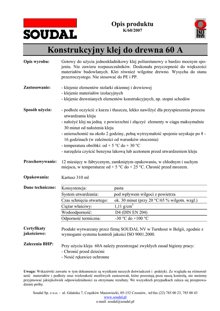Opis produktu K/60/2007 Konstrukcyjny klej do drewna 60 A Opis wyrobu: Gotowy do użycia jednoskładnikowy klej poliuretanowy o bardzo mocnym spojeniu. Nie zawiera rozpuszczalników. Doskonała przyczepność do większości materiałów budowlanych. Klei również wilgotne drewno. Wysycha do stanu przezroczystego. Nie stosować do PE i PP. Zastosowanie: - klejenie elementów stolarki okiennej i drzwiowej - klejenie materiałów izolacyjnych - klejenie drewnianych elementów konstrukcyjnych, np. stopni schodów Sposób użycia: - podłoże oczyścić z kurzu i tłuszczu, lekko nawilżyć dla przyspieszenia procesu utwardzania kleju - nałożyć klej na jedną z powierzchni i złączyć elementy w ciągu maksymalnie 30 minut od nałożenia kleju - unieruchomić na około 2 godziny, pełną wytrzymałość spojenie uzyskuje po 8 16 godzinach (w zależności od warunków otoczenia) - temperatura obróbki: od + 5 °C do + 30 °C - narzędzia czyścić benzyna lakową lub acetonem przed utwardzeniem kleju Przechowywanie: 12 miesięcy w fabrycznym, zamkniętym opakowaniu, w chłodnym i suchym miejscu, w temperaturze od + 5 °C do + 25 °C. Chronić przed mrozem. Opakowania: Kartusz 310 ml Dane techniczne: Konsystencja: System utwardzania: Czas schnięcia otwartego: Ciężar właściwy: Wodoodporność: Odporność termiczna: Certyfikaty jakościowe: Produkt wytwarzany przez firmę SOUDAL NV w Turnhout w Belgii, zgodnie z wymogami systemu kontroli jakości ISO 9001.2000. Zalecenia BHP: Przy użyciu kleju 60A należy przestrzegać zwykłych zasad higieny pracy: - Chronić przed dziećmi - Nosić rękawice ochronne pasta pod wpływem wilgoci z powietrza ok. 30 minut (przy 20 °C/65 % wilgotn. wzgl.) 1,11 g/cm3 D4 (DIN EN 204) -30 °C do +100 °C Uwaga: Wskazówki zawarte w tym dokumencie są wynikami naszych doświadczeń i praktyki. Ze względu na różnorodność materiałów i podłoży oraz wielorakość możliwych zastosowań, które pozostają poza naszą kontrolą, nie możemy przyjmować jakiejkolwiek odpowiedzialności za otrzymane rezultaty. We wszystkich przypadkach zaleca się przeprowadzenie próby. Soudal Sp. z o.o. - ul. Gdańska 7, Cząstków Mazowiecki, 05-152 Czosnów, tel/fax (22) 785 00 23, 785 00 43 www.soudal.pl e-mail: [email protected]