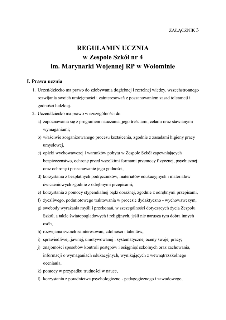 ZAŁĄCZNIK 3 REGULAMIN UCZNIA w Zespole Szkół nr 4 im. Marynarki Wojennej RP w Wołominie I. Prawa ucznia 1. Uczeń/dziecko ma prawo do zdobywania dogłębnej i rzetelnej wiedzy, wszechstronnego rozwijania swoich umiejętności i zainteresowań z poszanowaniem zasad tolerancji i godności ludzkiej. 2. Uczeń/dziecko ma prawo w szczególności do: a) zapoznawania się z programem nauczania, jego treściami, celami oraz stawianymi wymaganiami; b) właściwie zorganizowanego procesu kształcenia, zgodnie z zasadami higieny pracy umysłowej, c) opieki wychowawczej i warunków pobytu w Zespole Szkół zapewniających bezpieczeństwo, ochronę przed wszelkimi formami przemocy fizycznej, psychicznej oraz ochronę i poszanowanie jego godności, d) korzystania z bezpłatnych podręczników, materiałów edukacyjnych i materiałów ćwiczeniowych zgodnie z odrębnymi przepisami; e) korzystania z pomocy stypendialnej bądź doraźnej, zgodnie z odrębnymi przepisami, f) życzliwego, podmiotowego traktowania w procesie dydaktyczno - wychowawczym, g) swobody wyrażania myśli i przekonań, w szczególności dotyczących życia Zespołu Szkół, a także światopoglądowych i religijnych, jeśli nie narusza tym dobra innych osób, h) rozwijania swoich zainteresowań, zdolności i talentów, i) sprawiedliwej, jawnej, umotywowanej i systematycznej oceny swojej pracy; j) znajomości sposobów kontroli postępów i osiągnięć szkolnych oraz zachowania, informacji o wymaganiach edukacyjnych, wynikających z wewnątrzszkolnego oceniania, k) pomocy w przypadku trudności w nauce, l) korzystania z poradnictwa psychologiczno - pedagogicznego i zawodowego, m) korzystania z pomieszczeń szkolnych, sprzętu, środków dydaktycznych, księgozbioru biblioteki podczas zajęć szkolnych i pozalekcyjnych, n) informowania o bieżących postępach i niepowodzeniach dziecka uczącego się w oddziale przedszkolnym. o) znajomości swoich praw: prawo do swobodnego dostępu do dokumentów szkolnych, które go dotyczą p) wpływania na życie szkoły przez działalność samorządową q) do ochrony przed arbitralną lub bezprawną ingerencją w życie prywatne, rodzinne i korespondencyjne, r) do zapewnienia wolności ochrony tajemnicy komunikowania się, s) do ochrony danych osobowych, t) do ochrony zdrowia i równego dostępu do świadczeń opieki zdrowotnej, u) do ochrony przed wyzyskiem ekonomicznym lub wykonywaniem niebezpiecznych i szkodliwych prac, a także przed wszelkimi innymi formami wyzysku naruszającymi jego dobro, v) do swobodnego zrzeszania się zgodnie ze statutem szkoły, w) do wydawania i redagowania gazety szkolnej, x) do równego traktowania wobec prawa, y) do ochrony przed bezprawnymi zamachami na jego honor i reputację w tym żądania sprostowania oraz usunięcia informacji nieprawdziwych dotyczących jego osoby, z) organizowania działalności kulturalnej, oświatowej, sportowej oraz rozrywkowej zgodnie z własnymi potrzebami i możliwościami organizacyjnymi szkoły w porozumieniu z Dyrektorem; aa) organizowania życia szkolnego umożliwiającego zachowanie właściwych proporcji między wysiłkiem szkolnym a możliwością rozwijania i zaspokajania własnych zainteresowań; bb) uczestniczenia w zajęciach pozalekcyjnych; cc) dostosowania treści, metod i organizacji nauczania do jego możliwości oraz do specjalnych form pracy dydaktycznej i indywidualnych programów nauczania 3. W przypadku naruszenia praw ucznia, uczeń może złożyć skargę do pedagoga szkolnego, który zobowiązany jest w porozumieniu z członkiem Dyrekcji szkoły do wyjaśnienia sprawy. II. Obowiązki ucznia 1. Uczeń zobowiązany jest do systematycznego i aktywnego uczestniczenia w zajęciach lekcyjnych i życiu szkoły oraz do zdobywania wiedzy. 2. W szczególności do obowiązków ucznia należy: (nie dotyczy oddziałów przedszkolnych) a) postępowanie zgodne z zasadami tolerancji, b) przestrzeganie zasad kultury współżycia w odniesieniu do kolegów, nauczycieli i innych pracowników Zespołu Szkół, c) realizowanie przyjętych na siebie zobowiązań, d) godne reprezentowanie klasy i szkoły, e) przestrzeganie zasad bezpieczeństwa, f) dbanie o ład, porządek, higienę oraz mienie wspólne i osobiste; g) dbanie o środowisko naturalne, h) podporządkowanie się zarządzeniom Dyrektora, Rady Pedagogicznej, Rady Rodziców, Rady Szkoły, Samorządu Uczniowskiego; i) przestrzeganie przepisów obowiązujących w Zespole Szkół, j) rekompensowanie wyrządzonych szkód, k) usprawiedliwianie każdorazowej nieobecności w sposób określony w statucie szkoły. l) punktualne przychodzenie na zajęcia, m) dbałość o bezpieczeństwo i zdrowie własne oraz swoich kolegów, uczeń nie pali tytoniu, nie pije alkoholu nie używa środków odurzających, prowadzi aktywny prozdrowotny styl życia, n) dbałość o swój estetyczny wygląd zewnętrzny, godny mienia ucznia, stosownie do swego wieku i ogólnie przyjętych norm społecznych, o) noszenie stroju galowego na wszystkie uroczystości szkolne, p) włączanie się, w miarę swoich możliwości w realizację zadań podejmowanych przez Organa Zespołu Szkół. q) uczestniczenie w zajęciach edukacyjnych, przygotowywanie się do nich oraz właściwe zachowanie w ich trakcie, polegające w szczególności na: 1. obecności na zajęciach. 2. odrabianiu zadanych przez nauczyciela prac, 3. przynoszeniu podręczników, pomocy i materiałów wskazanych przez nauczyciela, 4. prowadzenie zeszytów przedmiotowych w obowiązujący sposób 5. zachowaniu umożliwiającym sobie i innym uczniom pełne uczestnictwo w zajęciach III. Zasady usprawiedliwiania nieobecności 1. Zasady usprawiedliwiania nieobecności. Ustala się następujący sposób usprawiedliwiania nieobecności uczniów na zajęciach: a) usprawiedliwienie ma formę pisemną, zawiera datę wpłynięcia, imię i nazwisko ucznia, klasę, określenie czasu nieobecności ucznia w szkole, wskazanie przyczyny nieobecności oraz cz