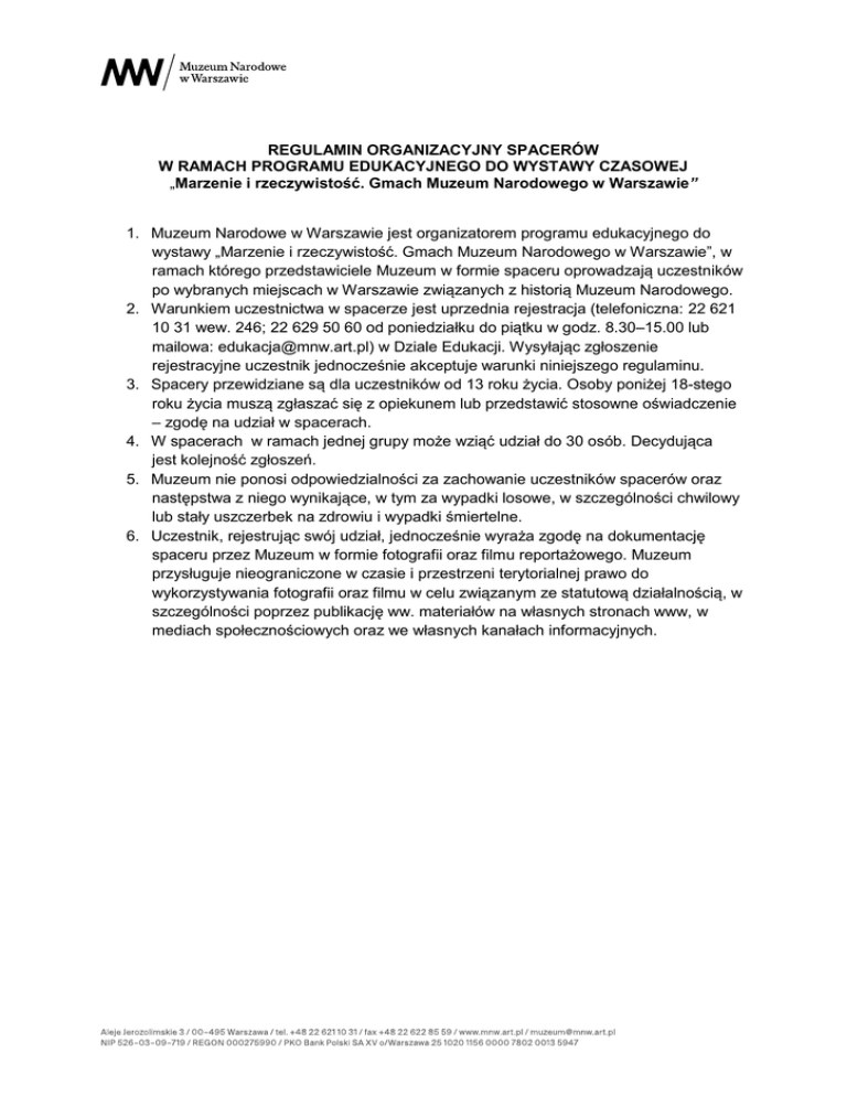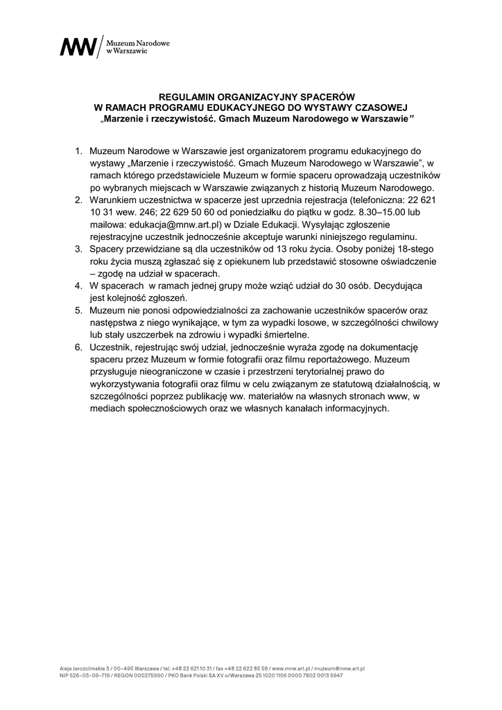 REGULAMIN ORGANIZACYJNY SPACERÓW W RAMACH PROGRAMU EDUKACYJNEGO DO WYSTAWY CZASOWEJ „Marzenie i rzeczywistość. Gmach Muzeum Narodowego w Warszawie” 1. Muzeum Narodowe w Warszawie jest organizatorem programu edukacyjnego do wystawy „Marzenie i rzeczywistość. Gmach Muzeum Narodowego w Warszawie”, w ramach którego przedstawiciele Muzeum w formie spaceru oprowadzają uczestników po wybranych miejscach w Warszawie związanych z historią Muzeum Narodowego. 2. Warunkiem uczestnictwa w spacerze jest uprzednia rejestracja (telefoniczna: 22 621 10 31 wew. 246; 22 629 50 60 od poniedziałku do piątku w godz. 8.30–15.00 lub mailowa: [email protected]) w Dziale Edukacji. Wysyłając zgłoszenie rejestracyjne uczestnik jednocześnie akceptuje warunki niniejszego regulaminu. 3. Spacery przewidziane są dla uczestników od 13 roku życia. Osoby poniżej 18-stego roku życia muszą zgłaszać się z opiekunem lub przedstawić stosowne oświadczenie – zgodę na udział w spacerach. 4. W spacerach w ramach jednej grupy może wziąć udział do 30 osób. Decydująca jest kolejność zgłoszeń. 5. Muzeum nie ponosi odpowiedzialności za zachowanie uczestników spacerów oraz następstwa z niego wynikające, w tym za wypadki losowe, w szczególności chwilowy lub stały uszczerbek na zdrowiu i wypadki śmiertelne. 6. Uczestnik, rejestrując swój udział, jednocześnie wyraża zgodę na dokumentację spaceru przez Muzeum w formie fotografii oraz filmu reportażowego. Muzeum przysługuje nieograniczone w czasie i przestrzeni terytorialnej prawo do wykorzystywania fotografii oraz filmu w celu związanym ze statutową działalnością, w szczególności poprzez publikację ww. materiałów na własnych stronach www, w mediach społecznościowych oraz we własnych kanałach informacyjnych.