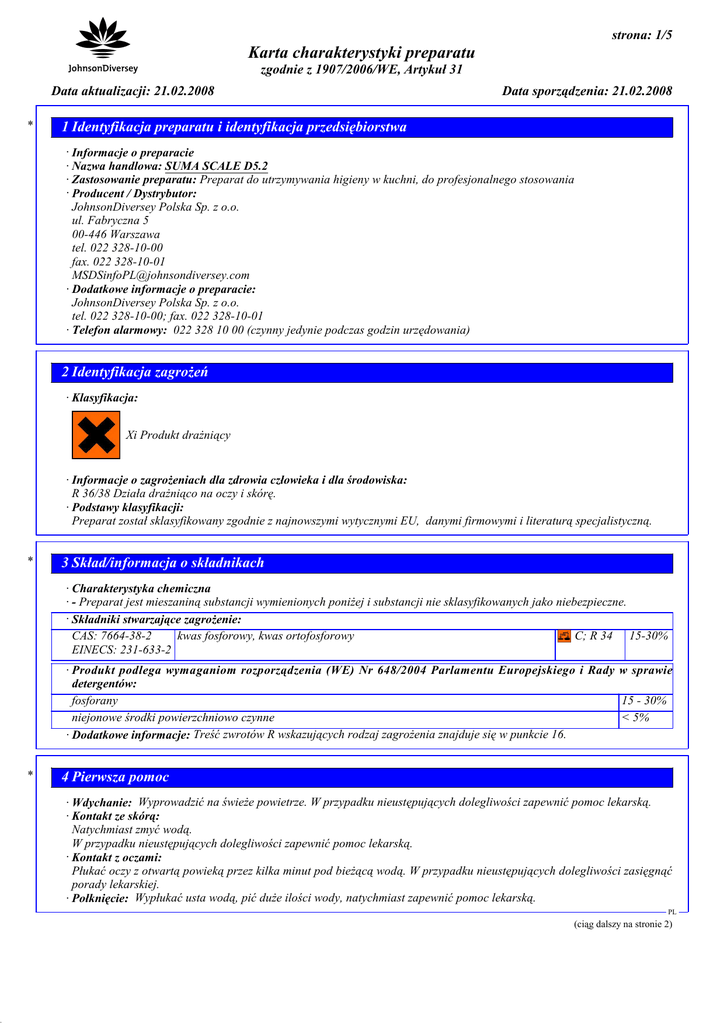 DR strona: 1/5 Karta charakterystyki preparatu zgodnie z 1907/2006/WE, Artykuł 31 Data aktualizacji: 21.02.2008 * Data sporządzenia: 21.02.2008 1 Identyfikacja preparatu i identyfikacja przedsiębiorstwa · Informacje o preparacie · Nazwa handlowa: SUMA SCALE D5.2 · Zastosowanie preparatu: Preparat do utrzymywania higieny w kuchni, do profesjonalnego stosowania · Producent / Dystrybutor: JohnsonDiversey Polska Sp. z o.o. ul. Fabryczna 5 00-446 Warszawa tel. 022 328-10-00 fax. 022 328-10-01 [email protected] · Dodatkowe informacje o preparacie: JohnsonDiversey Polska Sp. z o.o. tel. 022 328-10-00; fax. 022 328-10-01 · Telefon alarmowy: 022 328 10 00 (czynny jedynie podczas godzin urzędowania) 2 Identyfikacja zagroŜeń · Klasyfikacja: Xi Produkt draŜniący · Informacje o zagroŜeniach dla zdrowia człowieka i dla środowiska: R 36/38 Działa draŜniąco na oczy i skórę. · Podstawy klasyfikacji: Preparat został sklasyfikowany zgodnie z najnowszymi wytycznymi EU, danymi firmowymi i literaturą specjalistyczną. * 3 Skład/informacja o składnikach · Charakterystyka chemiczna · - Preparat jest mieszaniną substancji wymienionych poniŜej i substancji nie sklasyfikowanych jako niebezpieczne. · Składniki stwarzające zagroŜenie: CAS: 7664-38-2 kwas fosforowy, kwas ortofosforowy C; R 34 15-30% EINECS: 231-633-2 · Produkt podlega wymaganiom rozporządzenia (WE) Nr 648/2004 Parlamentu Europejskiego i Rady w sprawie detergentów: fosforany 15 - 30% niejonowe środki powierzchniowo czynne < 5% · Dodatkowe informacje: Treść zwrotów R wskazujących rodzaj zagroŜenia znajduje się w punkcie 16. * 4 Pierwsza pomoc · Wdychanie: Wyprowadzić na świeŜe powietrze. W przypadku nieustępujących dolegliwości zapewnić pomoc lekarską. · Kontakt ze skórą: Natychmiast zmyć wodą. W przypadku nieustępujących dolegliwości zapewnić pomoc lekarską. · Kontakt z oczami: Płukać oczy z otwartą powieką przez kilka minut pod bieŜącą wodą. W przypadku nieustępujących dolegliwości zasięgnąć porady lekarskiej. · Połknięcie: Wypłukać usta wodą, pić duŜe ilości wody, natychmiast zapewnić pomoc lekarską. PL (ciąg dalszy na stronie 2) DR strona: 2/5 Karta charakterystyki preparatu zgodnie z 1907/2006/WE, Artykuł 31 Data aktualizacji: 21.02.2008 Data sporządzenia: 21.02.2008 Nazwa handlowa: SUMA SCALE D5.2 (ciąg dalszy od strony 1) * 5 Postępowanie w przypadku poŜaru · Zalecane środki gaśnicze: CO2, proszek gaśniczy lub woda. Większy poŜar gasić strumieniem wody lub pianą odporną na działanie alkoholu. · Środki ochrony indywidualnej straŜaków: : śadne specjalne środki nie są konieczne. * 6 Postępowanie w przypadku niezamierzonego uwolnienia do środowiska · Indywidualne środki ostroŜności: Nie są wymagane. · Środki ostroŜności dotyczące ochrony środowiska: Zapobiec przenikaniu do ścieków, wód powierzchniowych i wód gruntowych. · Metody oczyszczania: Zebrać za pomocą materiału wiąŜącego ciecze (piasek, ziemia okrzemkowa, materiał wiąŜący uniwersalny, trociny). Zebrany materiał usunąć zgodnie z wytycznymi w punkcie 13. Zanieczyszczone powierzchnie spłukać wodą. * 7 Postępowanie z preparatem i jego magazynowanie · 1. Postępowanie z preparatem: · Informacje dotyczące bezpiecznego postępowania: Podczas pracy z preparatem przestrzegać ogólnie przyjętych zasad BHP obowiązujących przy pracy z chemikaliami. · Informacje dotyczące bezpieczeństwa poŜarowego i wybuchowego: śadne szczególne środki ostroŜności nie są wymagane. · 2. Magazynowanie: · Wymagania dotyczące pomieszczeń magazynowych i opakowań: Magazynować tylko w oryginalnych opakowaniach. Zgodnie z lokalnym prawem. · Informacje dotyczące wspólnego magazynowania: Zgodnie z lokalnym prawem. Nie magazynować wspólnie z alkaliami. · Dodatkowe informacje dotyczące warunków magazynowania: Brak. * 8 Kontrola naraŜenia i środki ochrony indywidualnej · Wartości graniczne naraŜenia: · Preparat zawiera składniki wymagających kontroli stęŜenia w środowisku pracy: 7664-38-2 kwas fosforowy, kwas ortofosforowy NDS NDSCh: 2 mg/m3 NDS: 1 mg/m3 · Dodatkowe informacje: Podstawę stanowią aktualnie obowiązujące wykazy. · 2. Kontrola naraŜenia · 2.1. Kontrola naraŜenia w miejscu pracy: Trzymać z dala od produktów spoŜywczych, napojów i pasz. OdzieŜ zanieczyszczoną preparatem natychmiast zdjąć Myć ręce przed przerwą i po pracy z preparatem. Unikać kontaktu z oczami i skórą. · a) Ochrona dróg oddechowych: Środki ochrony indywidualnej nie są wymagane. Nalezy jednak unikać wdychania pyłów, oparów i aerozoli preparatu. · b) Ochrona rąk: Rękawice ochronne (ciąg dalszy na stronie 3) PL DR strona: 3/5 Karta charakterystyki preparatu zgodnie z 1907/2006/WE, Artykuł 31 Data aktualizacji: 21.02.2008 Data sporządzenia: 21.02.2008 Nazwa handlowa: SUMA SCALE D5.2 (ciąg dalszy od strony 2) Materiał, z którego wykonane są rękawice musi być nieprzepuszczalny i odporny na działanie preparatu. · Materiał, z którego powinny być wykonane rękawice: Guma nitrylowa, NBR · Czas przenikania dla materiału, z którego wykonane są rękawice: Od producenta rękawic naleŜy uzyskać dokładną informację o czasie przenikania i go przestrzegać. · c) Ochrona oczu: W przypadku wystąpienia ryzyka chlapnięcia do oczu stęŜonego preparatu zaleca się nosić okulary ochronne. * 9 Właściwości fizyczne i chemiczne · 1. Informacje ogólne Postać: Kolor: Zapach: Temperatura topnienia: Temperatura wrzenia: · Temperatura zapłonu: · Temperatura zapłonu: · Temperatura samozapłonu: · Właściwości wybuchowe: · PręŜność pary: · Gęstość w 20°C: · Rozpuszczalność w: wodzie: · Odczyn pH w 20°C: Ciecz Przeźroczysty Charakterystyczny Nie określono. Nie dotyczy. Nie stosuje się. nie określono Nie ulega samozapłonowi. Preparat nie jest wybuchowy. nie określono 1,113 g/cm3 bez ograniczeń. 1,0 · Wspó