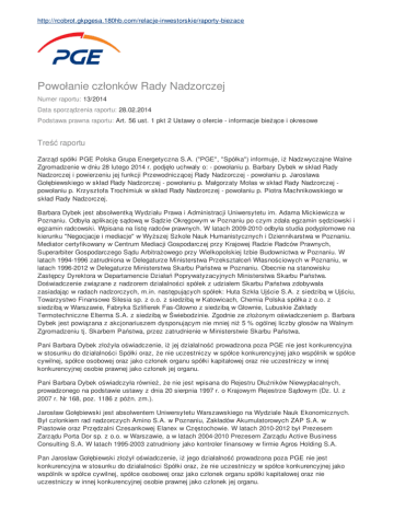 Zgromadzenie w dniu 28 lutego 2014 r. podjęło uchwały o: - powołaniu p. Barbary Dybek w skład Rady