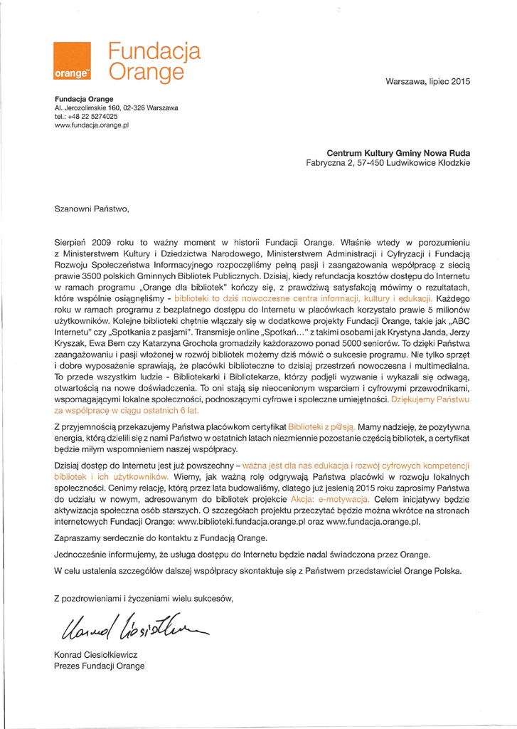 Fundacja Orange Warszawa, lipiec 2015 Fundacja Orange Al. Jerozolimskie 160, 02-326 Warszawa tel.: +48225274025 www.fundacja.orange.pl Centrum Kultury Gminy Nowa Ruda Fabryczna 2, 57-450 Ludwikowice Kłodzkie Szanowni Państwo, Sierpień 2009 roku to ważny moment w historii Fundacji Orange. Właśnie wtedy w porozumieniu z Ministerstwem Kultury i Dziedzictwa Narodowego, Ministerstwem Administracji i Cyfryzacji i Fundacją Rozwoju Społeczeństwa Informacyjnego rozpoczęliśmy pełną pasji i zaangażowania współpracę z siecią prawie 3500 polskich Gminnych Bibliotek Publicznych. Dzisiaj, kiedy refundacja kosztów dostępu do Internetu w ramach programu "Orang e dla bibliotek" kończy się, z prawdziwą satysfakcją mówimy o rezultatach, które wspólnie osiągnęliśmy - biblioteki to dziś nowoczesne centra informacji, kultury i edukacji. Każdego roku w ramach programu z bezpłatnego dostępu do Internetu w placówkach korzystało prawie 5 milionów użytkowników. Kolejne biblioteki chętnie włączały się w dodatkowe projekty Fundacji Orange, takie jak "ABC Internetu" czy "Spotkania z pasjami". Transmisje online "Spotkań ... " z takimi osobami jak Krystyna Janda, Jerzy Kryszak, Ewa Bem czy Katarzyna Grochola gromadziły każdorazowo ponad 5000 seniorów. To dzięki Państwa zaangażowaniu i pasji włożonej w rozwój bibliotek możemy dziś mówić o sukcesie programu. Nie tylko sprzęt i dobre wyposażenie sprawiają, że placówki biblioteczne to dzisiaj przestrzeń nowoczesna i multimedialna. To przede wszystkim ludzie - Bibliotekarki i Bibliotekarze, którzy podjęli wyzwanie i wykazali się odwagą, otwartością na nowe doświadczenia. To oni stają się nieocenionym wsparciem i cyfrowymi przewodnikami, wspomagającymi lokalne społeczności, podnoszącymi cyfrowe i społeczne umiejętności. Dziękujemy Państwu za współpracę w ciągu ostatnich 6 lat. Z przyjemnością przekazujemy Państwa placówkom certyfikat Biblioteki z p@sją. Mamy nadzieję, że pozytywna energia, którą dzielili się z nami Państwo w ostatnich latach niezmiennie pozostanie częścią bibliotek, a certyfikat będzie miłym wspomnieniem naszej współpracy. Dzisiaj dostęp do Internetu jest już powszechny - ważna jest dla nas edukacja i rozwój cyfrowych kompetencji bibliotek i ich użytkowników. Wiemy, jak ważną rolę odgrywają Państwa placówki w rozwoju lokalnych społeczności. Cenimy relację, którą przez lata budowaliśmy, dlatego już jesienią 2015 roku zaprosimy Państwa do udziału w nowym, adresowanym do bibliotek projekcie Akcja: e-motywacja. Celem inicjatywy będzie aktywizacja społeczna osób starszych. O szczegółach projektu przeczytać będzie można wkrótce na stronach internetowych Fundacji Orange: www.biblioteki.fundacja.orange.pl oraz www.fundacja.orange.pl. Zapraszamy serdecznie do kontaktu z Fundacją Orange. Jednocześnie informujemy, że usługa dostępu do Internetu będzie nadal świadczona przez Orange. W celu ustalenia szczegółów dalszej współpracy skontaktuje się z Państwem przedstawiciel Orange Polska. Z pozdrowieniami i życzeniami wielu sukcesów, Konrad Ciesiołkiewicz Prezes Fundacji Orange