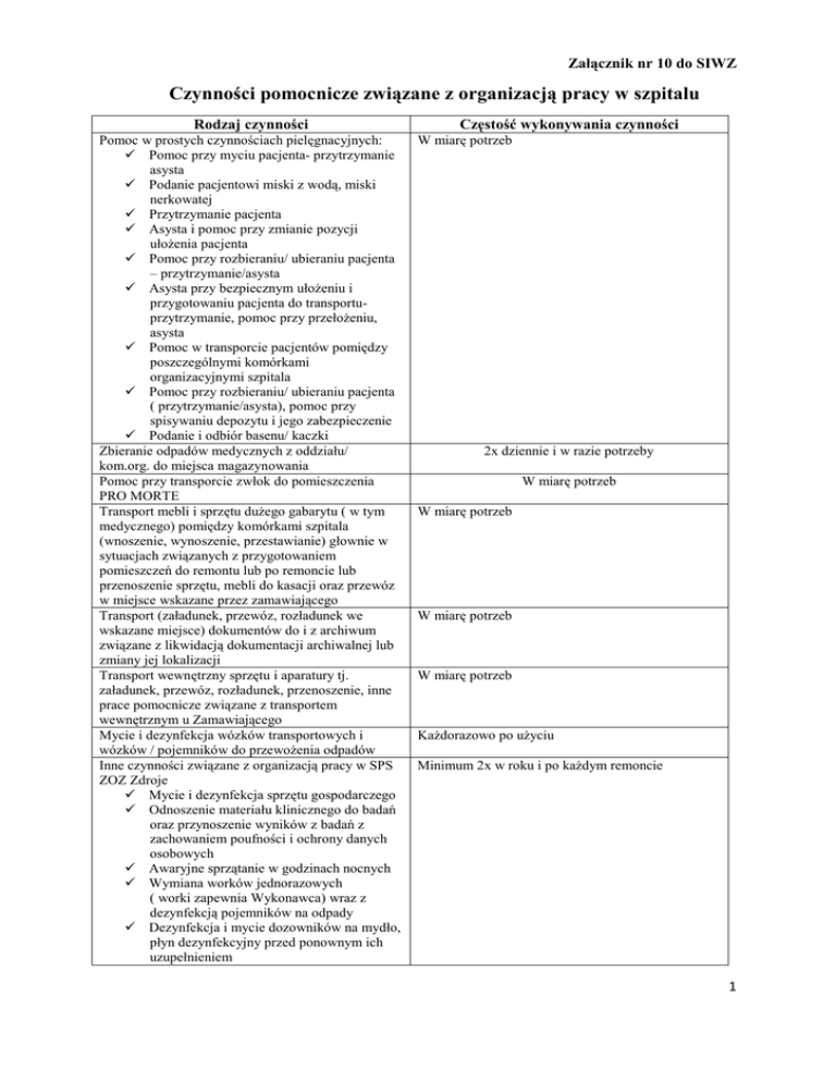 Załącznik nr 10 do SIWZ Czynności pomocnicze związane z organizacją pracy w szpitalu Rodzaj czynności Pomoc w prostych czynnościach pielęgnacyjnych: Pomoc przy myciu pacjenta- przytrzymanie asysta Podanie pacjentowi miski z wodą, miski nerkowatej Przytrzymanie pacjenta Asysta i pomoc przy zmianie pozycji ułoŜenia pacjenta Pomoc przy rozbieraniu/ ubieraniu pacjenta – przytrzymanie/asysta Asysta przy bezpiecznym ułoŜeniu i przygotowaniu pacjenta do transportuprzytrzymanie, pomoc przy przełoŜeniu, asysta Pomoc w transporcie pacjentów pomiędzy poszczególnymi komórkami organizacyjnymi szpitala Pomoc przy rozbieraniu/ ubieraniu pacjenta ( przytrzymanie/asysta), pomoc przy spisywaniu depozytu i jego zabezpieczenie Podanie i odbiór basenu/ kaczki Zbieranie odpadów medycznych z oddziału/ kom.org. do miejsca magazynowania Pomoc przy transporcie zwłok do pomieszczenia PRO MORTE Transport mebli i sprzętu duŜego gabarytu ( w tym medycznego) pomiędzy komórkami szpitala (wnoszenie, wynoszenie, przestawianie) głownie w sytuacjach związanych z przygotowaniem pomieszczeń do remontu lub po remoncie lub przenoszenie sprzętu, mebli do kasacji oraz przewóz w miejsce wskazane przez zamawiającego Transport (załadunek, przewóz, rozładunek we wskazane miejsce) dokumentów do i z archiwum związane z likwidacją dokumentacji archiwalnej lub zmiany jej lokalizacji Transport wewnętrzny sprzętu i aparatury tj. załadunek, przewóz, rozładunek, przenoszenie, inne prace pomocnicze związane z transportem wewnętrznym u Zamawiającego Mycie i dezynfekcja wózków transportowych i wózków / pojemników do przewoŜenia odpadów Inne czynności związane z organizacją pracy w SPS ZOZ Zdroje Mycie i dezynfekcja sprzętu gospodarczego Odnoszenie materiału klinicznego do badań oraz przynoszenie wyników z badań z zachowaniem poufności i ochrony danych osobowych Awaryjne sprzątanie w godzinach nocnych Wymiana worków jednorazowych ( worki zapewnia Wykonawca) wraz z dezynfekcją pojemników na odpady Dezynfekcja i mycie dozowników na mydło, płyn dezynfekcyjny przed ponownym ich uzupełnieniem Częstość wykonywania czynności W miarę potrzeb 2x dziennie i w razie potrzeby W miarę potrzeb W miarę potrzeb W miarę potrzeb W miarę potrzeb KaŜdorazowo po uŜyciu Minimum 2x w roku i po kaŜdym remoncie 1 Mycie i uzupełnienie dozowników na papier toaletowy i ręczniki papierowe Zdejmowanie pościeli z łóŜka pacjenta po jego wypisie Wynoszenie misek, pojemników do dobowej zbiórki moczu, basenów, kaczek, z Sali chorych oraz ich dekontaminacja łącznie z obsługą płuczko-dezynfektora Czyszczenie rolet, wertikali, Ŝaluzji wewnętrznych i rolet zewnętrznych Sprzątanie tuneli dezynsekcja deratyzacja Szatnie oddziałowe Mycie i dezynfekcja wind towarowo-osobowych Mycie wysokościowe okien nieotwieranych ( p/poŜ) na elewacjach, kondygnacjach, przeszkleń, doświetleń, parapetów zewnętrznych, krat 1x dziennie i w marę potrzeb 4x w roku oraz w miarę potrzeb zamawiającego 4x w roku oraz w miarę potrzeb zamawiającego Sprzątanie 2x w tygodniu i w miarę potrzeb 2x dziennie i kaŜdorazowo po przewiezieniu zwłok, brudnej bielizny, odpadów i w razie potrzeby 2x w roku i w miarę potrzeby 2