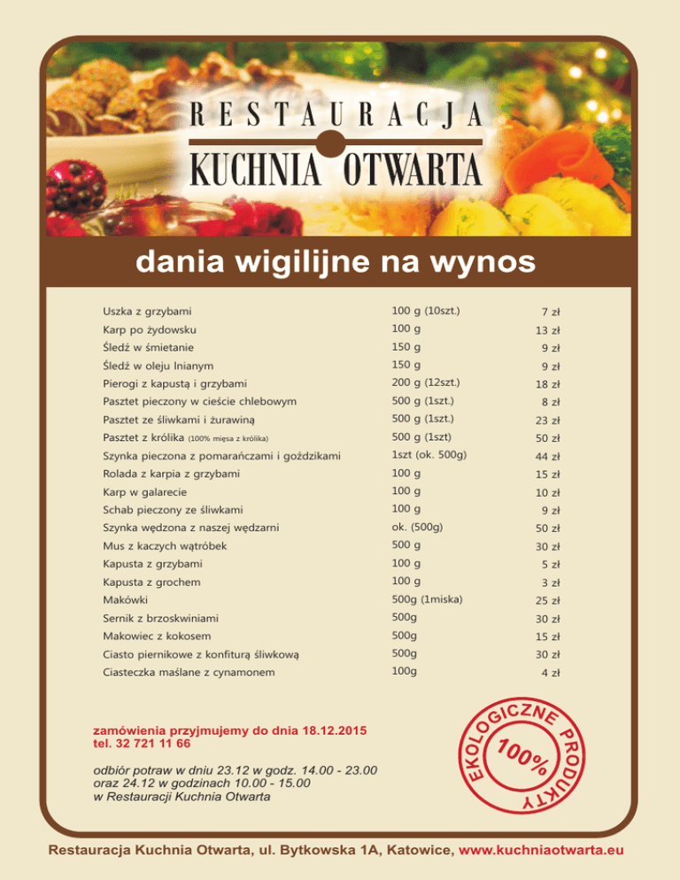 Uszka z grzybami 100 g (10szt.) Karp po ¿ydowsku 100 g 13 z³ ŒledŸ w œmietanie 150 g 9 z³ ŒledŸ w oleju lnianym 150 g Pierogi z kapust¹ i grzybami 200 g (12szt.) 7 z³ 9 z³ 18 z³ Pasztet pieczony w cieœcie chlebowym 500 g (1szt.) 8 z³ Pasztet ze œliwkami i ¿urawin¹ 500 g (1szt.) 23 z³ 500 g (1szt) 50 z³ Szynka pieczona z pomarañczami i goŸdzikami 1szt (ok. 500g) 44 z³ Rolada z karpia z grzybami 100 g 15 z³ Karp w galarecie 100 g 10 z³ Schab pieczony ze œliwkami 100 g Szynka wêdzona z naszej wêdzarni ok. (500g) 50 z³ Mus z kaczych w¹tróbek 500 g 30 z³ Kapusta z grzybami 100 g 5 z³ Kapusta z grochem 100 g Makówki 500g (1miska) 25 z³ Pasztet z królika (100% miêsa z królika) 9 z³ 3 z³ Sernik z brzoskwiniami 500g 30 z³ Makowiec z kokosem 500g 15 z³ Ciasto piernikowe z konfitur¹ œliwkow¹ 500g 30 z³ Ciasteczka maœlane z cynamonem 100g 4 z³ zamówienia przyjmujemy do dnia 18.12.2015 tel. 32 721 11 66 odbiór potraw w dniu 23.12 w godz. 14.00 - 23.00 oraz 24.12 w godzinach 10.00 - 15.00 w Restauracji Kuchnia Otwarta Restauracja Kuchnia Otwarta, ul. Bytkowska 1A, Katowice, www.kuchniaotwarta.eu