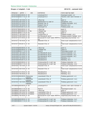 Wyższa Szkoła Turystyki i Hotelarstwa Grupa: e I stopień - I rok data/grupa wykładowca nazwa zajęć (typ zajęć) 2015/01/26 08:00:09:30– A - 03 2015/01/26 09:45:11:15– A - 03 Lemańczyk M. dr Lemańczyk M. dr 2015/01/26 2015/01/26 2015/01/26 2015/01/26 2015/01/26 11:30:13:00– 13:30:15:00– 15:15:16:45– 17:00:18:30– 18:45:20:15– A - 03 A - 03 A - 03 A - 03 A - 03 x Buza mgr Bohdanowicz H. st. wykł. dr Winiarski J doc. dr Drajska E. doc. dr Kierończyk P dr Socjologia turystyki - e () Filozofia z elem. etyki w biznesie -w () język I () Zarządzanie - z/e () Podstawy informatyki - z/e () Ekonomia -z/e () Podstawy prawa - z () 2015/01/27 2015/01/27 2015/01/27 2015/01/27 2015/01/27 2015/01/27 08:00:09:30– 08:00:09:30– 09:45:11:15– 11:30:13:00– 13:30:15:00– 15:15:16:45– A - 03 A - 27 lab. A - 03 A - 03 A - 03 A - 03 2015/01/27 17:00:18:30– A - 03 x Buza mgr x Ratajski mgr x Buza mgr Łuczak M Doc. dr Gut Winiarska M. adj. dr Boruszczak M. dr prof. nadzw. WSTiH w Gd Olszewski A Doc. dr 2015/01/27 18:45:20:15– A - 03 Olszewski A Doc. dr 2015/01/28 2015/01/28 2015/01/28 2015/01/28 2015/01/28 2015/01/28 2015/01/28 2015/01/28 x Buza mgr x Ratajski mgr Kania dr Gut Winiarska M. adj. dr Gut Winiarska M. adj. dr Gut Winiarska M. adj. dr Wierzbicka B dr Wierzbicka B dr język I () Język II () Psychologia turystyki - w () Ochrona środowiska - w () Ochrona środowiska - ćw () Ochrona środowiska - ćw () Marketing - w () Marketing - ćw () 2015/01/29 08:00:09:30– A - 03 2015/01/29 09:45:11:15– A - 03 2015/01/29 11:30:13:00– A - 03 Chroboczyńska M. st. wykł. mgr Chroboczyńska M. st. wykł. mgr Olszewski A Doc. dr 2015/01/29 13:30:15:00– A - 03 Olszewski A Doc. dr 2015/01/29 15:15:16:45– A - 03 2015/01/29 17:00:18:30– A - 03 Wierzbicka B dr Wierzbicka B dr Podstawy hotelarstwa - w () Podstawy hotelarstwa - ćw () Prawo turyst i ubezpieczenia w tur-ćw () Prawo turyst i ubezpieczenia w tur-ćw () Marketing - ćw () Marketing - ćw () 2015/01/30 08:00:09:30– Restauracja Gdańska 2015/01/30 09:45:11:15– Restauracja Gdańska 2015/01/30 11:30:13:00– Restauracja Gdańska 2015/06/08 08:00:09:30– A - 03 Lewandowski H Doc. dr Podstawy gastronomii - w () Lewandowski H Doc. dr Podstawy gatsronomii - ćw () Lewandowski H Doc. dr Podstawy gatsronomii - ćw () 2015/06/08 2015/06/08 2015/06/08 2015/06/08 2015/06/08 godzina 2014/15 – semestr letni 08:00:09:30– 08:00:09:30– 09:45:11:15– 11:30:13:00– 13:30:15:00– 15:15:16:45– 17:00:18:30– 18:45:20:15– 09:45:11:15– 11:30:13:00– 13:30:15:00– 15:15:16:45– 17:00:18:30– sala A - 03 A - 27 lab. A - 03 A - 03 A - 03 A - 03 A - 03 A - 03 A - 03 A - 03 G - 04 katedra G - 04 katedra A - 03 2015/06/09 08:00:09:30– A - 03 2015/06/09 09:45:11:15– A - 03 str. 1 //grupae I stopień - I rok.html język I () Język II () język I () Podstawy turystyki - z/e () Podstawy anatomii i fizjologii - z/e () Organizacja pracy biurowej - w () Prawo turyst i ubezpieczenia w tur-w () Prawo turyst i ubezpieczenia w tur-ćw () Lemańczyk M. dr Filozofia z elem. etyki w biznesie -w () Kania dr Psychologia turystyki - w () x Buza mgr język I () Lewandowski H Doc. dr Podstawy gatsronomii - ćw () Lewandowski H Doc. dr Podstawy gastronomii - w () Boruszczak M. dr prof. nadzw. WSTiH w Organizacja pracy biurowej - w () Gd Chroboczyńska M. st. wykł. mgr Podstawy hotelarstwa - ćw () Chroboczyńska M. st. wykł. mgr Podstawy hotelarstwa - w () wersja z: 28 maja 2015/godz: 9:54 (plan.xml/Thu May 28 09:53:55 2015 ) Wyższa Szkoła Turystyki i Hotelarstwa Grupa: e I stopień - I rok data/grupa godzina 2015/06/09 2015/06/09 2015/06/09 2015/06/09 11:30:13:00– 11:30:13:00– 13:30:15:00– 15:15:16:45– 2014/15 – semestr letni wykładowca nazwa zajęć (typ zajęć) x Buza mgr x Ratajski mgr Gut Winiarska M. adj. dr Gut Winiarska M. adj. dr język I () Język II () Ochrona środowiska - ćw () Ochrona środowiska - w () 2015/06/10 08:00:09:30– A - 03 2015/06/10 09:45:11:15– A - 03 2015/06/10 11:30:13:00– A - 03 Wierzbicka B dr Wierzbicka B dr Olszewski A Doc. dr 2015/06/10 13:30:15:00– A - 03 Olszewski A Doc. dr Marketing - w () Marketing - ćw () Prawo turyst i ubezpieczenia w tur-w () Prawo turyst i ubezpieczenia w tur-ćw () str. 2 sala A - 03 G - 27 lab. A - 03 A - 03 //grupae I stopień - I rok.html wersja z: 28 maja 2015/godz: 9:54 (plan.xml/Thu May 28 09:53:55 2015 ) Wyższa Szkoła Turystyki i Hotelarstwa Grupa: e I stopień - II rok data/grupa godzina 2015/01/26 2015/01/26 2015/01/26 2015/01/26 2015/01/26 2015/01/26 08:00:09:30– 09:45:11:15– 11:30:13:00– 13:30:15:00– 15:15:16:45– 18:45:20:15– 2015/01/27 2015/01/27 2015/01/27 2015/01/27 2015/01/27 2015/01/27 08:00:09:30– 09:45:11:15– 11:30:13:00– 13:30:15:00– 15:15:16:45– 17:00:18:30– 2014/15 – semestr letni sala wykładowca nazwa zajęć (typ zajęć) A - 10 G - 04 katedra A - 10 A - 10 A - 10 A - 10 x Kornas mgr Lewandowski H Doc. dr Bohdanowicz H. st. wykł. dr Białk A. doc. dr Ratkowski W Prof. dr hab. Olszewski A Doc. dr język I () Gastronomia - z () Negocjacje - z/e () Ekonomika turystyki - z/e () Rekreacja - z/e () Bankowość i finanse -z () A - 10 A - 27 lab. A - 10 A - 10 A - 10 A - 10 Chroboczyńska M. st. wykł. mgr Nierzwicki W dr hab.prof.nadz. WSTiH x Kornas mgr x Kornas mgr Olszewski A Doc. dr Chomka M. doc. dr Hotelarstwo - w () Jakość żywności - z () język I () język I () Podstawy analizy finansowej - w () Ekonomika turystyki w (Turystyka morska) Podstawy SPA i Wellness - () 2015/01/27 18:45:20:15– A - 10 Koreńczuk A st. wykł. mgr 2015/01/28 08:00:09:30– A - 10 2015/01/28 09:45:11:15– A - 10 x Kornas mgr Lemańczyk M. dr 2015/01/28 2015/01/28 2015/01/28 2015/01/28 2015/01/28 11:30:13:00– 13:30:15:00– 15:15:16:45– 17:00:18:30– 18:45:20:15– A - 10 A - 10 A - 10 A - 10 A - 10 Kania dr Chroboczyńska M. st. wykł. mgr Chroboczyńska M. st. wykł. mgr Malinowska E Dr inż Malinowska E Dr