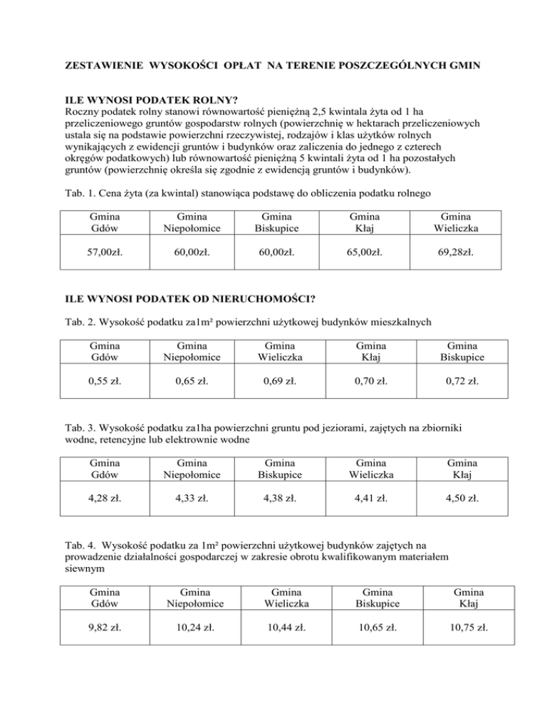 ZESTAWIE IE WYSOKOŚCI OPŁAT A TERE IE POSZCZEGÓL YCH GMI ILE WY OSI PODATEK ROL Y? Roczny podatek rolny stanowi równowartość pieniężną 2,5 kwintala żyta od 1 ha przeliczeniowego gruntów gospodarstw rolnych (powierzchnię w hektarach przeliczeniowych ustala się na podstawie powierzchni rzeczywistej, rodzajów i klas użytków rolnych wynikających z ewidencji gruntów i budynków oraz zaliczenia do jednego z czterech okręgów podatkowych) lub równowartość pieniężną 5 kwintali żyta od 1 ha pozostałych gruntów (powierzchnię określa się zgodnie z ewidencją gruntów i budynków). Tab. 1. Cena żyta (za kwintal) stanowiąca podstawę do obliczenia podatku rolnego Gmina Gdów Gmina Niepołomice Gmina Biskupice Gmina Kłaj Gmina Wieliczka 57,00zł. 60,00zł. 60,00zł. 65,00zł. 69,28zł. ILE WY OSI PODATEK OD IERUCHOMOŚCI? Tab. 2. Wysokość podatku za1m² powierzchni użytkowej budynków mieszkalnych Gmina Gdów Gmina Niepołomice Gmina Wieliczka Gmina Kłaj Gmina Biskupice 0,55 zł. 0,65 zł. 0,69 zł. 0,70 zł. 0,72 zł. Tab. 3. Wysokość podatku za1ha powierzchni gruntu pod jeziorami, zajętych na zbiorniki wodne, retencyjne lub elektrownie wodne Gmina Gdów Gmina Niepołomice Gmina Biskupice Gmina Wieliczka Gmina Kłaj 4,28 zł. 4,33 zł. 4,38 zł. 4,41 zł. 4,50 zł. Tab. 4. Wysokość podatku za 1m² powierzchni użytkowej budynków zajętych na prowadzenie działalności gospodarczej w zakresie obrotu kwalifikowanym materiałem siewnym Gmina Gdów Gmina Niepołomice Gmina Wieliczka Gmina Biskupice Gmina Kłaj 9,82 zł. 10,24 zł. 10,44 zł. 10,65 zł. 10,75 zł. Tab. 5. Wysokość podatku za1m² powierzchni pozostałych gruntów, w tym zajętych na prowadzenie odpłatnej statutowej działalności pożytku publicznego przez organizacje pożytku publicznego Gmina Gdów Gmina Kłaj Gmina Biskupice Gmina Wieliczka 0,25 zł. 0,30 zł. 0,30 zł. 0,34 zł. Gmina Niepołomice 0,35 zł. lub 0,20 zł.* * - za pierwsze 800 m² - 0,35 zł. od 1 m² powierzchni, - za każdy następny metr kwadratowy powyżej 800 m² – 0,20 zł. za 1 m² Tab. 6. Wysokość podatku za 1m² gruntu zajętego pod prowadzenie działalności gospodarczej Gmina Gdów Gmina Kłaj Gmina Wieliczka Gmina Biskupice Gmina Niepołomice 0,75 zł. 0,85 zł. 0,86 zł. 0,86 zł. 0,89 zł. Tab. 7. Wysokość podatku za 1m² powierzchni użytkowej budynków lub ich części związanych z prowadzeniem działalności gospodarczej oraz zajęte na taką działalność Gmina Gdów Gmina Wieliczka Gmina Kłaj Gmina Biskupice Gmina Niepołomice 17,12 zł. 19,67 zł. 19,85 zł. 21,55zł. 22,92zł. Tab. 8. Wysokość podatku za 1m² powierzchni użytkowej budynków związanych z udzielaniem świadczeń zdrowotnych w rozumieniu przepisów o działalności leczniczej, zajętych przez podmioty udzielające tych świadczeń Gmina Niepołomice Gmina Biskupice Gmina Gdów Gmina Wieliczka Gmina Kłaj 4,42 zł. 4,50 zł. 4,53 zł. 4,54 zł. 4,68 zł.