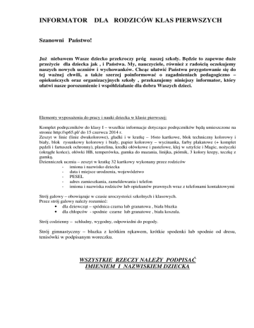 INFORMATOR DLA RODZICÓW KLAS PIERWSZYCH Szanowni Państwo! Już niebawem Wasze dziecko przekroczy próg naszej szkoły. Będzie to zapewne duże przeżycie dla dziecka jak , i Państwa. My, nauczyciele, również z radością oczekujemy naszych nowych uczniów i wychowanków. Chcąc ułatwić Państwu przygotowanie się do tej ważnej chwili, a także szerzej poinformować o zagadnieniach pedagogiczno – opiekuńczych oraz organizacyjnych szkoły , przekazujemy niniejszy informator, który ułatwi nasze porozumienie i współdziałanie dla dobra Waszych dzieci. Elementy wyposażenia do pracy i nauki dziecka w klasie pierwszej: Komplet podręczników do klasy I – wszelkie informacje dotyczące podręczników będą umieszczone na stronie http://sp65.pl/ do 15 czerwca 2014 r. Zeszyt w linie (linie dwukolorowe), gładki i w kratkę – 16sto kartkowe, blok techniczny kolorowy i biały, blok rysunkowy kolorowy i biały, papier kolorowy – wycinanka, farby plakatowe (+ komplet pędzli i fartuszek ochronny), plastelina, kredki ołówkowe i pastelowe, klej w sztyfcie i Magic, nożyczki (okrągłe końce), ołówki HB, temperówka, gumka do mazania, linijka, piórnik, 3 kolory krepy, teczkę z gumką. Dzienniczek ucznia – zeszyt w kratkę 32 kartkowy wykonany przez rodziców - imiona i nazwisko dziecka - data i miejsce urodzenia, województwo - PESEL - adres zamieszkania, zameldowania i telefon - imiona i nazwiska rodziców lub opiekunów prawnych wraz z telefonami kontaktowymi Strój galowy – obowiązuje w czasie uroczystości szkolnych i klasowych. Przez strój galowy należy rozumieć: • dla dziewcząt – spódnica czarna lub granatowa , biała bluzka • dla chłopców - spodnie czarne lub granatowe , biała koszula. Strój codzienny – schludny, wygodny, odpowiedni do pogody. Strój gimnastyczny – bluzka z krótkim rękawem, krótkie spodenki lub spodnie od dresu, tenisówki w podpisanym woreczku. WSZYSTKIE RZECZY NALEŻY PODPISAĆ IMIENIEM I NAZWISKIEM DZIECKA W ramach edukacji wczesnoszkolnej zapewniamy: • • • • naukę języka angielskiego, począwszy od klasy I, naukę języka hiszpańskiego w klasie I od klasy I zajęcia komputerowe w nowocześnie wyposażonej pracowni komputerowej z dostępem do Internetu udział w licznych imprezach, akcjach, konkursach, projektach szkolnych i pozaszkolnych Program praktycznych umiejętności dla ucznia Oprócz zdobywania wiedzy na zajęciach każdy uczeń ma możliwość zdobywania, w ramach zajęć dodatkowych (w miarę upływu lat) następujących umiejętności: 1. Nauka pływania. 2. Karta rowerowa – po ukończeniu 10 lat. 3. Dzieci utalentowane artystycznie i sportowo znajdą możliwość rozwoju w licznych kołach artystycznych i sportowych. 4. Poszerzenie zainteresowań na zajęciach kół przedmiotowych. 5. Obsługa komputera z elementami programowania. 6. Nauka tańców. 7. Kształtowanie wiedzy filmowej i umiejętności aktorskich. Opieka nad dziećmi w szkole. Szkoła zapewnia wszystkie usługi natury opiekuńczej. Są to: zajęcia wyrównawcze i kompensacyjne, logopedyczne, które prowadzą wychowawcy, logopeda, a także pedagog i psycholog szkolny. Pedagog szkolny i psycholog udzielają porad indywidualnych dzieciom i rodzicom. Dzieci napotykające na duże trudności w nauce, kierowane są do badań w Poradni PedagogicznoPsychologicznej (za zgodą rodziców). Opinie poradni są respektowane przez szkołę . Działalność świetlicy W grupie usług wychowawczo – opiekuńczych szkoła dysponuje bardzo sprawnie działającą świetlicą szkolną (od 6.30 do 17.00). Wśród zajęć oferowanych w świetlicy wymienić można: • Zajęcia muzyczne • Zajęcia czytelnicze • Zajęcia plastyczne • Zajęcia ogólnorozwojowe • Zajęcia wspierające uzupełnianie wiedzy bieżącej. Przyprowadzanie i odbieranie dzieci ze świetlicy jest obowiązkiem rodziców lub osób pisemnie przez nich upoważnionych. Stołówka Szkoła dysponuje stołówką. W zakresie opieki lekarskiej szkoła dysponuje wykwalifikowaną pielęgniarką oraz lekarzem stomatologiem. INFORMACJE RÓŻNE 1. Sekretariat szkoły tel.(61 820-10-63 ) czynny jest codziennie od 8:00 – 15:00. 2. Legitymacje otrzymują uczniowie klasy I. 3. Dzieci często gubią i pozostawiają w szkole swoją garderobę. Można ją odebrać u pani woźnej . Pierwszy dzień roku szkolnego - dzieci w strojach galowych wraz z opiekunami spotykają się na sali gimnastycznej - termin i godzina rozpoczęcia roku szkolnego zostanie podanych na stronie internetowej szkoły oraz na drzwiach wejściowych - podczas uroczystości rozpoczęcia dzieci zostaną przydzielone do poszczególnych klas i wychowawców - świetlica przyjmuje zgłoszenia dzieci System kontaktów rodziców ze szkołą: 1. Codziennie można kontaktować się z dyrektorem i wicedyrektorem . 2. W sprawach incydentalnych nauczyciele i wychowawcy przyjmują rodziców przed i po zajęciach. 3. Z wychowawcami świetlicy rodzice mają codzienny kontakt przy odbiorze dziecka. 4. Pedagog szkolny przyjmuje codziennie, a raz w miesiącu w czasie trwania godzin informacyjnych i zebrań. 5. Psycholog przyjmuje trzy razy w tygodniu, a raz w miesiącu w czasie trwania godzin informacyjnych i zebrań. 6. Wszyscy nauczyciele pełnią dyżury raz w miesiącu (godziny informacyjne, zebrania , wywiadówka). 7. Terminy zebrań i godzin informacyjnych zostaną podane 01.09.2011r. 8. Rada Rodziców reprezentuje ogół rodziców uczniów. Rodzice współpracują ze szkołą za jej pośrednictwem, mając możliwości współdecydowania o kierunkach pracy szkoły. 9. Nieobecność dziecka usprawiedliwiają rodzice w dzienniczku lub dostarczają zwolnienie lekarskie. Współdziałanie rodziców ze szkołą: Polega ono przede wszystkim na codziennym interesowaniu się ze strony rodziców postępami dziecka w szkole, rozmowami z nim na ten temat, przeglądaniu zeszytów i dzienniczka, na sprawdzaniu czy zadania domowe zostały odrobione. I